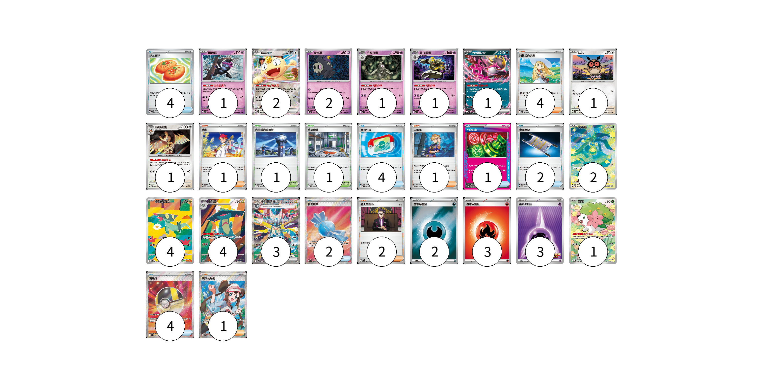牌組構築方案 以此牌組為基礎新構築牌組 顯示卡面 顯示列表 寶可夢卡(24) 1 2 2 1 1 1 1 1 2 4 4 3 1 物品卡(17) 4 4 1 2 2 4 支援者卡(9) 4 1 1 2 1 競技場卡(2) 1 1 能量卡(8) 2 3 3 寶可夢卡(24) 卡牌名稱 張數 卡牌名稱 張數 願增猿 MC 358/742 01 喵喵ex M3 061/080 02 夜巡靈 MC 308/742 02 彷徨夜靈 MC 309/742 01 黑夜魔靈 MC 310/742 01 吉雉雞ex MC 489/742 01 咕咕 MC 572/742 01 貓頭夜鷹 MC 573/742 01 含羞苞 M2a 196/193 02 多龍梅西亞 M2a 211/193 04 多龍奇 M2a 212/193 04 多龍巴魯托ex SV8a 221/187 03 謝米 SV9a 066/063 01 物品卡(17) 卡牌名稱 張數 卡牌名稱 張數 好友寶芬 SV5K 063/071 04 寶可平板 M3 070/080 04 不公印章 MC 633/742 01 夜間擔架 MC 670/742 02 神奇糖果 M1S 082/063 02 高級球 M2a 216/193 04 支援者卡(9) 卡牌名稱 張數 卡牌名稱 張數 莉莉艾的決意 M2a 175/193 04 赤松 MC 696/742 01 白蕾雅 SV7 100/102 01 老大的指令 MC 724/742 02 鳴依的勉勵 M3 107/080 01 競技場卡(2) 卡牌名稱 張數 卡牌名稱 張數 火箭隊的監視塔 M2a 189/193 01 險惡廢墟 M1L 063/063 01 能量卡(8) 卡牌名稱 張數 卡牌名稱 張數 基本【惡】能量 MC DAR 02 基本【火】能量 MC FIR 03 基本【超】能量 SV-P 261/SV-P 03 以此牌組為基礎新構築牌組 牌組編碼 xTWDZV-XjFDIB-rsCHOg copy 列印牌組單 牌組編碼已複製 分享至SNS