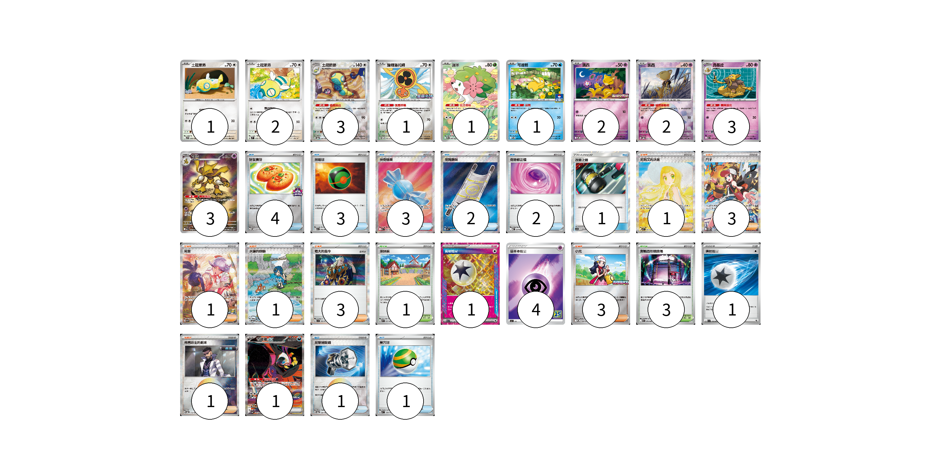 牌組構築方案 以此牌組為基礎新構築牌組 顯示卡面 顯示列表 寶可夢卡(20) 1 2 3 1 1 1 2 2 3 3 1 物品卡(17) 4 3 3 2 2 1 1 1 支援者卡(13) 1 3 1 1 3 3 1 競技場卡(4) 1 3 能量卡(6) 1 4 1 寶可夢卡(20) 卡牌名稱 張數 卡牌名稱 張數 土龍弟弟 SV9 078/100 01 土龍弟弟 SVM 095/175 02 土龍節節 SV8a 130/187 03 旋轉洛托姆 SV-P 146/SV-P 01 謝米 SV9a 066/063 01 可達鴨 SV-P 220/SV-P 01 凱西 M-P 004/M-P 02 凱西 SV8a 057/187 02 勇基拉 M1S 037/063 03 胡地 M1S 071/063 03 吉雉雞ex SV6a 089/064 01 物品卡(17) 卡牌名稱 張數 卡牌名稱 張數 好友寶芬 SV-P 230/SV-P 04 黑暗球 SV7a 054/064 03 神奇糖果 M1S 082/063 03 夜間擔架 M1L 083/063 02 奇跡修正檔 MBD 017/022 02 改造之錘 AS5a 177/184 01 反擊捕捉器 SV8a 139/187 01 巢穴球 SVM 133/175 01 支援者卡(13) 卡牌名稱 張數 卡牌名稱 張數 莉莉艾的決意 M1L 091/063 01 鬥子 SV11W 173/086 03 莉普 SV4M 092/066 01 水蓮的照顧 SV5a 093/066 01 老大的指令 SV1a 069/073 03 小光 M-P 028/M-P 03 弗圖博士的劇本 SV8a 175/187 01 競技場卡(4) 卡牌名稱 張數 卡牌名稱 張數 深缽鎮 SVK 039/042 01 對戰圓形競技場 M2 079/080 03 能量卡(6) 卡牌名稱 張數 卡牌名稱 張數 富裕能量 SV7a 064/064 01 基本超能量 S8a PSY 04 噴射能量 SV1a 072/073 01 以此牌組為基礎新構築牌組 牌組編碼 xbrVqD-yHvlbg-ChxFEL copy 列印牌組單 牌組編碼已複製 分享至SNS