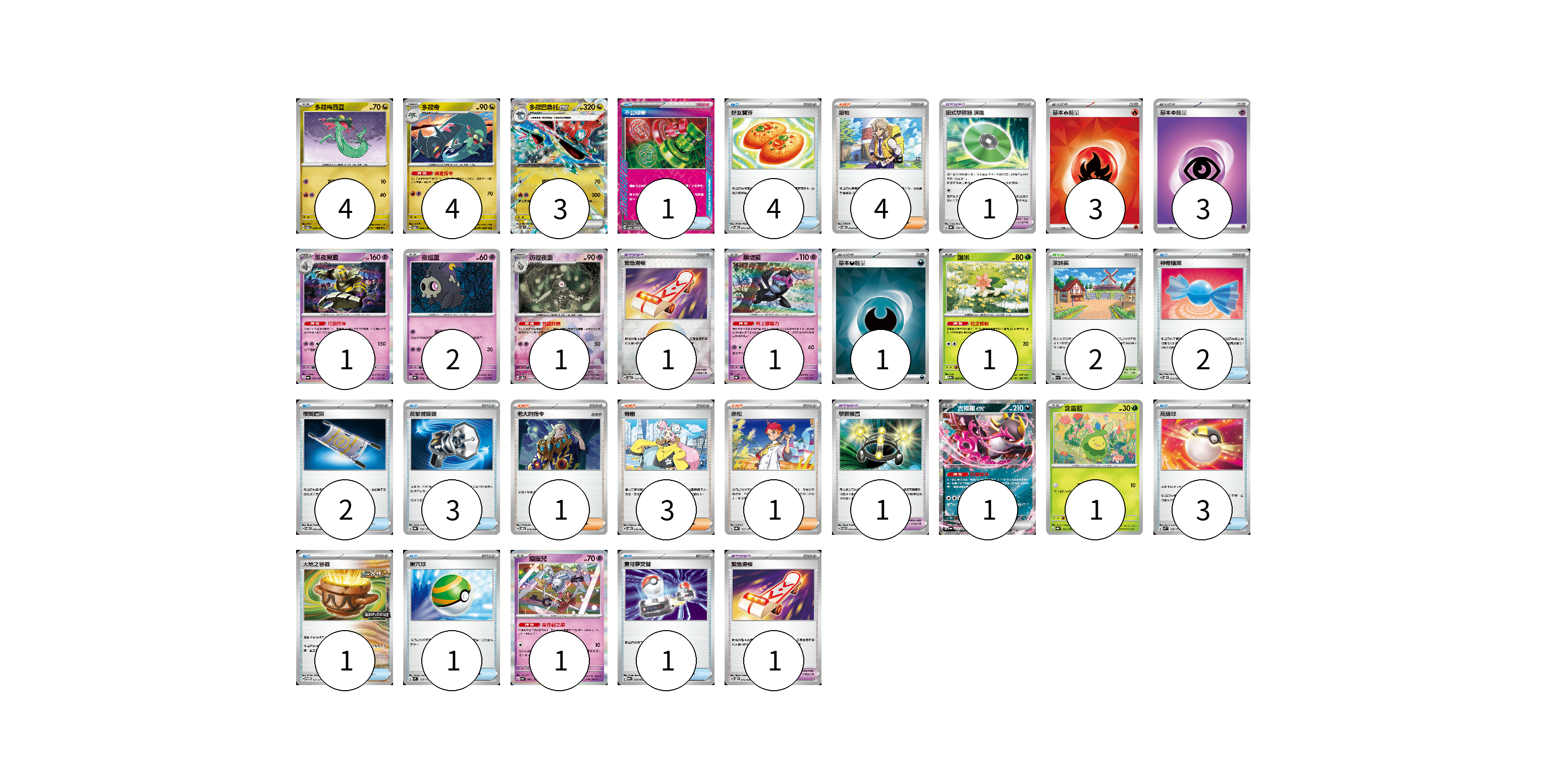 牌組構築方案 以此牌組為基礎新構築牌組 顯示卡面 顯示列表 寶可夢卡(20) 4 4 3 1 2 1 1 1 1 1 1 寶可夢道具(4) 1 1 1 1 物品卡(18) 1 4 2 2 3 3 1 1 1 支援者卡(9) 4 1 3 1 競技場卡(2) 2 能量卡(7) 3 3 1 寶可夢卡(20) 卡牌名稱 張數 卡牌名稱 張數 多龍梅西亞 SV6 079/101 04 多龍奇 SV6 080/101 04 多龍巴魯托ex SV6 081/101 03 黑夜魔靈 SV6a 020/064 01 夜巡靈 SV8a 064/187 02 彷徨夜靈 SV8a 065/187 01 願增猿 SV8a 075/187 01 謝米 SV9a 006/063 01 吉雉雞ex SV6a 038/064 01 含羞苞 SV8a 001/187 01 鑰圈兒 SV4a 087/190 01 寶可夢道具(4) 卡牌名稱 張數 卡牌名稱 張數 招式學習器 演進 SV8a 160/187 01 緊急滑板 SV8a 153/187 01 學習裝置 SVTM 016/022 01 緊急滑板 SVOD 015/020 01 物品卡(18) 卡牌名稱 張數 卡牌名稱 張數 不公印章 SV5a 053/066 01 好友寶芬 SVOD 011/020 04 神奇糖果 SVOD 013/020 02 夜間擔架 SVOM 016/021 02 反擊捕捉器 SV8a 139/187 03 高級球 SVM 134/175 03 大地之容器 SV-P 137/SV-P 01 巢穴球 SVM 133/175 01 寶可夢交替 SV9a 058/063 01 支援者卡(9) 卡牌名稱 張數 卡牌名稱 張數 派帕 SVOD 018/020 04 老大的指令 SVOD 019/020 01 奇樹 SVOD 016/020 03 赤松 SV8a 163/187 01 競技場卡(2) 卡牌名稱 張數 卡牌名稱 張數 深缽鎮 SV1a 070/073 02 能量卡(7) 卡牌名稱 張數 卡牌名稱 張數 基本【火】能量 SVK FIR 03 基本【超】能量 SVTS PSY 03 基本【惡】能量 SVOM DAR 01 以此牌組為基礎新構築牌組 牌組編碼 xcBmob-AcTMRz-ysCmin copy 列印牌組單 牌組編碼已複製 分享至SNS