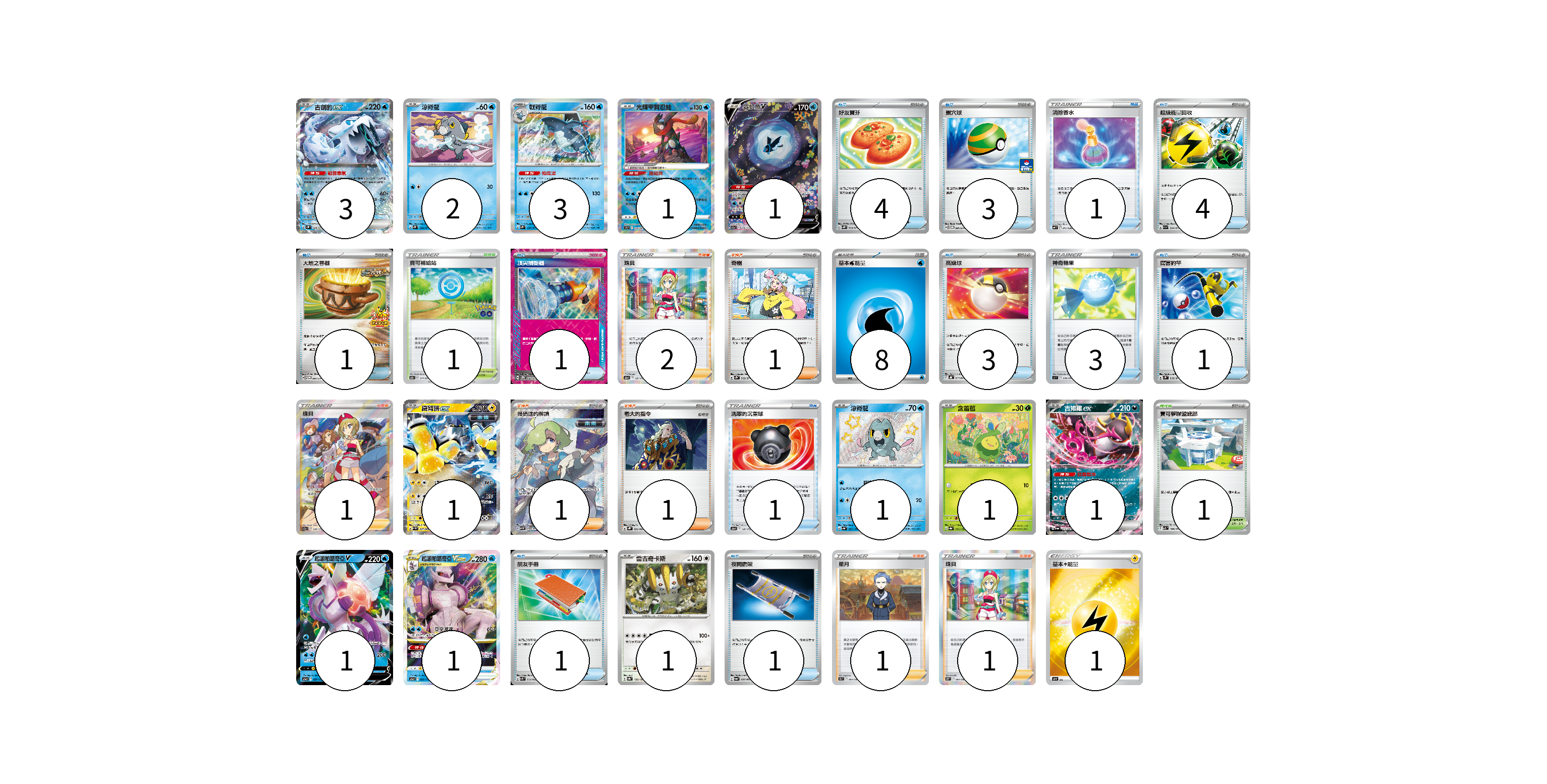 牌組構築方案 以此牌組為基礎新構築牌組 顯示卡面 顯示列表 寶可夢卡(17) 3 2 3 1 1 1 1 1 1 1 1 1 物品卡(24) 4 3 1 4 1 1 3 3 1 1 1 1 支援者卡(8) 2 1 1 1 1 1 1 競技場卡(2) 1 1 能量卡(9) 8 1 寶可夢卡(17) 卡牌名稱 張數 卡牌名稱 張數 古劍豹ex SV2P 028/071 03 涼脊龍 SV2P 024/071 02 戟脊龍 SV2P 027/071 03 光輝甲賀忍蛙 S9a 026/067 01 霓虹魚V S12a 216/172 01 鐵臂膀ex SV4M 027/066 01 涼脊龍 SV4a 233/190 01 含羞苞 SV8a 001/187 01 吉雉雞ex SV6a 038/064 01 起源帕路奇亞V S12a 027/172 01 起源帕路奇亞VSTAR S12a 028/172 01 雷吉奇卡斯 SV8a 132/187 01 物品卡(24) 卡牌名稱 張數 卡牌名稱 張數 好友寶芬 SV5K 063/071 04 巢穴球 SV-P 091/SV-P 03 消除香水 SVF 011/038 01 超級能量回收 SV1a 064/073 04 大地之容器 SV-P 084/SV-P 01 頂尖捕捉器 SV5M 062/071 01 高級球 SVHK 013/022 03 神奇糖果 SI 376/414 03 厲害釣竿 SV2P 066/071 01 洗翠的沉重球 S12a 140/172 01 朋友手冊 SVK 014/042 01 夜間擔架 SV6a 056/064 01 支援者卡(8) 卡牌名稱 張數 卡牌名稱 張數 珠貝 S12a 149/172 02 奇樹 SV2D 069/071 01 珠貝 S12a 236/172 01 暗碼迷的解讀 SV5M 090/071 01 老大的指令 SVHK 022/022 01 星月 S9a 064/067 01 珠貝 S10P 064/067 01 競技場卡(2) 卡牌名稱 張數 卡牌名稱 張數 寶可補給站 S10b 071/071 01 寶可夢聯盟總部 SV3 108/108 01 能量卡(9) 卡牌名稱 張數 卡牌名稱 張數 基本水能量 sv-p WAT 08 基本【雷】能量 SO LIG 01 以此牌組為基礎新構築牌組 牌組編碼 xcTUWa-YnPhSB-PJkloh copy 列印牌組單 牌組編碼已複製 分享至SNS
