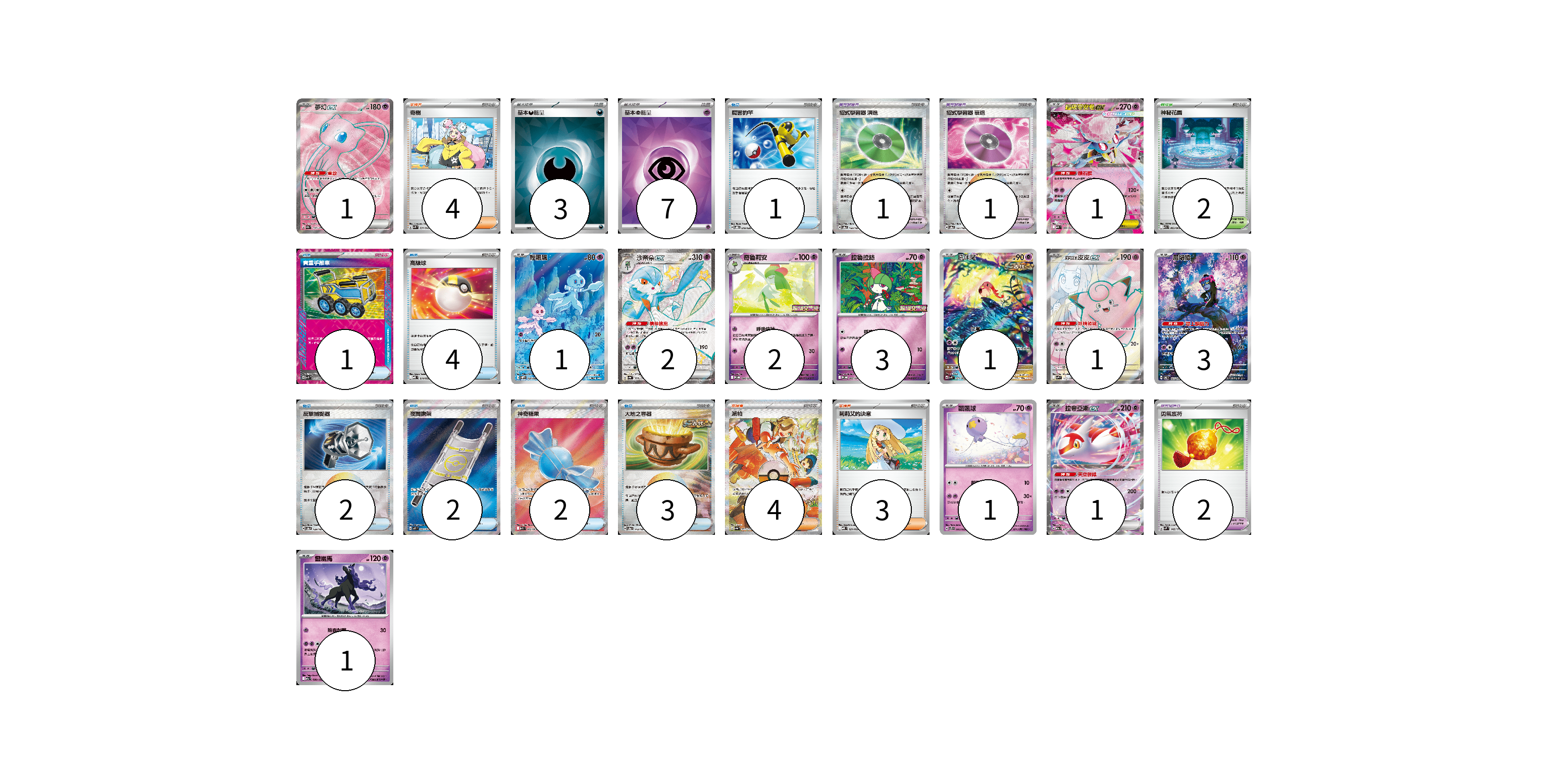 牌組構築方案 以此牌組為基礎新構築牌組 顯示卡面 顯示列表 寶可夢卡(18) 1 1 1 2 2 3 1 1 3 1 1 1 寶可夢道具(4) 1 1 2 物品卡(15) 1 1 4 2 2 2 3 支援者卡(11) 4 4 3 競技場卡(2) 2 能量卡(10) 3 7 寶可夢卡(18) 卡牌名稱 張數 卡牌名稱 張數 夢幻ex SV2a 195/165 01 超級蒂安希ex MBD 006/022 01 輕飄飄 SV11W 124/086 01 沙奈朵ex SV4a 328/190 02 奇魯莉安 M-P 006/M-P 02 拉魯拉絲 M-P 005/M-P 03 吼叫尾 SV4K 071/066 01 莉莉艾的皮皮ex SV9 115/100 01 願增猿 SV6 107/101 03 飄飄球 SVTS 005/022 01 拉帝亞斯ex M2a 075/193 01 靈幽馬 M2a 080/193 01 寶可夢道具(4) 卡牌名稱 張數 卡牌名稱 張數 招式學習器 演進 SV8a 160/187 01 招式學習器 衰退 SV8a 161/187 01 勇氣護符 SVM 142/175 02 物品卡(15) 卡牌名稱 張數 卡牌名稱 張數 厲害釣竿 SVOD 010/020 01 貴重手推車 SVK 020/042 01 高級球 MBD 014/022 04 反擊捕捉器 SV8a 139/187 02 夜間擔架 M1L 083/063 02 神奇糖果 M1S 082/063 02 大地之容器 SV8a 143/187 03 支援者卡(11) 卡牌名稱 張數 卡牌名稱 張數 奇樹 SVK 031/042 04 派帕 SV4a 353/190 04 莉莉艾的決意 MBD 021/022 03 競技場卡(2) 卡牌名稱 張數 卡牌名稱 張數 神秘花園 M1S 063/063 02 能量卡(10) 卡牌名稱 張數 卡牌名稱 張數 基本【惡】能量 SVK DAR 03 基本【超】能量 SVK PSY 07 以此牌組為基礎新構築牌組 牌組編碼 xclvEe-HiiWNQ-vVOaZV copy 列印牌組單 牌組編碼已複製 分享至SNS
