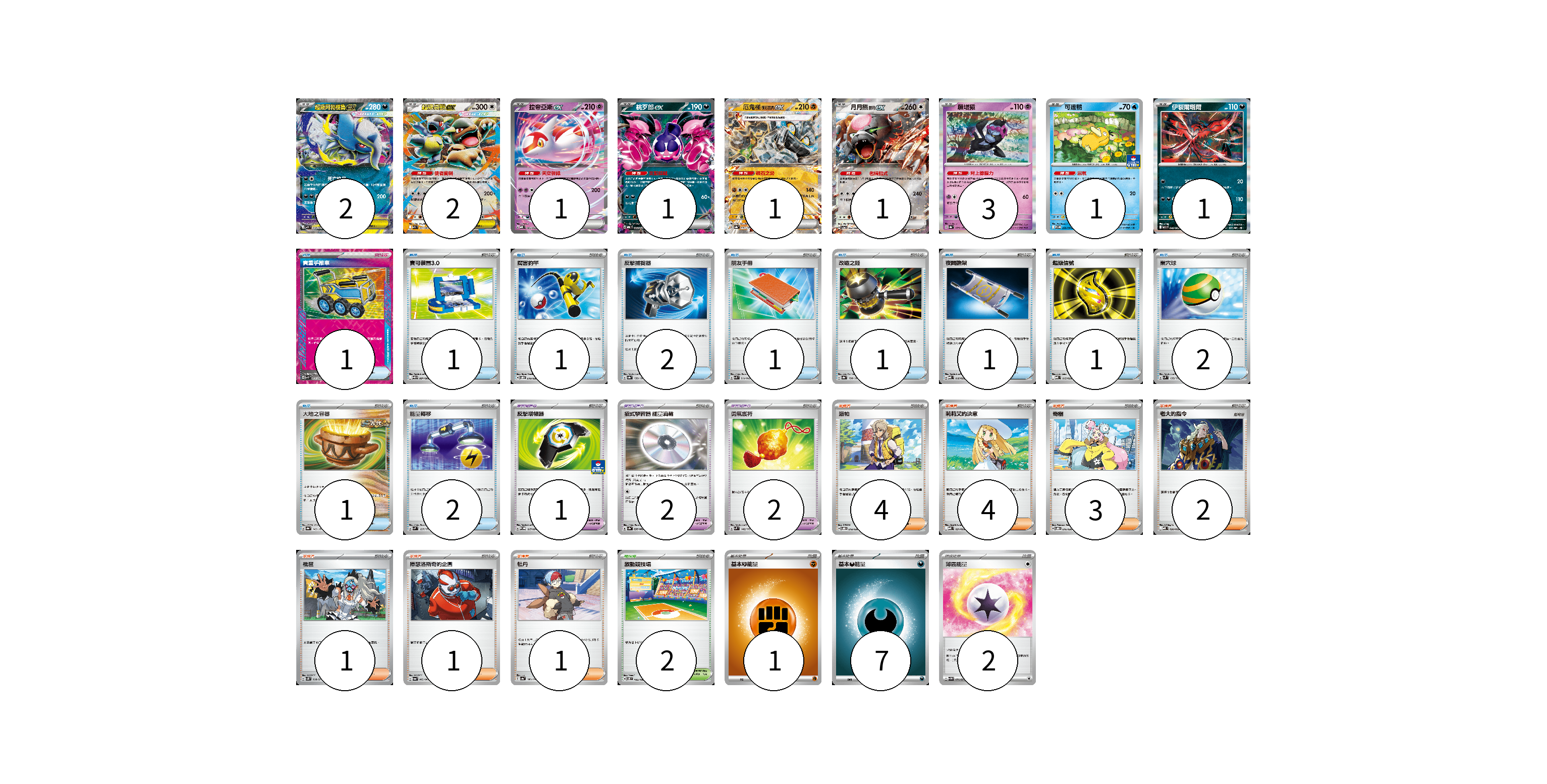 牌組構築方案 以此牌組為基礎新構築牌組 顯示卡面 顯示列表 寶可夢卡(13) 2 2 1 1 1 1 3 1 1 寶可夢道具(5) 1 2 2 物品卡(14) 1 1 1 2 1 1 1 1 2 1 2 支援者卡(16) 4 4 3 2 1 1 1 競技場卡(2) 2 能量卡(10) 1 7 2 寶可夢卡(13) 卡牌名稱 張數 卡牌名稱 張數 超級阿勃梭魯ex M1L 038/063 02 超級袋獸ex M1S 051/063 02 拉帝亞斯ex MBD 003/022 01 桃歹郎ex MBG 009/022 01 厄鬼椪 礎石面具ex SV8a 091/187 01 月月熊 赫月 ex SV5a 052/066 01 願增猿 SV8a 075/187 03 可達鴨 SV-P 220/SV-P 01 伊裴爾塔爾 M1L 040/063 01 寶可夢道具(5) 卡牌名稱 張數 卡牌名稱 張數 反擊增幅器 M-P 017/M-P 01 招式學習器 能量渦輪 SV3a 056/062 02 勇氣護符 SVM 142/175 02 物品卡(14) 卡牌名稱 張數 卡牌名稱 張數 貴重手推車 SVK 020/042 01 寶可裝置3.0 SV11B 081/086 01 厲害釣竿 SVOD 010/020 01 反擊捕捉器 SV8a 139/187 02 朋友手冊 SVK 014/042 01 改造之錘 SV8a 138/187 01 夜間擔架 MBD 016/022 01 超級信號 MBD 015/022 01 巢穴球 SVM 133/175 02 大地之容器 SV8a 143/187 01 能量轉移 SVM 127/175 02 支援者卡(16) 卡牌名稱 張數 卡牌名稱 張數 派帕 SVOD 018/020 04 莉莉艾的決意 MBD 021/022 04 奇樹 SVOD 016/020 03 老大的指令 MBD 020/022 02 枇琶 SV5K 068/071 01 庫瑟洛斯奇的企圖 SV6a 062/064 01 牡丹 SV4a 182/190 01 競技場卡(2) 卡牌名稱 張數 卡牌名稱 張數 激動競技場 SV8 105/106 02 能量卡(10) 卡牌名稱 張數 卡牌名稱 張數 基本【鬥】能量 M-P FIG 01 基本【惡】能量 MBG DAR 07 薄霧能量 SV5M 071/071 02 以此牌組為基礎新構築牌組 牌組編碼 xdnSoX-lsAELQ-yWHSPk copy 列印牌組單 牌組編碼已複製 分享至SNS