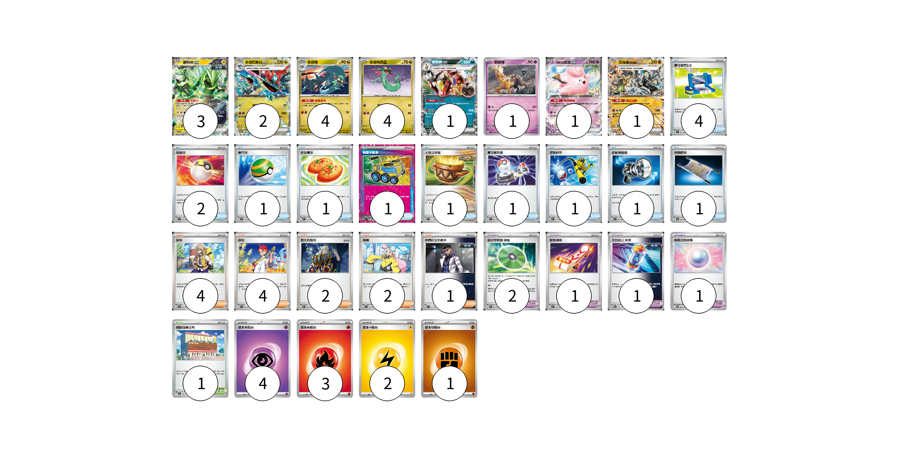 牌組構築方案 以此牌組為基礎新構築牌組 顯示卡面 顯示列表 寶可夢卡(17) 3 2 4 4 1 1 1 1 寶可夢道具(5) 2 1 1 1 物品卡(14) 4 2 1 1 1 1 1 1 1 1 支援者卡(13) 4 4 2 2 1 競技場卡(1) 1 能量卡(10) 4 3 2 1 寶可夢卡(17) 卡牌名稱 張數 卡牌名稱 張數 鐵荊棘ex SV5a 033/066 03 多龍巴魯托ex SV6 081/101 02 多龍奇 SV6 080/101 04 多龍梅西亞 SV6 079/101 04 奇麒麟ex SV5M 042/071 01 麒麟奇 SV5M 032/071 01 莉莉艾的皮皮ex SV9 033/100 01 厄鬼椪 礎石面具ex SV6 065/101 01 寶可夢道具(5) 卡牌名稱 張數 卡牌名稱 張數 招式學習器 演進 SVK 025/042 02 緊急滑板 SVK 023/042 01 驅勁能量 未來 SV8a 158/187 01 莉莉艾的珍珠 SV9 093/100 01 物品卡(14) 卡牌名稱 張數 卡牌名稱 張數 寶可裝置3.0 SVK 021/042 04 高級球 SVK 018/042 02 巢穴球 SVK 016/042 01 好友寶芬 SVK 015/042 01 貴重手推車 SVK 020/042 01 大地之容器 SVK 012/042 01 寶可夢交替 SVK 022/042 01 厲害釣竿 SVK 011/042 01 反擊捕捉器 SVK 009/042 01 夜間擔架 SV6a 056/064 01 支援者卡(13) 卡牌名稱 張數 卡牌名稱 張數 派帕 SVK 035/042 04 赤松 SVK 027/042 04 老大的指令 SVK 036/042 02 奇樹 SVK 031/042 02 弗圖博士的劇本 SVK 034/042 01 競技場卡(1) 卡牌名稱 張數 卡牌名稱 張數 城鎮百貨公司 SV3 107/108 01 能量卡(10) 卡牌名稱 張數 卡牌名稱 張數 基本【超】能量 SVF PSY 04 基本【火】能量 SVF FIR 03 基本【雷】能量 SVF LIG 02 基本【鬥】能量 SVF FIG 01 以此牌組為基礎新構築牌組 牌組編碼 xiWEvK-LodARz-avMJcv copy 列印牌組單 牌組編碼已複製 分享至SNS