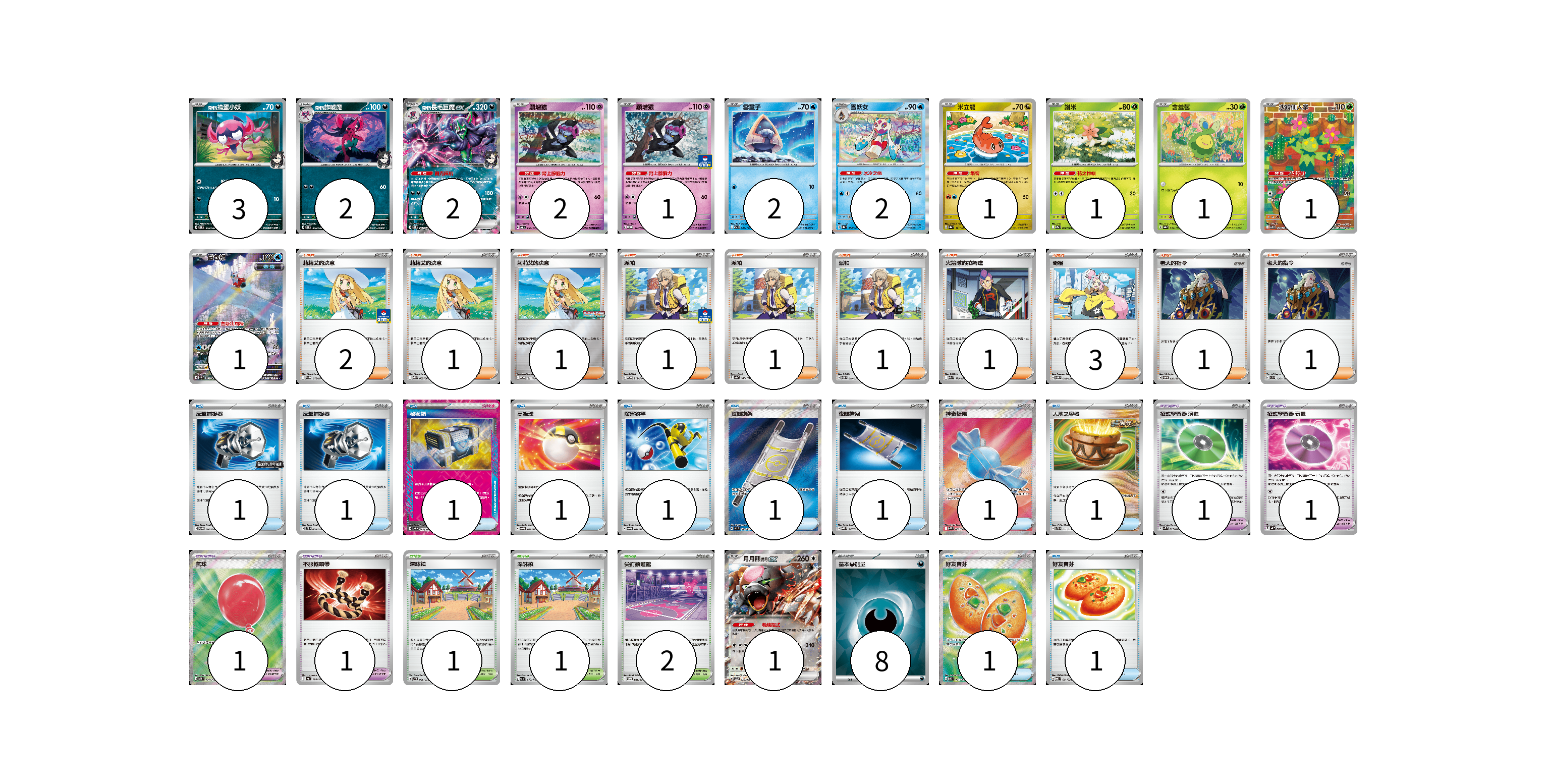 牌組構築方案 以此牌組為基礎新構築牌組 顯示卡面 顯示列表 寶可夢卡(20) 3 2 2 2 1 2 2 1 1 1 1 1 1 寶可夢道具(4) 1 1 1 1 物品卡(11) 1 1 1 1 1 1 1 1 1 1 1 支援者卡(13) 2 1 1 1 1 1 1 3 1 1 競技場卡(4) 1 1 2 能量卡(8) 8 寶可夢卡(20) 卡牌名稱 張數 卡牌名稱 張數 <瑪俐的>搗蛋小妖 SVOM 005/021 03 <瑪俐的>詐唬魔 SVOM 006/021 02 <瑪俐的>長毛巨魔ex SVOM 007/021 02 願增猿 SV6 055/101 02 願增猿 M-P 014/M-P 01 雪童子 M2a 035/193 02 雪妖女 SV8a 038/187 02 米立龍 SV8a 121/187 01 謝米 SV9a 006/063 01 含羞苞 SV8a 001/187 01 沙鈴仙人掌 SV9 101/100 01 鐵包袱 SV4M 071/066 01 月月熊 赫月 ex SV5a 052/066 01 寶可夢道具(4) 卡牌名稱 張數 卡牌名稱 張數 招式學習器 演進 SVK 025/042 01 招式學習器 衰退 SV4K 063/066 01 氣球 M1L 084/063 01 不服輸頭帶 SV4a 168/190 01 物品卡(11) 卡牌名稱 張數 卡牌名稱 張數 反擊捕捉器 SV-P 136/SV-P 01 反擊捕捉器 SVTS 009/022 01 秘密箱 SV6 092/101 01 高級球 SVOM 013/021 01 厲害釣竿 SVOM 011/021 01 夜間擔架 M1L 083/063 01 夜間擔架 MBG 017/022 01 神奇糖果 M1S 082/063 01 大地之容器 SVTS 011/022 01 好友寶芬 M1S 081/063 01 好友寶芬 MBG 011/022 01 支援者卡(13) 卡牌名稱 張數 卡牌名稱 張數 莉莉艾的決意 M-P 018/M-P 02 莉莉艾的決意 M1L 062/063 01 莉莉艾的決意 M-P 011/M-P 01 派帕 SV-P 213/SV-P 01 派帕 SV4a 180/190 01 派帕 SVTM 019/022 01 火箭隊的拉姆達 M2a 179/193 01 奇樹 SVOM 018/021 03 老大的指令 SVOM 020/021 01 老大的指令(魁奇思) SVD 138/139 01 競技場卡(4) 卡牌名稱 張數 卡牌名稱 張數 深缽鎮 SVF 036/038 01 深缽鎮 SV1a 070/073 01 尖釘鎮道館 SVOM 021/021 02 能量卡(8) 卡牌名稱 張數 卡牌名稱 張數 基本【惡】能量 SVK DAR 08 以此牌組為基礎新構築牌組 牌組編碼 xjLsyV-QctLbC-BpCFFX copy 列印牌組單 牌組編碼已複製 分享至SNS