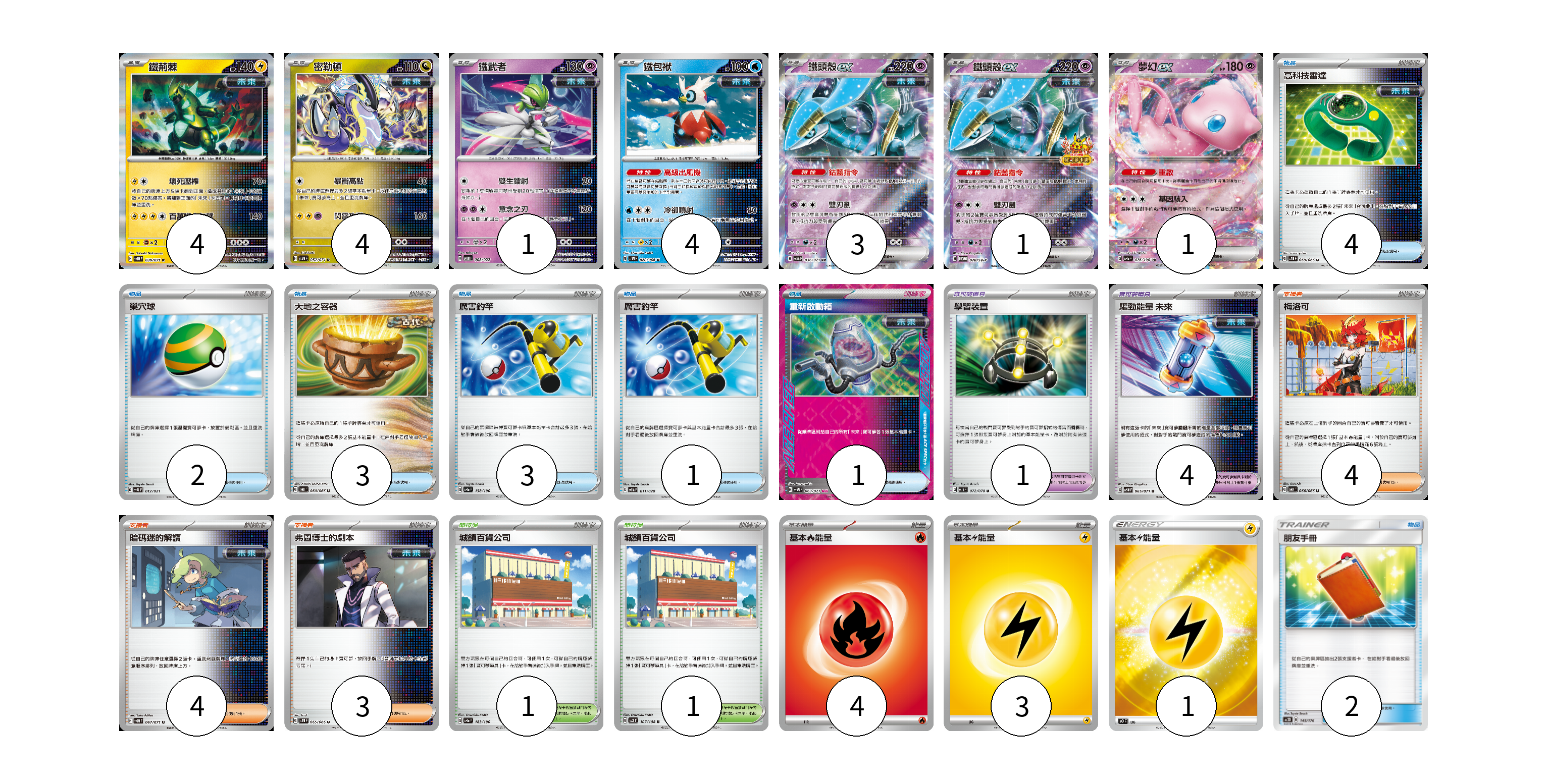 牌組構築方案 以此牌組為基礎新構築牌組 顯示卡面 顯示列表 寶可夢卡(18) 4 4 1 4 3 1 1 寶可夢道具(5) 1 4 物品卡(16) 4 2 3 3 1 1 2 支援者卡(11) 4 4 3 競技場卡(2) 1 1 能量卡(8) 4 3 1 寶可夢卡(18) 卡牌名稱 張數 卡牌名稱 張數 鐵荊棘 SV5M 030/071 04 密勒頓 SV5M 052/071 04 鐵武者 SVHM 008/022 01 鐵包袱 SV4M 020/066 04 鐵頭殼ex SV5M 036/071 03 鐵頭殼ex SV-P 078/SV-P 01 夢幻ex SV4a 076/190 01 寶可夢道具(5) 卡牌名稱 張數 卡牌名稱 張數 學習裝置 SV1S 072/078 01 驅勁能量 未來 SV5M 065/071 04 物品卡(16) 卡牌名稱 張數 卡牌名稱 張數 高科技雷達 SV4M 060/066 04 巢穴球 SVAL 012/021 02 大地之容器 SV4K 060/066 03 厲害釣竿 SV4a 158/190 03 厲害釣竿 SVEM 011/020 01 重新啟動箱 SV5M 063/071 01 朋友手冊 AC2D 145/176 02 支援者卡(11) 卡牌名稱 張數 卡牌名稱 張數 梅洛可 SV4K 066/066 04 暗碼迷的解讀 SV5M 067/071 04 弗圖博士的劇本 SV4M 065/066 03 競技場卡(2) 卡牌名稱 張數 卡牌名稱 張數 城鎮百貨公司 SV4a 183/190 01 城鎮百貨公司 SV3 107/108 01 能量卡(8) 卡牌名稱 張數 卡牌名稱 張數 基本【火】能量 SVHK FIR 04 基本【雷】能量 SVHM LIG 03 基本【雷】能量 SO LIG 01 以此牌組為基礎新構築牌組 牌組編碼 xjShVS-nXgwvN-YSrpjo copy 列印牌組單 牌組編碼已複製 分享至SNS