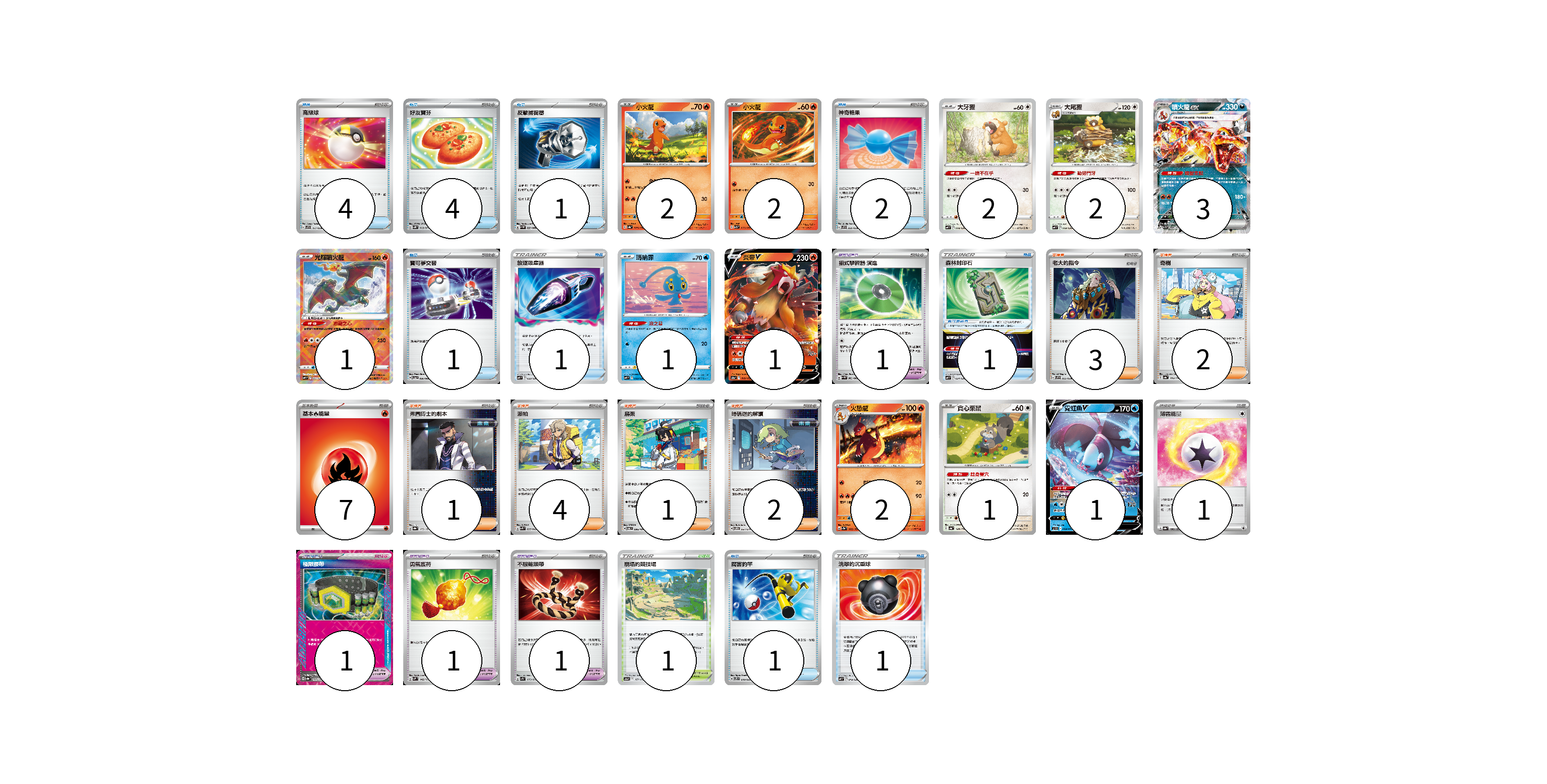 牌組構築方案 以此牌組為基礎新構築牌組 顯示卡面 顯示列表 寶可夢卡(18) 2 2 2 2 3 1 1 1 2 1 1 寶可夢道具(4) 1 1 1 1 物品卡(16) 4 4 1 2 1 1 1 1 1 支援者卡(13) 3 2 1 4 1 2 競技場卡(1) 1 能量卡(8) 7 1 寶可夢卡(18) 卡牌名稱 張數 卡牌名稱 張數 小火龍 SV4a 025/190 02 小火龍 SV3 012/108 02 大牙狸 SVF 008/038 02 大尾狸 SVF 009/038 02 噴火龍ex SV3 066/108 03 光輝噴火龍 SVF 001/038 01 瑪納霏 SVF 003/038 01 炎帝V S12a 019/172 01 火恐龍 SV2a 005/165 02 貪心栗鼠 SV4a 148/190 01 霓虹魚V SVHK 004/022 01 寶可夢道具(4) 卡牌名稱 張數 卡牌名稱 張數 招式學習器 演進 SV4M 063/066 01 極限腰帶 SV8a 159/187 01 勇氣護符 SVM 142/175 01 不服輸頭帶 SV1S 073/078 01 物品卡(16) 卡牌名稱 張數 卡牌名稱 張數 高級球 SVF 017/038 04 好友寶芬 SV5K 063/071 04 反擊捕捉器 SV4M 059/066 01 神奇糖果 SVF 020/038 02 寶可夢交替 SV5a 056/066 01 放逐吸塵器 SVF 023/038 01 森林封印石 SVF 024/038 01 厲害釣竿 SVTS 010/022 01 洗翠的沉重球 SVF 019/038 01 支援者卡(13) 卡牌名稱 張數 卡牌名稱 張數 老大的指令 SVF 032/038 03 奇樹 SV4a 174/190 02 弗圖博士的劇本 SV8a 175/187 01 派帕 SVK 035/042 04 烏栗 SV6 096/101 01 暗碼迷的解讀 SV5M 067/071 02 競技場卡(1) 卡牌名稱 張數 卡牌名稱 張數 崩塌的競技場 S12a 167/172 01 能量卡(8) 卡牌名稱 張數 卡牌名稱 張數 基本【火】能量 SVEL FIR 07 薄霧能量 SV8a 186/187 01 以此牌組為基礎新構築牌組 牌組編碼 xmrUfn-ZuuRaW-hBUwcD copy 列印牌組單 牌組編碼已複製 分享至SNS