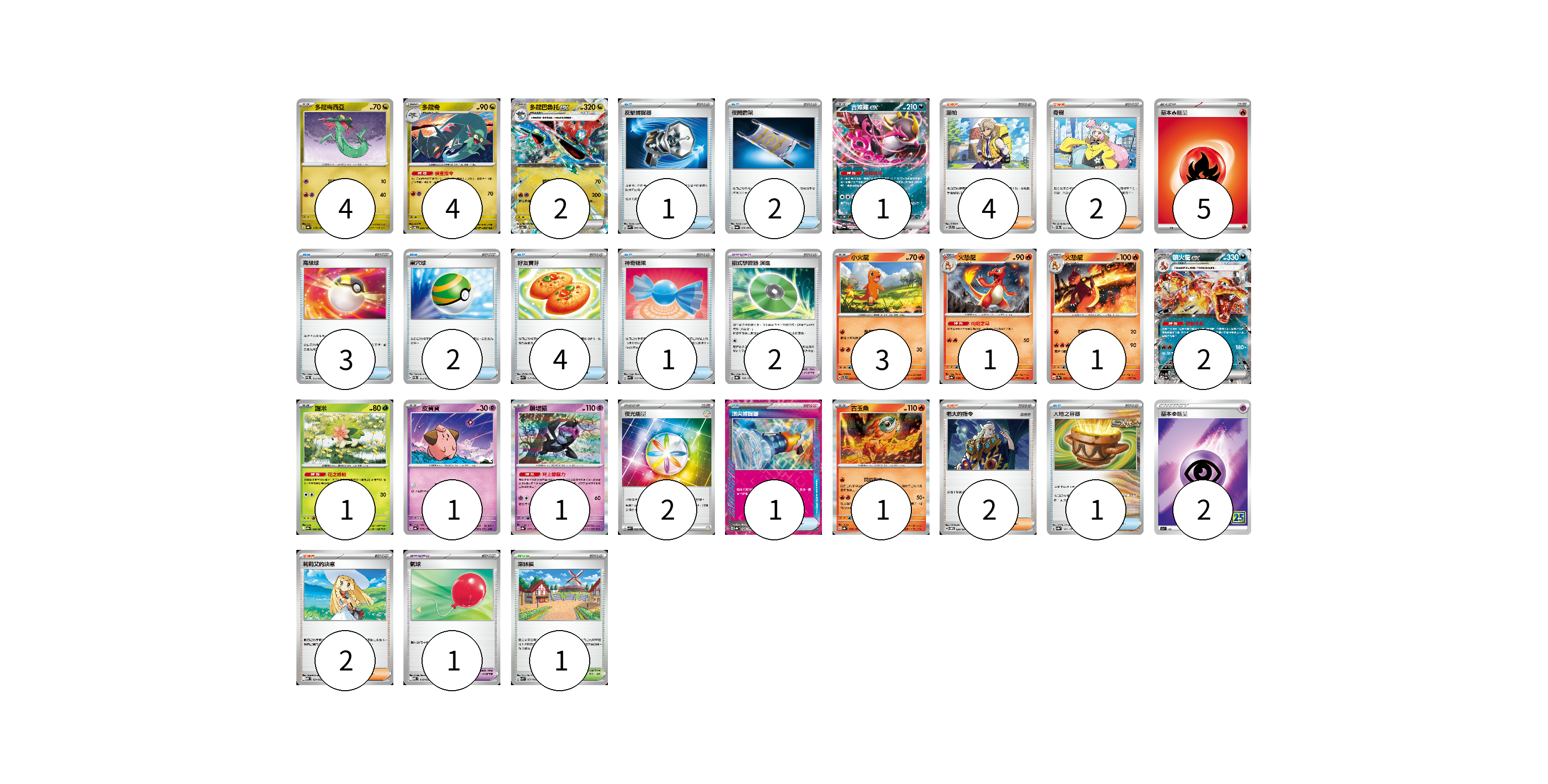 牌組構築方案 以此牌組為基礎新構築牌組 顯示卡面 顯示列表 寶可夢卡(22) 4 4 2 1 3 1 1 2 1 1 1 1 寶可夢道具(2) 2 物品卡(16) 1 2 3 2 4 1 1 1 1 支援者卡(10) 4 2 2 2 競技場卡(1) 1 能量卡(9) 5 2 2 寶可夢卡(22) 卡牌名稱 張數 卡牌名稱 張數 多龍梅西亞 SV8a 118/187 04 多龍奇 SV6 080/101 04 多龍巴魯托ex SV6 081/101 02 吉雉雞ex SV6a 038/064 01 小火龍 SVTL 001/021 03 火恐龍 SV4a 026/190 01 火恐龍 SV2a 005/165 01 噴火龍ex SV4a 115/190 02 謝米 SV9a 006/063 01 皮寶寶 SV4a 077/190 01 願增猿 SV8a 075/187 01 古玉魚 SV8a 025/187 01 寶可夢道具(2) 卡牌名稱 張數 卡牌名稱 張數 招式學習器 演進 SV8a 160/187 02 物品卡(16) 卡牌名稱 張數 卡牌名稱 張數 反擊捕捉器 SVK 009/042 01 夜間擔架 SV6a 056/064 02 高級球 SVEM 013/020 03 巢穴球 SVEM 012/020 02 好友寶芬 SVK 015/042 04 神奇糖果 SVK 019/042 01 頂尖捕捉器 SV8a 148/187 01 大地之容器 SV8a 143/187 01 氣球 MBD 018/022 01 支援者卡(10) 卡牌名稱 張數 卡牌名稱 張數 派帕 SVTL 020/021 04 奇樹 SVEM 017/020 02 老大的指令 SVOM 020/021 02 莉莉艾的決意 MBD 021/022 02 競技場卡(1) 卡牌名稱 張數 卡牌名稱 張數 深缽鎮 SVK 039/042 01 能量卡(9) 卡牌名稱 張數 卡牌名稱 張數 基本火能量 sv-p FIR 05 夜光能量 SVK 042/042 02 基本超能量 S8a PSY 02 以此牌組為基礎新構築牌組 牌組編碼 xnOwwZ-OCBNVO-ADrXhf copy 列印牌組單 牌組編碼已複製 分享至SNS