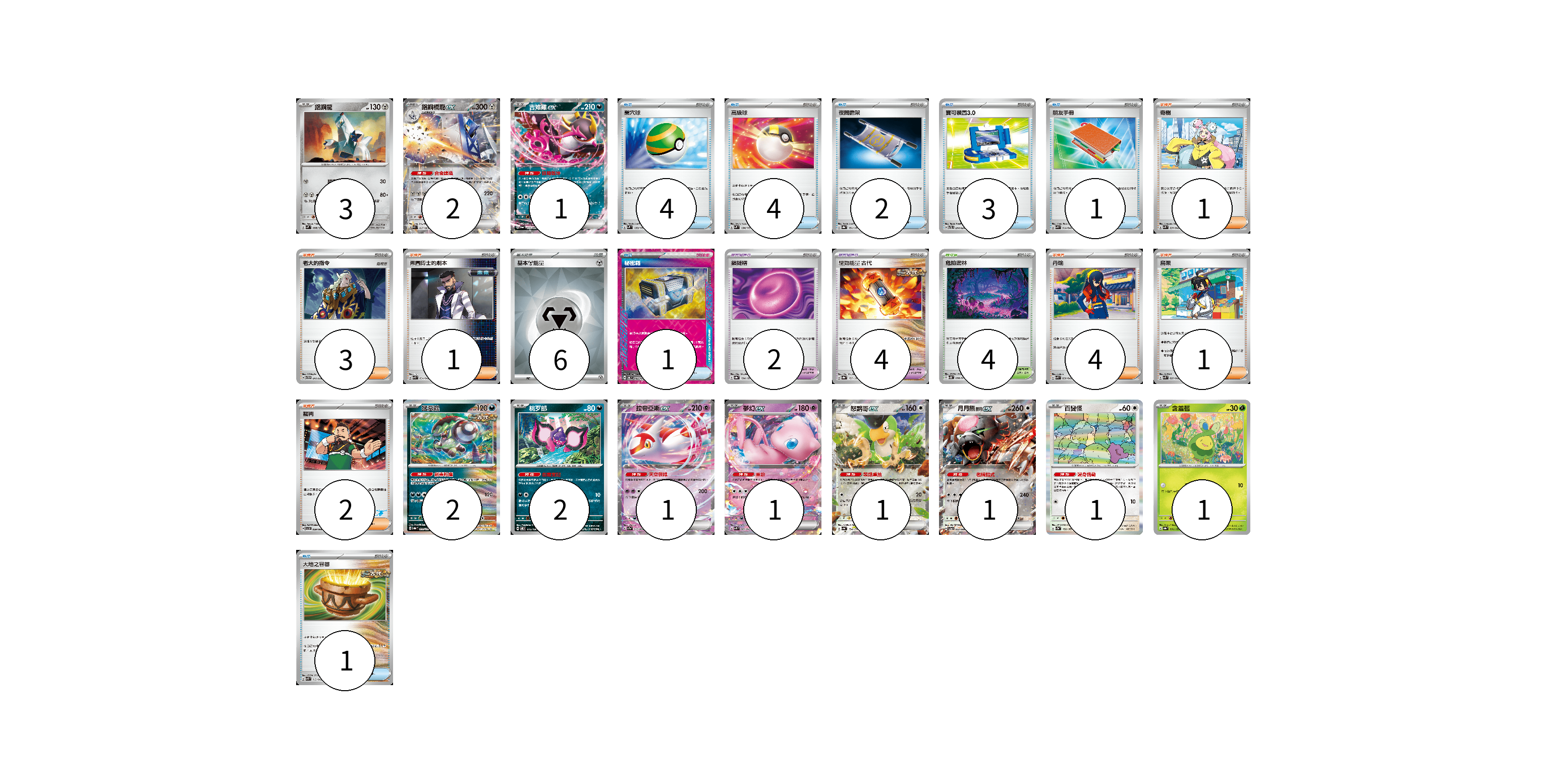 牌組構築方案 以此牌組為基礎新構築牌組 顯示卡面 顯示列表 寶可夢卡(16) 3 2 1 2 2 1 1 1 1 1 1 寶可夢道具(6) 2 4 物品卡(16) 4 4 2 3 1 1 1 支援者卡(12) 1 3 1 4 1 2 競技場卡(4) 4 能量卡(6) 6 寶可夢卡(16) 卡牌名稱 張數 卡牌名稱 張數 鋁鋼龍 SVM 088/175 03 鋁鋼橋龍ex SV7a 037/064 02 吉雉雞ex SV6a 038/064 01 猛惡菇 SV8a 099/187 02 桃歹郎 SV8 075/106 02 拉帝亞斯ex SV7a 019/064 01 夢幻ex SVK 001/042 01 怒鸚哥ex SV4a 154/190 01 月月熊 赫月 ex SV5a 052/066 01 百變怪 SV2a 132/165 01 含羞苞 SV8a 001/187 01 寶可夢道具(6) 卡牌名稱 張數 卡牌名稱 張數 鎖鏈糬 SV8a 154/187 02 驅勁能量 古代 SV8a 157/187 04 物品卡(16) 卡牌名稱 張數 卡牌名稱 張數 巢穴球 SVM 133/175 04 高級球 SVM 134/175 04 夜間擔架 SV8a 151/187 02 寶可裝置3.0 SVTL 014/021 03 朋友手冊 SVK 014/042 01 秘密箱 SV6 092/101 01 大地之容器 SVK 012/042 01 支援者卡(12) 卡牌名稱 張數 卡牌名稱 張數 奇樹 SVK 031/042 01 老大的指令 SVTH 017/018 03 弗圖博士的劇本 SVK 034/042 01 丹瑜 SVK 030/042 04 烏栗 SVK 029/042 01 裁判 SVI 059/066 02 競技場卡(4) 卡牌名稱 張數 卡牌名稱 張數 危險密林 SV5K 070/071 04 能量卡(6) 卡牌名稱 張數 卡牌名稱 張數 基本【鋼】能量 SVK MET 06 以此牌組為基礎新構築牌組 牌組編碼 xqJAlu-HkrNjL-JrGPZZ copy 列印牌組單 牌組編碼已複製 分享至SNS