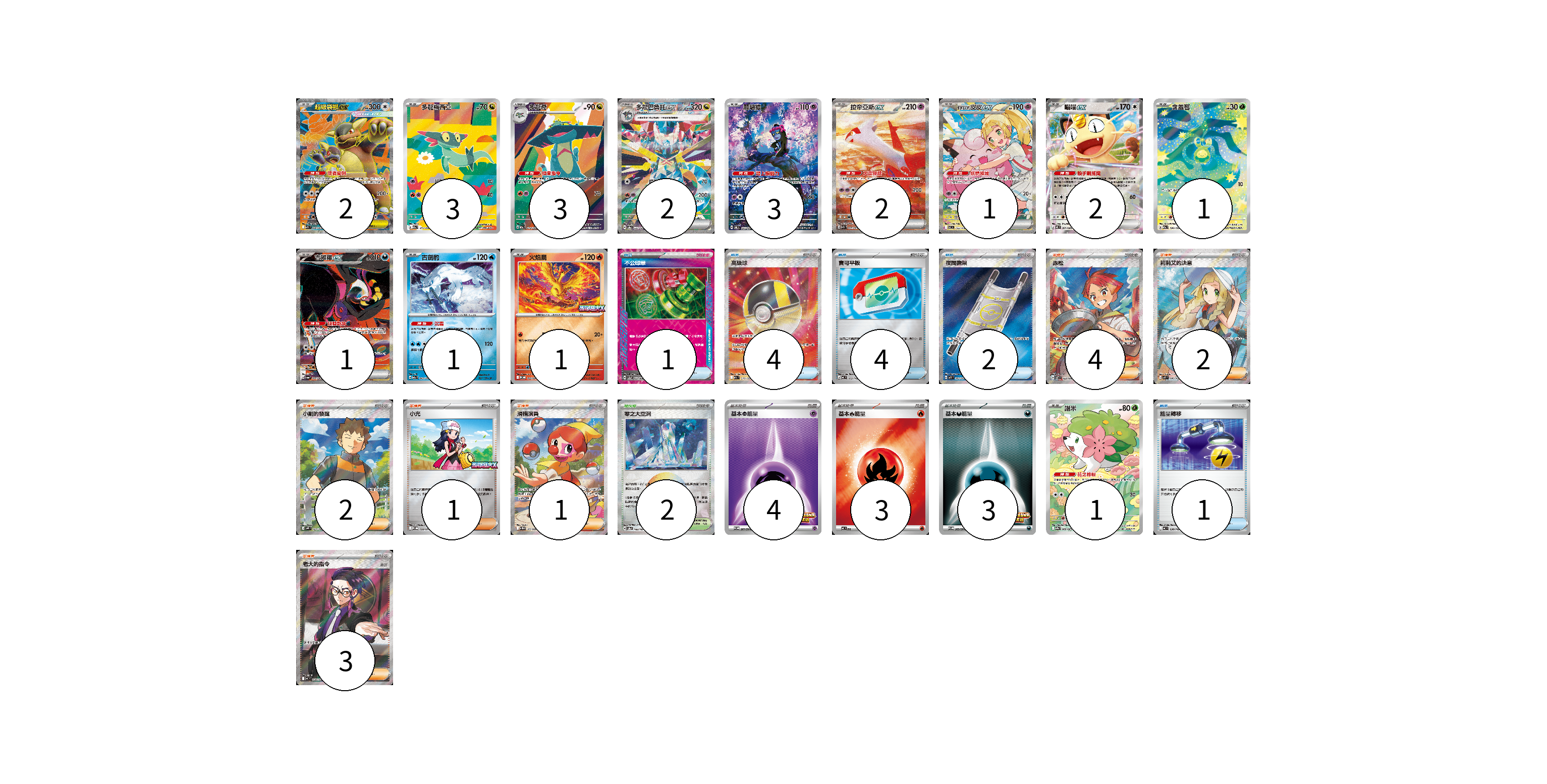 牌組構築方案 以此牌組為基礎新構築牌組 顯示卡面 顯示列表 寶可夢卡(23) 2 3 3 2 3 2 1 2 1 1 1 1 1 物品卡(12) 1 4 4 2 1 支援者卡(13) 4 2 2 1 1 3 競技場卡(2) 2 能量卡(10) 4 3 3 寶可夢卡(23) 卡牌名稱 張數 卡牌名稱 張數 超級袋獸ex M1S 080/063 02 多龍梅西亞 M2a 211/193 03 多龍奇 M2a 212/193 03 多龍巴魯托ex SV8a 221/187 02 願增猿 SV6 107/101 03 拉帝亞斯ex SV7a 087/064 02 莉莉艾的皮皮ex MC 765/742 01 喵喵ex M3 061/080 02 含羞苞 M2a 196/193 01 吉雉雞ex SV6a 089/064 01 古劍豹 M2a 043/193 01 火焰鳥 M-P 022/M-P 01 謝米 SV9a 066/063 01 物品卡(12) 卡牌名稱 張數 卡牌名稱 張數 不公印章 SV5a 053/066 01 高級球 M2a 216/193 04 寶可平板 MC 662/742 04 夜間擔架 M1L 083/063 02 能量轉移 MC 638/742 01 支援者卡(13) 卡牌名稱 張數 卡牌名稱 張數 赤松 SV7 123/102 04 莉莉艾的決意 M1L 086/063 02 小剛的發掘 SV9 123/100 02 小光 M-P 028/M-P 01 滑稽演員 SV11W 165/086 01 老大的指令(烏羽) MC 760/742 03 競技場卡(2) 卡牌名稱 張數 卡牌名稱 張數 零之大空洞 SV8a 182/187 02 能量卡(10) 卡牌名稱 張數 卡牌名稱 張數 基本【超】能量 SV-P 261/SV-P 04 基本【火】能量 MC FIR 03 基本【惡】能量 SV-P 263/SV-P 03 以此牌組為基礎新構築牌組 牌組編碼 xuDJhA-IcoFUL-VBVeoo copy 列印牌組單 牌組編碼已複製 分享至SNS