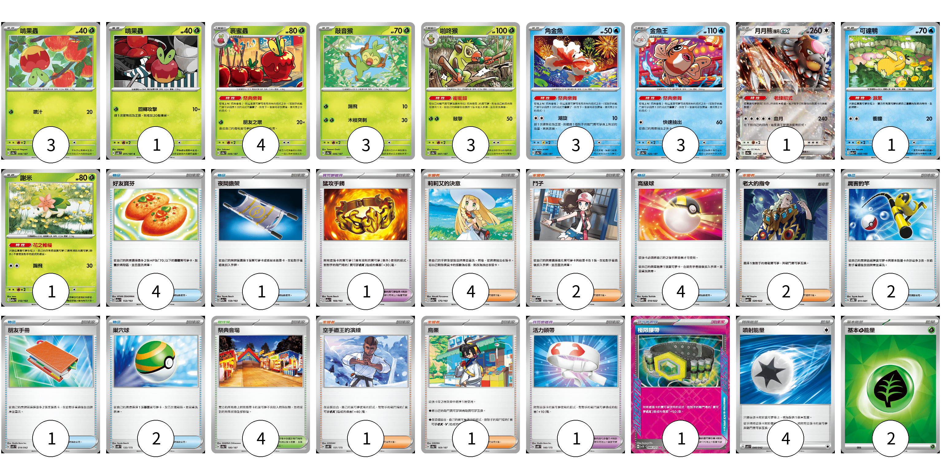 牌組構築方案 以此牌組為基礎新構築牌組 顯示卡面 顯示列表 寶可夢卡(23) 3 1 4 3 3 3 3 1 1 1 寶可夢道具(3) 1 1 1 物品卡(14) 4 1 4 2 1 2 支援者卡(10) 4 2 2 1 1 競技場卡(4) 4 能量卡(6) 4 2 寶可夢卡(23) 卡牌名稱 張數 卡牌名稱 張數 啃果蟲 SV8a 008/187 03 啃果蟲 SV6 011/101 01 裹蜜蟲 SV8a 009/187 04 敲音猴 SV8a 006/187 03 啪咚猴 SV8a 007/187 03 角金魚 SV8a 028/187 03 金魚王 SV8a 029/187 03 月月熊 赫月ex SV8a 134/187 01 可達鴨 M2a 032/193 01 謝米 M2a 012/193 01 寶可夢道具(3) 卡牌名稱 張數 卡牌名稱 張數 猛攻手鐲 M2a 166/193 01 活力頭帶 SVM 140/175 01 極限腰帶 SV5K 066/071 01 物品卡(14) 卡牌名稱 張數 卡牌名稱 張數 好友寶芬 M2a 153/193 04 夜間擔架 M2a 159/193 01 高級球 MBD 014/022 04 厲害釣竿 SVOM 011/021 02 朋友手冊 SVK 014/042 01 巢穴球 SVM 133/175 02 支援者卡(10) 卡牌名稱 張數 卡牌名稱 張數 莉莉艾的決意 M2a 175/193 04 鬥子 M2a 172/193 02 老大的指令 MBD 020/022 02 空手道王的演練 SVM 151/175 01 烏栗 SV8a 169/187 01 競技場卡(4) 卡牌名稱 張數 卡牌名稱 張數 祭典會場 SV8a 180/187 04 能量卡(6) 卡牌名稱 張數 卡牌名稱 張數 噴射能量 SVK 040/042 04 基本【草】能量 SVM GRA 02 以此牌組為基礎新構築牌組 牌組編碼 xwwuRa-vXQaho-QptZam copy 列印牌組單 牌組編碼已複製 分享至SNS