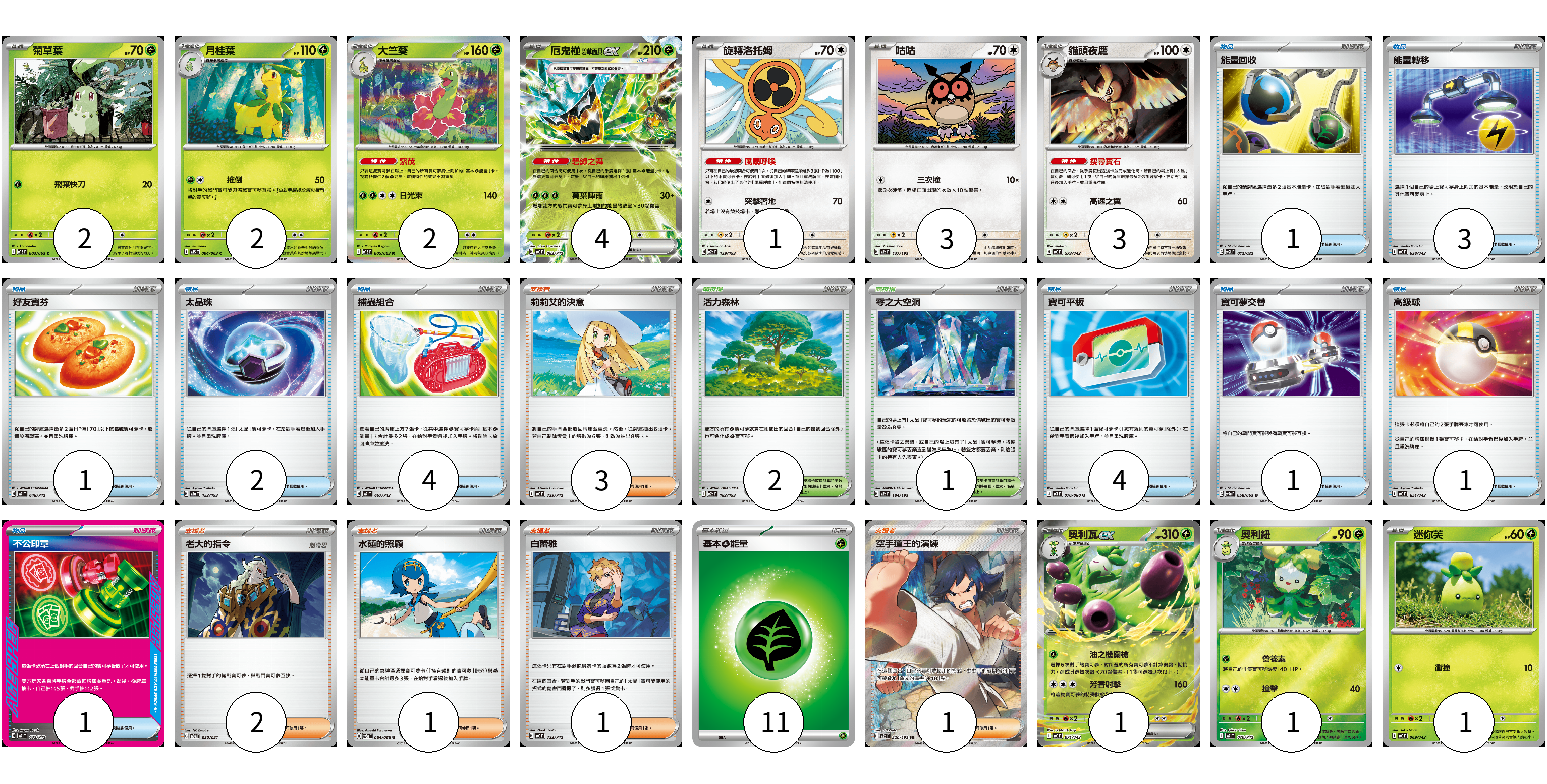 牌組構築方案 以此牌組為基礎新構築牌組 顯示卡面 顯示列表 寶可夢卡(20) 2 2 2 4 1 3 3 1 1 1 物品卡(18) 1 3 1 2 4 4 1 1 1 支援者卡(8) 3 2 1 1 1 競技場卡(3) 2 1 能量卡(11) 11 寶可夢卡(20) 卡牌名稱 張數 卡牌名稱 張數 菊草葉 M1S 003/063 02 月桂葉 M1S 004/063 02 大竺葵 M1S 005/063 02 厄鬼椪 碧草面具ex MC 082/742 04 旋轉洛托姆 M2a 139/193 01 咕咕 M2a 137/193 03 貓頭夜鷹 MC 573/742 03 奧利瓦ex MC 071/742 01 奧利紐 MC 070/742 01 迷你芙 MC 069/742 01 物品卡(18) 卡牌名稱 張數 卡牌名稱 張數 能量回收 SVQL 012/022 01 能量轉移 MC 638/742 03 好友寶芬 MC 648/742 01 太晶珠 M2a 152/193 02 捕蟲組合 MC 667/742 04 寶可平板 M3 070/080 04 寶可夢交替 SV9a 058/063 01 高級球 MC 651/742 01 不公印章 MC 633/742 01 支援者卡(8) 卡牌名稱 張數 卡牌名稱 張數 莉莉艾的決意 MC 729/742 03 老大的指令 SVOM 020/021 02 水蓮的照顧 SV5a 064/066 01 白蕾雅 MC 722/742 01 空手道王的演練 M2a 220/193 01 競技場卡(3) 卡牌名稱 張數 卡牌名稱 張數 活力森林 M2a 182/193 02 零之大空洞 M2a 184/193 01 能量卡(11) 卡牌名稱 張數 卡牌名稱 張數 基本【草】能量 MJ GRA 11 以此牌組為基礎新構築牌組 牌組編碼 xyDgnD-AFZXbT-eKdkRi copy 列印牌組單 牌組編碼已複製 分享至SNS