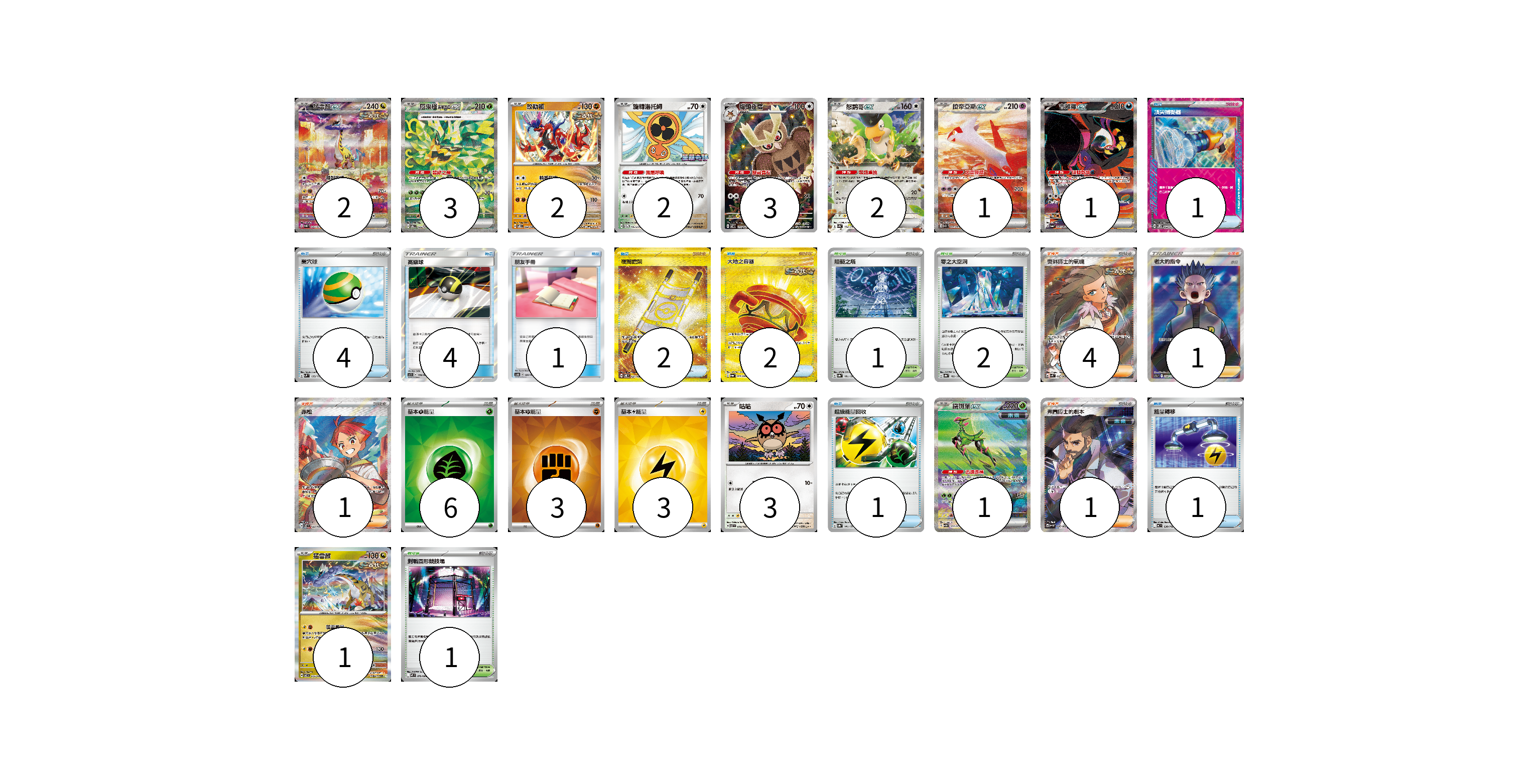牌組構築方案 以此牌組為基礎新構築牌組 顯示卡面 顯示列表 寶可夢卡(21) 2 3 2 2 3 2 1 1 3 1 1 物品卡(16) 1 4 4 1 2 2 1 1 支援者卡(7) 4 1 1 1 競技場卡(4) 1 2 1 能量卡(12) 6 3 3 寶可夢卡(21) 卡牌名稱 張數 卡牌名稱 張數 猛雷鼓ex SV5K 095/071 02 厄鬼椪 碧草面具ex SV6 125/101 03 故勒頓 SV8 069/106 02 旋轉洛托姆 SV-P 146/SV-P 02 貓頭夜鷹 SV7 114/102 03 怒鸚哥ex SV4a 154/190 02 拉帝亞斯ex SV7a 087/064 01 吉雉雞ex SV6a 089/064 01 咕咕 SV7 076/102 03 鐵斑葉ex SV5M 093/071 01 猛雷鼓 SV7 075/102 01 物品卡(16) 卡牌名稱 張數 卡牌名稱 張數 頂尖捕捉器 SV5M 062/071 01 巢穴球 SVM 133/175 04 高級球 AS5b 178/186 04 朋友手冊 AS6b 188/194 01 夜間擔架 SV8 137/106 02 大地之容器 SV6a 093/064 02 超級能量回收 SV8a 141/187 01 能量轉移 MC 638/742 01 支援者卡(7) 卡牌名稱 張數 卡牌名稱 張數 奧琳博士的氣魄 SV4K 085/066 04 老大的指令(赤日) S12a 250/172 01 赤松 SV7 123/102 01 弗圖博士的劇本 SV4M 086/066 01 競技場卡(4) 卡牌名稱 張數 卡牌名稱 張數 阻礙之塔 SV8a 181/187 01 零之大空洞 SV8a 182/187 02 對戰圓形競技場 M2 079/080 01 能量卡(12) 卡牌名稱 張數 卡牌名稱 張數 基本【草】能量 SVK GRA 06 基本【鬥】能量 SVK FIG 03 基本【雷】能量 SVK LIG 03 以此牌組為基礎新構築牌組 牌組編碼 xzJVBY-medBdX-verXjV copy 列印牌組單 牌組編碼已複製 分享至SNS