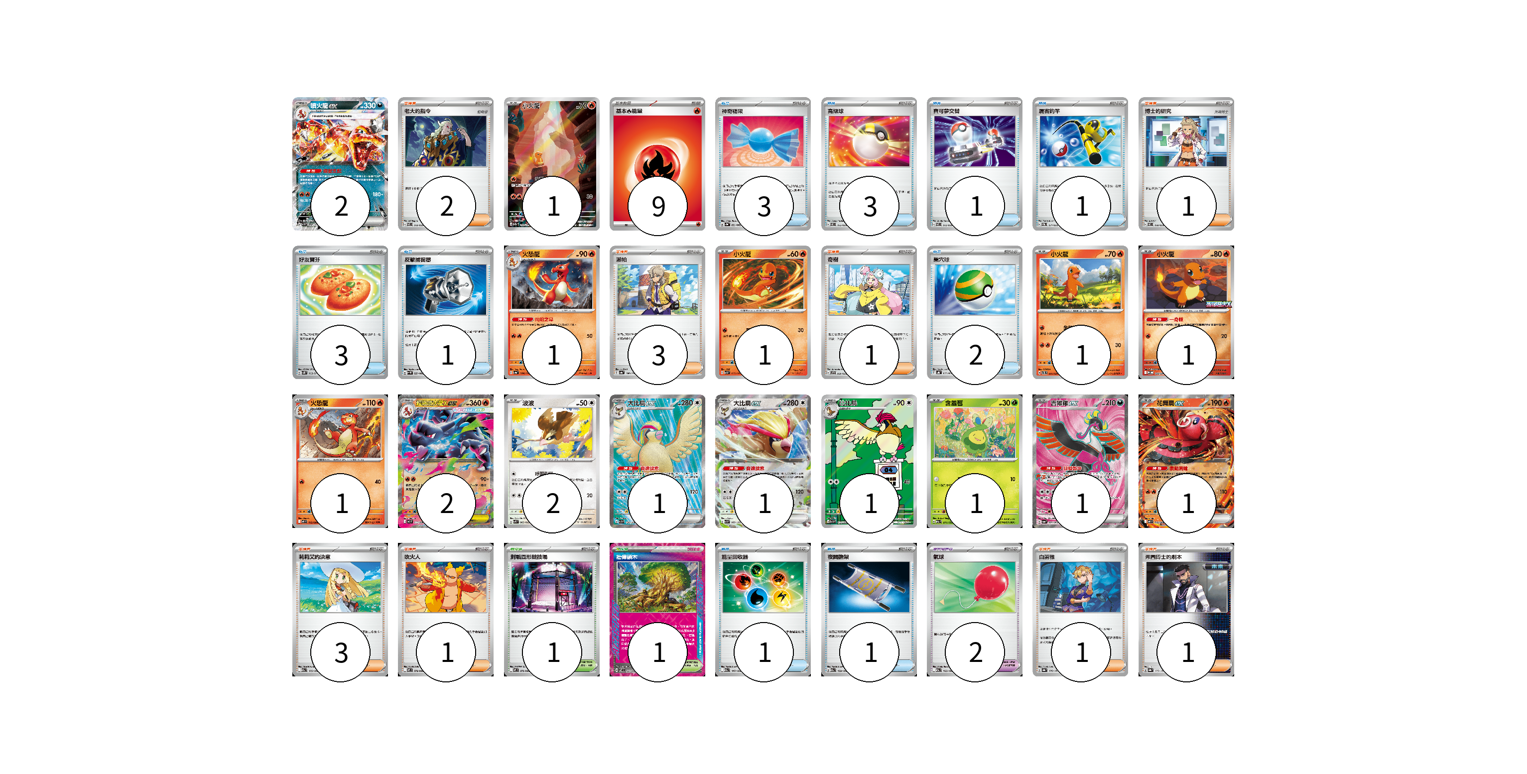 牌組構築方案 以此牌組為基礎新構築牌組 顯示卡面 顯示列表 寶可夢卡(18) 2 1 1 1 1 1 1 2 2 1 1 1 1 1 1 寶可夢道具(2) 2 物品卡(16) 3 3 1 1 3 1 2 1 1 支援者卡(13) 2 1 3 1 3 1 1 1 競技場卡(2) 1 1 能量卡(9) 9 寶可夢卡(18) 卡牌名稱 張數 卡牌名稱 張數 噴火龍ex SV3 066/108 02 小火龍 SV2a 168/165 01 火恐龍 SV4a 026/190 01 小火龍 SV3 012/108 01 小火龍 SVTL 001/021 01 小火龍 M-P 020/M-P 01 火恐龍 M2 012/080 01 超級噴火龍Xex M2 013/080 02 波波 SVK 003/042 02 大比鳥ex SV3 128/108 01 大比鳥ex SV3 089/108 01 比比鳥 SV3 119/108 01 含羞苞 M2a 011/193 01 吉雉雞ex SV6a 081/064 01 花舞鳥ex M2 018/080 01 寶可夢道具(2) 卡牌名稱 張數 卡牌名稱 張數 氣球 M2a 165/193 02 物品卡(16) 卡牌名稱 張數 卡牌名稱 張數 神奇糖果 SV3a 053/062 03 高級球 SVEL 012/020 03 寶可夢交替 SVEL 015/020 01 厲害釣竿 SVEM 011/020 01 好友寶芬 SV5K 063/071 03 反擊捕捉器 SV4M 059/066 01 巢穴球 SVHK 012/022 02 能量回收器 M2a 147/193 01 夜間擔架 M2a 159/193 01 支援者卡(13) 卡牌名稱 張數 卡牌名稱 張數 老大的指令 SVEL 019/020 02 博士的研究 SVEL 018/020 01 派帕 SV4a 180/190 03 奇樹 SVF 029/038 01 莉莉艾的決意 M2a 175/193 03 吹火人 M2 078/080 01 白蕾雅 SV8a 176/187 01 弗圖博士的劇本 SV8a 175/187 01 競技場卡(2) 卡牌名稱 張數 卡牌名稱 張數 對戰圓形競技場 M2 079/080 01 壯偉碩木 SV7 101/102 01 能量卡(9) 卡牌名稱 張數 卡牌名稱 張數 基本【火】能量 SVEL FIR 09 以此牌組為基礎新構築牌組 牌組編碼 yATXoH-ZbQaxI-gEIlFf copy 列印牌組單 牌組編碼已複製 分享至SNS