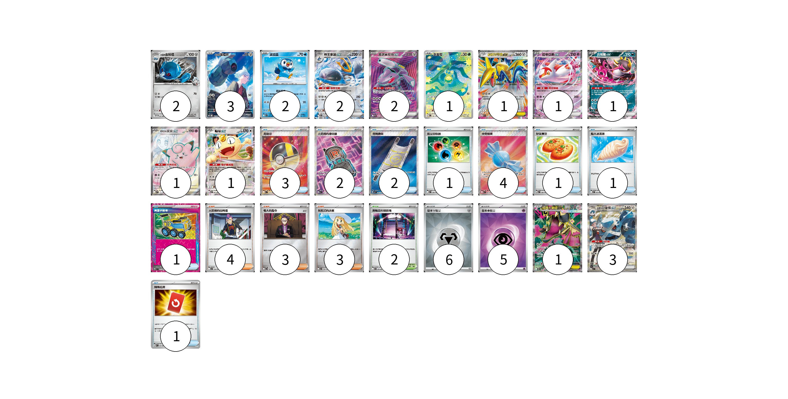 牌組構築方案 以此牌組為基礎新構築牌組 顯示卡面 顯示列表 寶可夢卡(21) 2 3 2 2 2 1 1 1 1 1 1 1 3 物品卡(16) 3 2 2 1 4 1 1 1 1 支援者卡(10) 4 3 3 競技場卡(2) 2 能量卡(11) 6 5 寶可夢卡(21) 卡牌名稱 張數 卡牌名稱 張數 <大吾的>金屬怪 SVOD 007/020 02 <大吾的>鐵啞鈴 SVOD 021/020 03 波加曼 M2 027/080 02 帝王拿波ex M2 058/080 02 蓋諾賽克特ex SV11B 164/086 02 含羞苞 M2a 196/193 01 超級盔甲鳥ex M3 054/080 01 拉帝亞斯ex M2a 075/193 01 吉雉雞ex M2a 114/193 01 莉莉艾的皮皮ex SV9 115/100 01 喵喵ex M3 061/080 01 超級大嘴娃ex M1L 080/063 01 <大吾的>巨金怪ex M2a 245/193 03 物品卡(16) 卡牌名稱 張數 卡牌名稱 張數 高級球 M2a 216/193 03 火箭隊的接收器 M2a 217/193 02 夜間擔架 M1L 083/063 02 能量回收器 MC 640/742 01 神奇糖果 M1S 082/063 04 好友寶芬 MC 648/742 01 超大冰淇淋 M2 073/080 01 貴重手推車 SVK 020/042 01 特殊紅牌 M4 072/083 01 支援者卡(10) 卡牌名稱 張數 卡牌名稱 張數 火箭隊的拉姆達 MC 734/742 04 老大的指令 MC 724/742 03 莉莉艾的決意 MC 729/742 03 競技場卡(2) 卡牌名稱 張數 卡牌名稱 張數 對戰圓形競技場 M2 079/080 02 能量卡(11) 卡牌名稱 張數 卡牌名稱 張數 基本【鋼】能量 SVOD MET 06 基本【超】能量 SVOD PSY 05 以此牌組為基礎新構築牌組 牌組編碼 yBWDlx-xhNcyk-pIZgBt copy 列印牌組單 牌組編碼已複製 分享至SNS