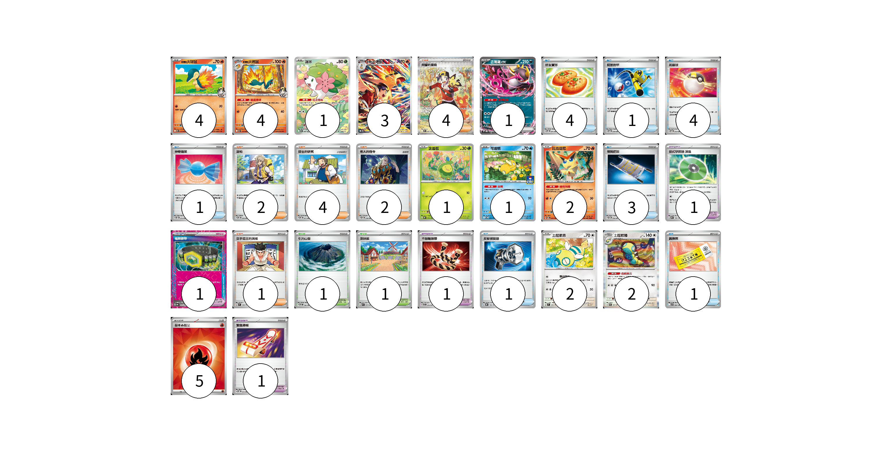 牌組構築方案 以此牌組為基礎新構築牌組 顯示卡面 顯示列表 寶可夢卡(21) 4 4 1 3 1 1 1 2 2 2 寶可夢道具(4) 1 1 1 1 物品卡(15) 4 1 4 1 3 1 1 支援者卡(13) 4 2 4 2 1 競技場卡(2) 1 1 能量卡(5) 5 寶可夢卡(21) 卡牌名稱 張數 卡牌名稱 張數 <阿響的>火球鼠 SV9a 015/063 04 <阿響的>火岩鼠 SV9a 016/063 04 謝米 SV9a 066/063 01 <阿響的>火爆獸 SV9a 070/063 03 吉雉雞ex SVOD 004/020 01 含羞苞 SV8a 001/187 01 可達鴨 SV-P 220/SV-P 01 比克提尼 SV8 012/106 02 土龍弟弟 SVM 095/175 02 土龍節節 SV5K 057/071 02 寶可夢道具(4) 卡牌名稱 張數 卡牌名稱 張數 招式學習器 演進 SV8a 160/187 01 極限腰帶 SV8a 159/187 01 不服輸頭帶 SVTL 016/021 01 緊急滑板 SVOD 015/020 01 物品卡(15) 卡牌名稱 張數 卡牌名稱 張數 好友寶芬 SVOD 011/020 04 厲害釣竿 SVOD 010/020 01 高級球 SVOD 012/020 04 神奇糖果 SVOD 013/020 01 夜間擔架 SVOM 016/021 03 反擊捕捉器 SV8a 139/187 01 調換票 SV9 090/100 01 支援者卡(13) 卡牌名稱 張數 卡牌名稱 張數 阿響的冒險 SV9a 089/063 04 派帕 SVOD 018/020 02 博士的研究 SVOD 017/020 04 老大的指令 SVOD 019/020 02 空手道王的演練 SVM 143/175 01 競技場卡(2) 卡牌名稱 張數 卡牌名稱 張數 引力山岳 SV8 106/106 01 深缽鎮 SVK 039/042 01 能量卡(5) 卡牌名稱 張數 卡牌名稱 張數 基本【火】能量 SVM FIR 05 以此牌組為基礎新構築牌組 牌組編碼 yByxnZ-bkySZP-gTRoRm copy 列印牌組單 牌組編碼已複製 分享至SNS