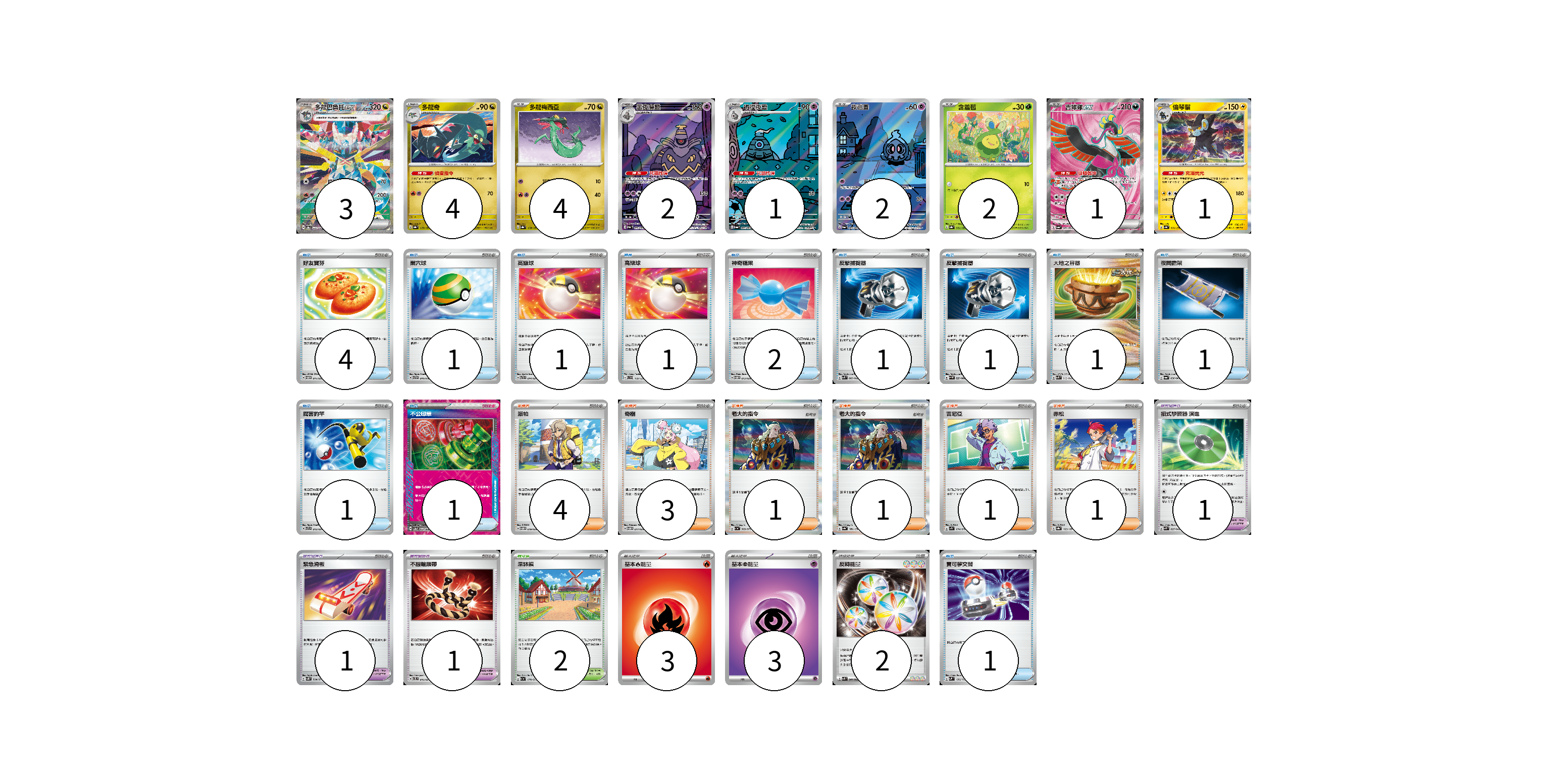 牌組構築方案 以此牌組為基礎新構築牌組 顯示卡面 顯示列表 寶可夢卡(20) 3 4 4 2 1 2 2 1 1 寶可夢道具(3) 1 1 1 物品卡(16) 4 1 1 1 2 1 1 1 1 1 1 1 支援者卡(11) 4 3 1 1 1 1 競技場卡(2) 2 能量卡(8) 3 3 2 寶可夢卡(20) 卡牌名稱 張數 卡牌名稱 張數 多龍巴魯托ex SV8a 221/187 03 多龍奇 SV8a 119/187 04 多龍梅西亞 SV8a 118/187 04 黑夜魔靈 SV6a 070/064 02 彷徨夜靈 SV6a 069/064 01 夜巡靈 SV6a 068/064 02 含羞苞 SV8a 001/187 02 吉雉雞ex SV6a 081/064 01 倫琴貓 SV4a 061/190 01 寶可夢道具(3) 卡牌名稱 張數 卡牌名稱 張數 招式學習器 演進 SVK 025/042 01 緊急滑板 SV5K 064/071 01 不服輸頭帶 SVTL 016/021 01 物品卡(16) 卡牌名稱 張數 卡牌名稱 張數 好友寶芬 SVTM 011/022 04 巢穴球 SVTH 010/018 01 高級球 SVTR 014/021 01 高級球 SVD 119/139 01 神奇糖果 SVTM 013/022 02 反擊捕捉器 SVK 009/042 01 反擊捕捉器 SV4M 059/066 01 大地之容器 SVK 012/042 01 夜間擔架 SV6a 056/064 01 厲害釣竿 SVTR 012/021 01 不公印章 SV5a 053/066 01 寶可夢交替 SVM 136/175 01 支援者卡(11) 卡牌名稱 張數 卡牌名稱 張數 派帕 SVTM 019/022 04 奇樹 SVTM 017/022 03 老大的指令 SV1a 069/073 01 老大的指令 SV4a 181/190 01 吉尼亞 SV1S 074/078 01 赤松 SV8a 163/187 01 競技場卡(2) 卡牌名稱 張數 卡牌名稱 張數 深缽鎮 SV1a 070/073 02 能量卡(8) 卡牌名稱 張數 卡牌名稱 張數 基本【火】能量 SVTL FIR 03 基本超能量 sv-p PSY 03 反轉能量 SVK 041/042 02 以此牌組為基礎新構築牌組 牌組編碼 yCsjwT-VASoLU-agAyXl copy 列印牌組單 牌組編碼已複製 分享至SNS