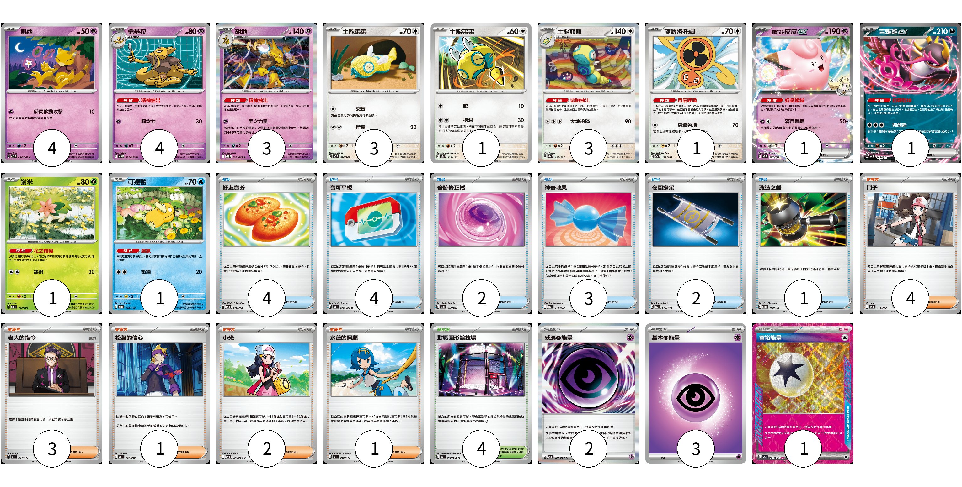牌組構築方案 以此牌組為基礎新構築牌組 顯示卡面 顯示列表 寶可夢卡(23) 4 4 3 3 1 3 1 1 1 1 1 物品卡(16) 4 4 2 3 2 1 支援者卡(11) 4 3 1 2 1 競技場卡(4) 4 能量卡(6) 2 3 1 寶可夢卡(23) 卡牌名稱 張數 卡牌名稱 張數 凱西 M1S 036/063 04 勇基拉 M1S 037/063 04 胡地 M1S 038/063 03 土龍弟弟 MC 574/742 03 土龍弟弟 SV8a 129/187 01 土龍節節 SV8a 130/187 03 旋轉洛托姆 M2a 139/193 01 莉莉艾的皮皮ex MC 287/742 01 吉雉雞ex MC 489/742 01 謝米 M2a 012/193 01 可達鴨 M2a 032/193 01 物品卡(16) 卡牌名稱 張數 卡牌名稱 張數 好友寶芬 MC 648/742 04 寶可平板 M3 070/080 04 奇跡修正檔 MBD 017/022 02 神奇糖果 MBG 013/022 03 夜間擔架 MC 670/742 02 改造之錘 M2a 148/193 01 支援者卡(11) 卡牌名稱 張數 卡牌名稱 張數 鬥子 MC 718/742 04 老大的指令 MC 724/742 03 松葉的信心 MC 727/742 01 小光 M2 077/080 02 水蓮的照顧 MC 712/742 01 競技場卡(4) 卡牌名稱 張數 卡牌名稱 張數 對戰圓形競技場 M2 079/080 04 能量卡(6) 卡牌名稱 張數 卡牌名稱 張數 感應【超】能量 M3 079/080 02 基本【超】能量 M-P PSY 03 富裕能量 SV7a 064/064 01 以此牌組為基礎新構築牌組 牌組編碼 yDOMIN-kbmejT-ujdiOo copy 列印牌組單 牌組編碼已複製 分享至SNS