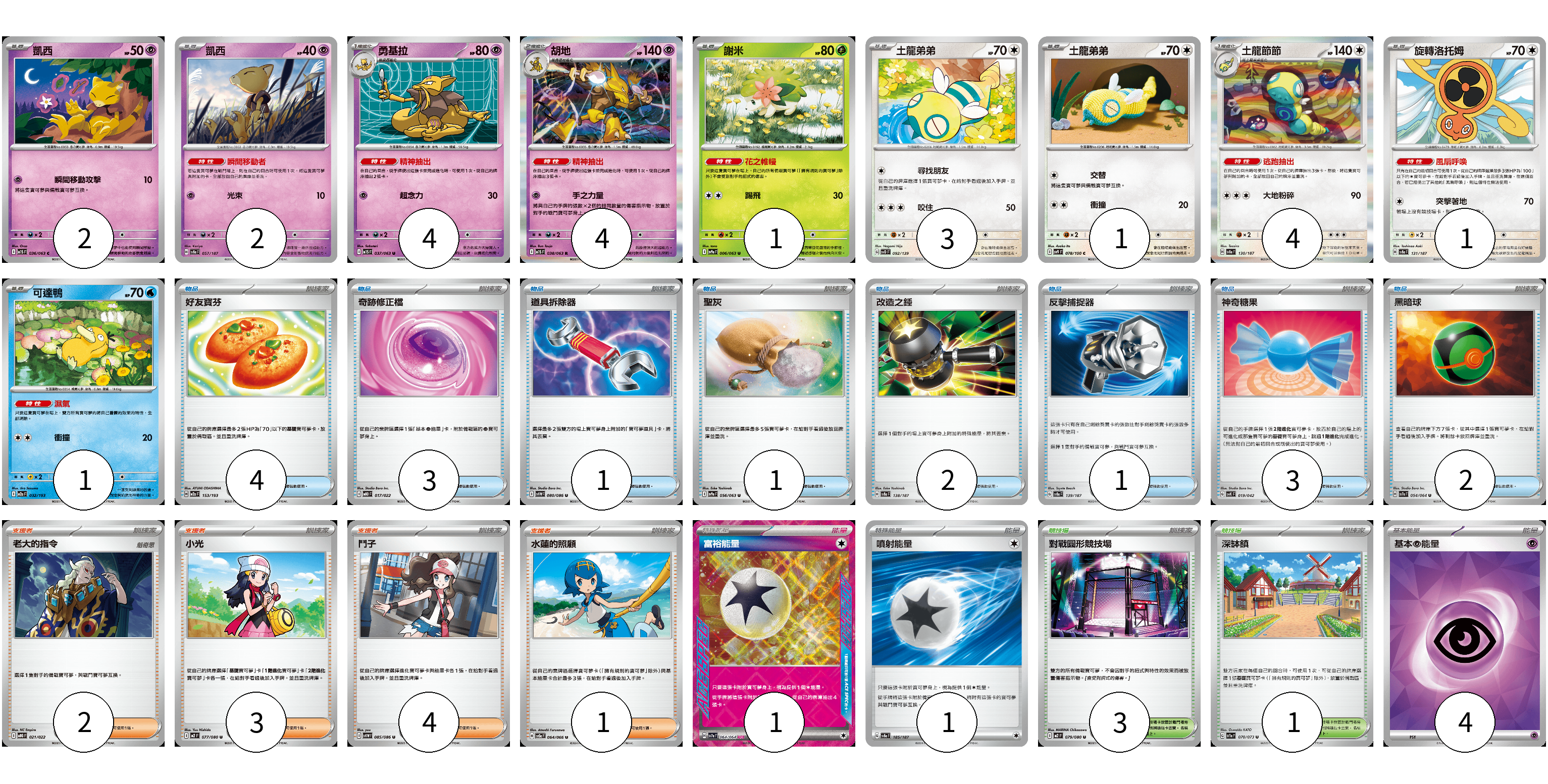 牌組構築方案 以此牌組為基礎新構築牌組 顯示卡面 顯示列表 寶可夢卡(23) 2 2 4 4 1 3 1 4 1 1 物品卡(17) 4 3 1 1 2 1 3 2 支援者卡(10) 2 3 4 1 競技場卡(4) 3 1 能量卡(6) 1 1 4 寶可夢卡(23) 卡牌名稱 張數 卡牌名稱 張數 凱西 M1S 036/063 02 凱西 SV8a 057/187 02 勇基拉 M1S 037/063 04 胡地 M1S 038/063 04 謝米 SV9a 006/063 01 土龍弟弟 SVD 092/139 03 土龍弟弟 SV9 078/100 01 土龍節節 SV8a 130/187 04 旋轉洛托姆 SV8a 131/187 01 可達鴨 M2a 032/193 01 物品卡(17) 卡牌名稱 張數 卡牌名稱 張數 好友寶芬 M2a 153/193 04 奇跡修正檔 MBD 017/022 03 道具拆除器 SV11W 080/086 01 聖灰 SV9a 056/063 01 改造之錘 SV8a 138/187 02 反擊捕捉器 SV8a 139/187 01 神奇糖果 SVK 019/042 03 黑暗球 SV7a 054/064 02 支援者卡(10) 卡牌名稱 張數 卡牌名稱 張數 老大的指令 MBG 021/022 02 小光 M2 077/080 03 鬥子 SV11W 085/086 04 水蓮的照顧 SV5a 064/066 01 競技場卡(4) 卡牌名稱 張數 卡牌名稱 張數 對戰圓形競技場 M2 079/080 03 深缽鎮 SV1a 070/073 01 能量卡(6) 卡牌名稱 張數 卡牌名稱 張數 富裕能量 SV7a 064/064 01 噴射能量 SV8a 185/187 01 基本【超】能量 SVK PSY 04 以此牌組為基礎新構築牌組 牌組編碼 yDXzlt-qGFHTS-woTinb copy 列印牌組單 牌組編碼已複製 分享至SNS