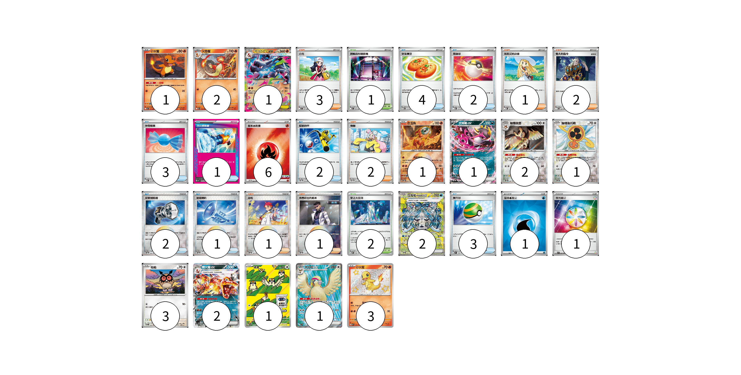 牌組構築方案 以此牌組為基礎新構築牌組 顯示卡面 顯示列表 寶可夢卡(21) 1 2 1 1 1 2 1 2 3 2 1 1 3 物品卡(18) 4 2 3 1 2 2 1 3 支援者卡(10) 3 1 2 2 1 1 競技場卡(3) 1 2 能量卡(8) 6 1 1 寶可夢卡(21) 卡牌名稱 張數 卡牌名稱 張數 小火龍 M2 011/080 01 火恐龍 M2 012/080 02 超級噴火龍Xex M2 013/080 01 古玉魚 SV8a 025/187 01 吉雉雞ex SV8a 104/187 01 貓頭夜鷹 SV8a 128/187 02 旋轉洛托姆 SV8a 131/187 01 厄鬼椪 水井面具ex SV8a 208/187 02 咕咕 SV7 076/102 03 噴火龍ex SV3 066/108 02 波波 SV3 118/108 01 大比鳥ex SV3 128/108 01 小火龍 SV4a 210/190 03 物品卡(18) 卡牌名稱 張數 卡牌名稱 張數 好友寶芬 MBD 013/022 04 高級球 MBD 014/022 02 神奇糖果 MBG 013/022 03 頂尖捕捉器 MBG 014/022 01 厲害釣竿 SVOD 010/020 02 反擊捕捉器 SV8a 139/187 02 玻璃喇叭 SV8a 140/187 01 巢穴球 SVM 133/175 03 支援者卡(10) 卡牌名稱 張數 卡牌名稱 張數 小光 M2 077/080 03 莉莉艾的決意 MBD 021/022 01 老大的指令 MBD 020/022 02 奇樹 SVOD 016/020 02 赤松 SV8a 163/187 01 弗圖博士的劇本 SV8a 175/187 01 競技場卡(3) 卡牌名稱 張數 卡牌名稱 張數 對戰圓形競技場 M2 079/080 01 零之大空洞 SV8a 182/187 02 能量卡(8) 卡牌名稱 張數 卡牌名稱 張數 基本【火】能量 M-P 032/M-P 06 基本【水】能量 SVM WAT 01 夜光能量 SVK 042/042 01 以此牌組為基礎新構築牌組 牌組編碼 yFIJAb-lHJYKE-HiQrCX copy 列印牌組單 牌組編碼已複製 分享至SNS