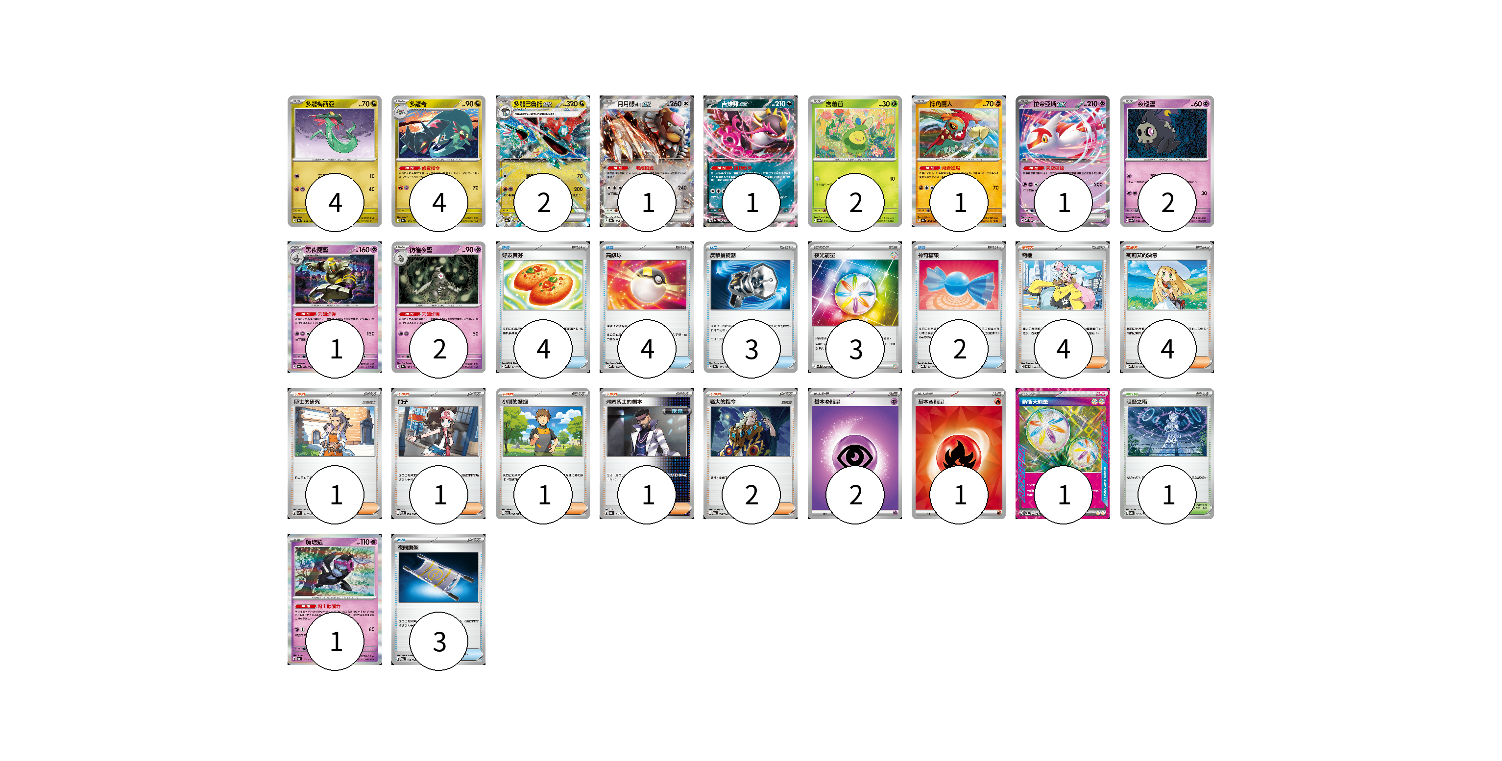 牌組構築方案 以此牌組為基礎新構築牌組 顯示卡面 顯示列表 寶可夢卡(22) 4 4 2 1 1 2 1 1 2 1 2 1 物品卡(16) 4 4 3 2 3 支援者卡(14) 4 4 1 1 1 1 2 競技場卡(1) 1 能量卡(7) 3 2 1 1 寶可夢卡(22) 卡牌名稱 張數 卡牌名稱 張數 多龍梅西亞 SV8a 118/187 04 多龍奇 SV8a 119/187 04 多龍巴魯托ex SV8a 120/187 02 月月熊 赫月ex SV8a 134/187 01 吉雉雞ex SV8a 104/187 01 含羞苞 SV8a 001/187 02 摔角鷹人 SV8a 084/187 01 拉帝亞斯ex MBD 003/022 01 夜巡靈 SV8a 064/187 02 黑夜魔靈 SV6a 020/064 01 彷徨夜靈 SV8a 065/187 02 願增猿 SV8a 075/187 01 物品卡(16) 卡牌名稱 張數 卡牌名稱 張數 好友寶芬 MBD 013/022 04 高級球 MBD 014/022 04 反擊捕捉器 SV8a 139/187 03 神奇糖果 MBG 013/022 02 夜間擔架 MBD 016/022 03 支援者卡(14) 卡牌名稱 張數 卡牌名稱 張數 奇樹 SVOD 016/020 04 莉莉艾的決意 MBD 021/022 04 博士的研究 SVM 170/175 01 鬥子 SV11W 085/086 01 小剛的發掘 SV9 096/100 01 弗圖博士的劇本 SV8a 175/187 01 老大的指令 MBD 020/022 02 競技場卡(1) 卡牌名稱 張數 卡牌名稱 張數 阻礙之塔 SV8a 181/187 01 能量卡(7) 卡牌名稱 張數 卡牌名稱 張數 夜光能量 SVK 042/042 03 基本【超】能量 MBD PSY 02 基本【火】能量 SVQL FIR 01 新衝天能量 SV5K 071/071 01 以此牌組為基礎新構築牌組 牌組編碼 yFlchS-tLtlKS-ZLUCdt copy 列印牌組單 牌組編碼已複製 分享至SNS