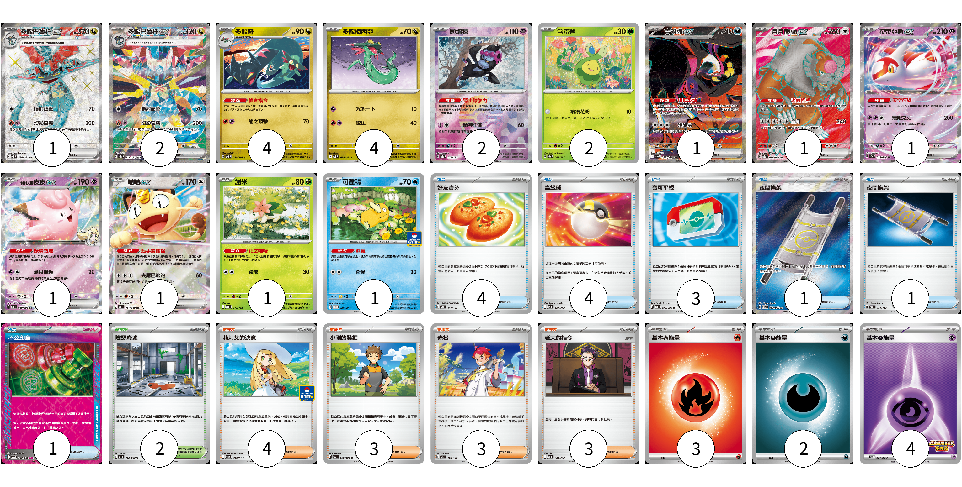 牌組構築方案 以此牌組為基礎新構築牌組 顯示卡面 顯示列表 寶可夢卡(22) 1 2 4 4 2 2 1 1 1 1 1 1 1 物品卡(14) 4 4 3 1 1 1 支援者卡(13) 4 3 3 3 競技場卡(2) 2 能量卡(9) 3 2 4 寶可夢卡(22) 卡牌名稱 張數 卡牌名稱 張數 多龍巴魯托ex SV6 120/101 01 多龍巴魯托ex SV8a 221/187 02 多龍奇 SV6 080/101 04 多龍梅西亞 SV6 079/101 04 願增猿 SV8a 075/187 02 含羞苞 SV8a 001/187 02 吉雉雞ex SV6a 089/064 01 月月熊 赫月 ex SV5a 084/066 01 拉帝亞斯ex SV7a 019/064 01 莉莉艾的皮皮ex M2a 060/193 01 喵喵ex M3 061/080 01 謝米 M2a 012/193 01 可達鴨 SV-P 220/SV-P 01 物品卡(14) 卡牌名稱 張數 卡牌名稱 張數 好友寶芬 SV8a 147/187 04 高級球 MC 651/742 04 寶可平板 M3 070/080 03 夜間擔架 M1L 083/063 01 夜間擔架 SV8a 151/187 01 不公印章 SV5a 053/066 01 支援者卡(13) 卡牌名稱 張數 卡牌名稱 張數 莉莉艾的決意 M-P 018/M-P 04 小剛的發掘 SV9 096/100 03 赤松 SV8a 163/187 03 老大的指令 MC 724/742 03 競技場卡(2) 卡牌名稱 張數 卡牌名稱 張數 險惡廢墟 M1L 063/063 02 能量卡(9) 卡牌名稱 張數 卡牌名稱 張數 基本【火】能量 MC FIR 03 基本【惡】能量 MC DAR 02 基本【超】能量 SV-P 261/SV-P 04 以此牌組為基礎新構築牌組 牌組編碼 yIiyoT-kZoqFX-tRspwi copy 列印牌組單 牌組編碼已複製 分享至SNS