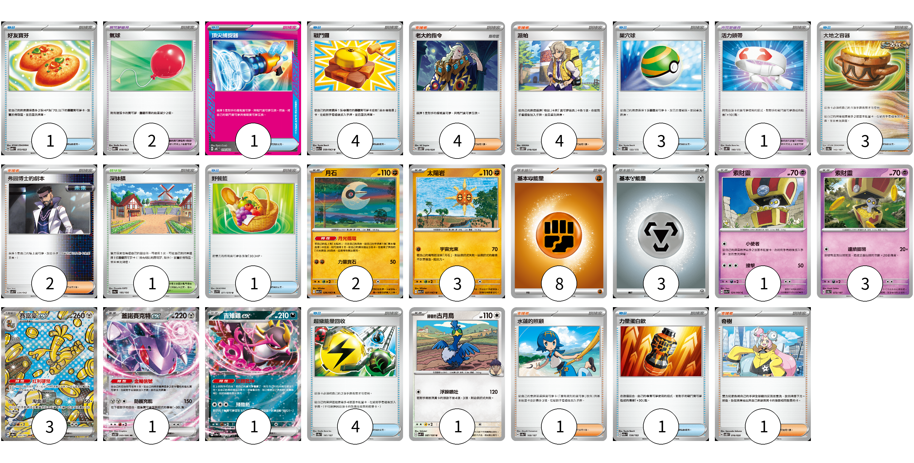 牌組構築方案 以此牌組為基礎新構築牌組 顯示卡面 顯示列表 寶可夢卡(15) 2 3 1 3 3 1 1 1 寶可夢道具(1) 1 物品卡(20) 1 2 1 4 3 3 1 4 1 支援者卡(12) 4 4 2 1 1 競技場卡(1) 1 能量卡(11) 8 3 寶可夢卡(15) 卡牌名稱 張數 卡牌名稱 張數 月石 M1L 026/063 02 太陽岩 M1L 027/063 03 索財靈 SV7a 024/064 01 索財靈 SV8a 073/187 03 賽富豪ex SV8a 220/187 03 蓋諾賽克特ex SV11B 069/086 01 吉雉雞ex SV8a 104/187 01 赫普的古月鳥 SV9 087/100 01 寶可夢道具(1) 卡牌名稱 張數 卡牌名稱 張數 活力頭帶 SVM 140/175 01 物品卡(20) 卡牌名稱 張數 卡牌名稱 張數 好友寶芬 MBD 013/022 01 氣球 MBD 018/022 02 頂尖捕捉器 MBG 014/022 01 戰鬥鑼 M1L 059/063 04 巢穴球 SVM 133/175 03 大地之容器 SV8a 143/187 03 野餐籃 SV1V 071/078 01 超級能量回收 SV8a 141/187 04 力量蛋白飲 M2a 154/193 01 支援者卡(12) 卡牌名稱 張數 卡牌名稱 張數 老大的指令 SVOD 019/020 04 派帕 SVOD 018/020 04 弗圖博士的劇本 SVK 034/042 02 水蓮的照顧 SV8a 168/187 01 奇樹 SVOD 016/020 01 競技場卡(1) 卡牌名稱 張數 卡牌名稱 張數 深缽鎮 SV4a 185/190 01 能量卡(11) 卡牌名稱 張數 卡牌名稱 張數 基本【鬥】能量 M-P FIG 08 基本【鋼】能量 M-P MET 03 以此牌組為基礎新構築牌組 牌組編碼 yIqAnL-NKVJLj-OvYxsn copy 列印牌組單 牌組編碼已複製 分享至SNS