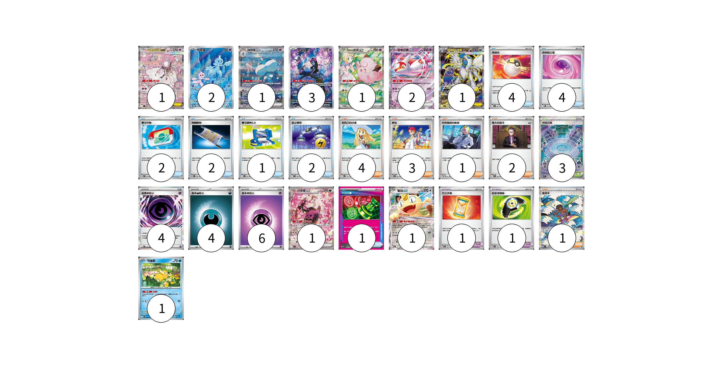 牌組構築方案 以此牌組為基礎新構築牌組 顯示卡面 顯示列表 寶可夢卡(14) 1 2 1 3 1 2 1 1 1 1 寶可夢道具(2) 1 1 物品卡(16) 4 4 2 2 1 2 1 支援者卡(11) 4 3 1 2 1 競技場卡(3) 3 能量卡(14) 4 4 6 寶可夢卡(14) 卡牌名稱 張數 卡牌名稱 張數 超級蒂安希ex M2a 238/193 01 輕飄飄 SV11W 124/086 02 胖嘟嘟ex SV11W 170/086 01 願增猿 SV6 107/101 03 莉莉艾的皮皮ex SV9 126/100 01 拉帝亞斯ex M2a 075/193 02 超級阿勃梭魯ex M1L 079/063 01 吉雉雞ex M2a 244/193 01 喵喵ex M3 061/080 01 可達鴨 M2a 032/193 01 寶可夢道具(2) 卡牌名稱 張數 卡牌名稱 張數 力之沙漏 MC 683/742 01 反擊增幅器 MC 679/742 01 物品卡(16) 卡牌名稱 張數 卡牌名稱 張數 高級球 MC 651/742 04 奇跡修正檔 MBD 017/022 04 寶可平板 M3 070/080 02 夜間擔架 MC 670/742 02 寶可裝置3.0 MC 660/742 01 能量轉移 MC 638/742 02 不公印章 MC 633/742 01 支援者卡(11) 卡牌名稱 張數 卡牌名稱 張數 莉莉艾的決意 M2a 175/193 04 赤松 MC 696/742 03 阿克羅瑪的執著 SVOM 017/021 01 老大的指令 MC 724/742 02 衝浪手 M2a 249/193 01 競技場卡(3) 卡牌名稱 張數 卡牌名稱 張數 神秘花園 M1S 086/063 03 能量卡(14) 卡牌名稱 張數 卡牌名稱 張數 感應【超】能量 M3 079/080 04 基本【惡】能量 MC DAR 04 基本【超】能量 MC PSY 06 以此牌組為基礎新構築牌組 牌組編碼 yLJSIC-ZBPGbT-ELxayL copy 列印牌組單 牌組編碼已複製 分享至SNS