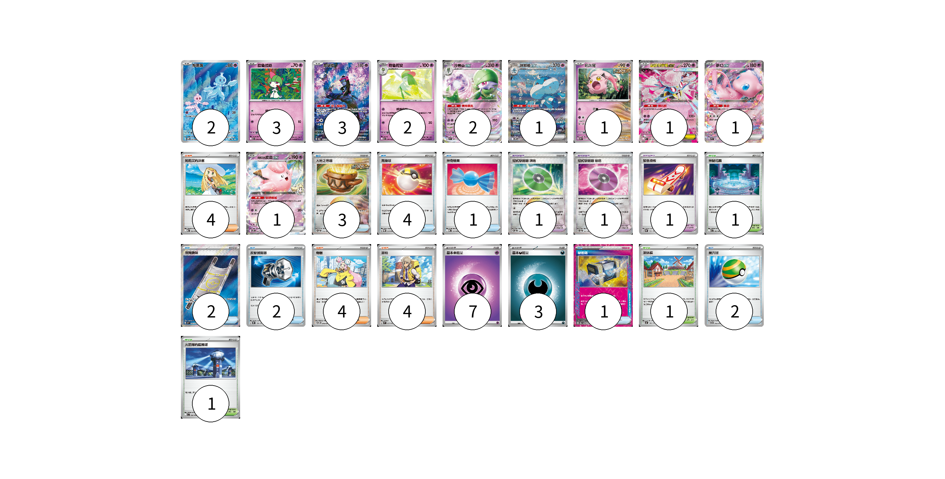 牌組構築方案 以此牌組為基礎新構築牌組 顯示卡面 顯示列表 寶可夢卡(17) 2 3 3 2 2 1 1 1 1 1 寶可夢道具(3) 1 1 1 物品卡(15) 3 4 1 2 2 1 2 支援者卡(12) 4 4 4 競技場卡(3) 1 1 1 能量卡(10) 7 3 寶可夢卡(17) 卡牌名稱 張數 卡牌名稱 張數 輕飄飄 SV11W 124/086 02 拉魯拉絲 M1S 040/063 03 願增猿 SV6 107/101 03 奇魯莉安 M1S 041/063 02 沙奈朵ex SV4a 082/190 02 胖嘟嘟ex SV11W 170/086 01 吼叫尾 SV8a 071/187 01 超級蒂安希ex MBD 006/022 01 夢幻ex SV2a 151/165 01 莉莉艾的皮皮ex SV9 033/100 01 寶可夢道具(3) 卡牌名稱 張數 卡牌名稱 張數 招式學習器 演進 SV8a 160/187 01 招式學習器 衰退 SV8a 161/187 01 緊急滑板 SV8a 153/187 01 物品卡(15) 卡牌名稱 張數 卡牌名稱 張數 大地之容器 SV8a 143/187 03 高級球 SVQP 015/023 04 神奇糖果 MBG 013/022 01 夜間擔架 M1L 083/063 02 反擊捕捉器 SV8a 139/187 02 秘密箱 SV6 092/101 01 巢穴球 SVTG 012/019 02 支援者卡(12) 卡牌名稱 張數 卡牌名稱 張數 莉莉艾的決意 MBG 022/022 04 奇樹 SVOM 018/021 04 派帕 SVK 035/042 04 競技場卡(3) 卡牌名稱 張數 卡牌名稱 張數 神秘花園 M1S 063/063 01 深缽鎮 SV4a 185/190 01 火箭隊的監視塔 SV10 096/098 01 能量卡(10) 卡牌名稱 張數 卡牌名稱 張數 基本【超】能量 MBD PSY 07 基本【惡】能量 MBG DAR 03 以此牌組為基礎新構築牌組 牌組編碼 yMwRHs-QrmxSA-gsVJZO copy 列印牌組單 牌組編碼已複製 分享至SNS