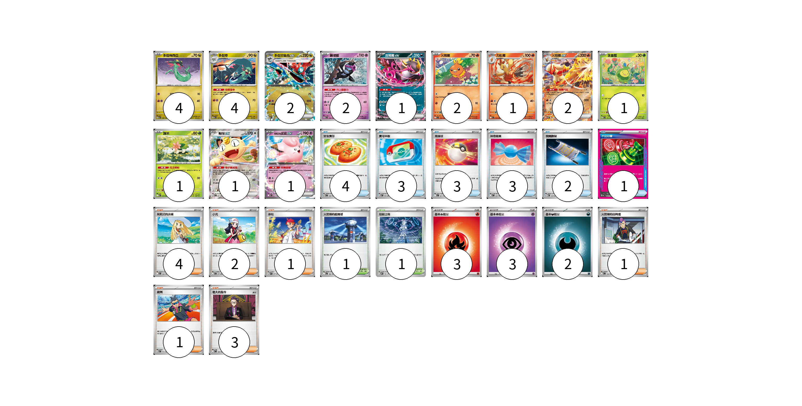 牌組構築方案 以此牌組為基礎新構築牌組 顯示卡面 顯示列表 寶可夢卡(22) 4 4 2 2 1 2 1 2 1 1 1 1 物品卡(16) 4 3 3 3 2 1 支援者卡(12) 4 2 1 1 1 3 競技場卡(2) 1 1 能量卡(8) 3 3 2 寶可夢卡(22) 卡牌名稱 張數 卡牌名稱 張數 多龍梅西亞 MC 546/742 04 多龍奇 MC 547/742 04 多龍巴魯托ex MC 548/742 02 願增猿 MC 358/742 02 吉雉雞ex MC 489/742 01 火稚雞 SV10 018/098 02 力壯雞 SV10 019/098 01 火焰雞ex SVM 016/175 02 含羞苞 M2a 011/193 01 謝米 M2a 012/193 01 喵喵ex M3 061/080 01 莉莉艾的皮皮ex MC 287/742 01 物品卡(16) 卡牌名稱 張數 卡牌名稱 張數 好友寶芬 MC 648/742 04 寶可平板 M3 070/080 03 高級球 MC 651/742 03 神奇糖果 MC 655/742 03 夜間擔架 MBD 016/022 02 不公印章 MC 633/742 01 支援者卡(12) 卡牌名稱 張數 卡牌名稱 張數 莉莉艾的決意 MC 729/742 04 小光 M2 077/080 02 赤松 SVK 027/042 01 火箭隊的拉姆達 MC 734/742 01 裁判 MC 711/742 01 老大的指令 MC 724/742 03 競技場卡(2) 卡牌名稱 張數 卡牌名稱 張數 火箭隊的監視塔 M2a 189/193 01 阻礙之塔 SV8a 181/187 01 能量卡(8) 卡牌名稱 張數 卡牌名稱 張數 基本【火】能量 MC FIR 03 基本【超】能量 MC PSY 03 基本【惡】能量 MC DAR 02 以此牌組為基礎新構築牌組 牌組編碼 yPRfak-ZrYESQ-hHuKhh copy 列印牌組單 牌組編碼已複製 分享至SNS
