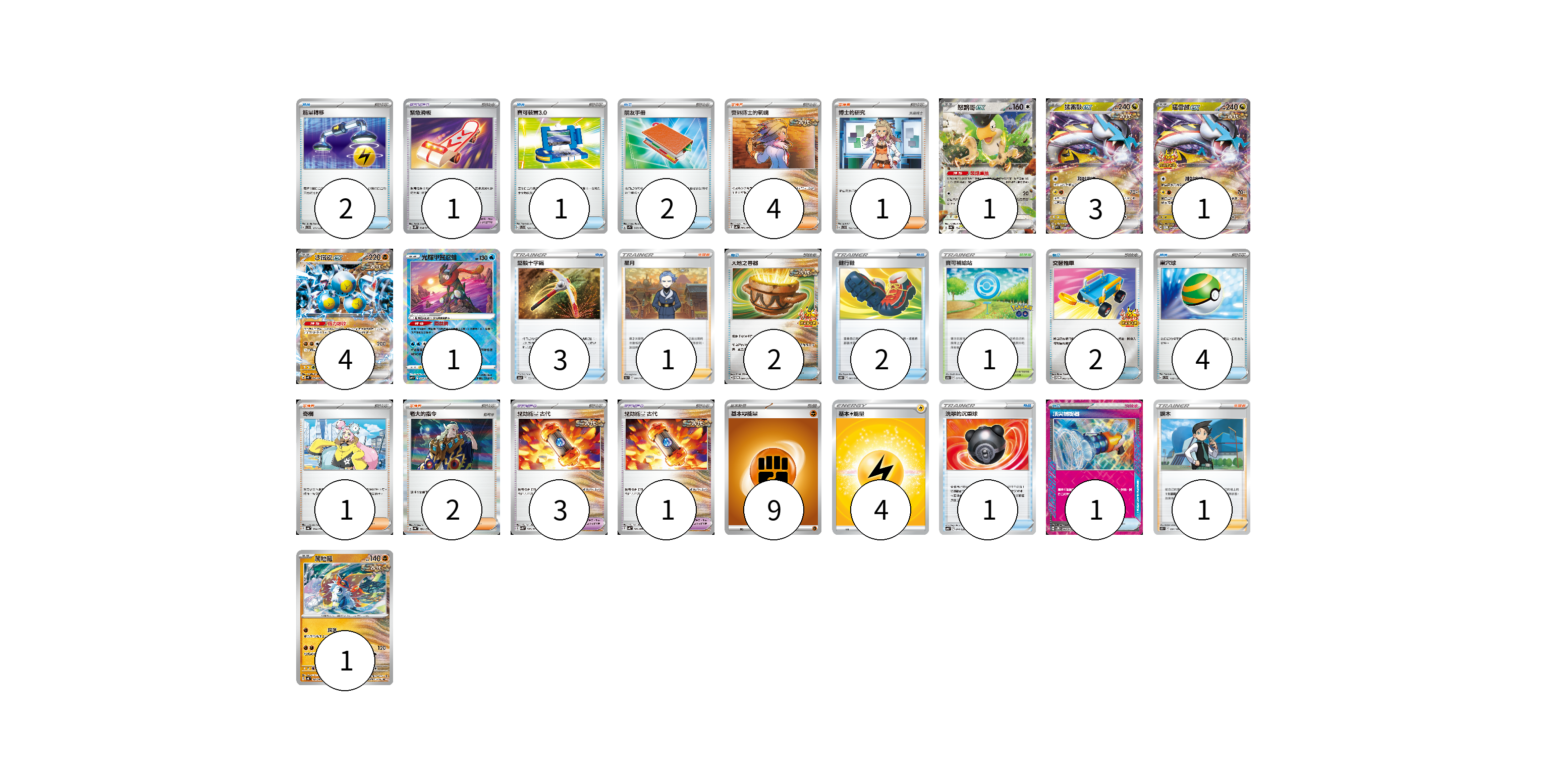 牌組構築方案 以此牌組為基礎新構築牌組 顯示卡面 顯示列表 寶可夢卡(11) 1 3 1 4 1 1 寶可夢道具(5) 1 3 1 物品卡(20) 2 1 2 3 2 2 2 4 1 1 支援者卡(10) 4 1 1 1 2 1 競技場卡(1) 1 能量卡(13) 9 4 寶可夢卡(11) 卡牌名稱 張數 卡牌名稱 張數 怒鸚哥ex SV4a 154/190 01 猛雷鼓ex SV5K 053/071 03 猛雷鼓ex SV-P 081/SV-P 01 沙鐵皮ex SV4K 042/066 04 光輝甲賀忍蛙 SVF 004/038 01 爬地翅 SV4K 041/066 01 寶可夢道具(5) 卡牌名稱 張數 卡牌名稱 張數 緊急滑板 SV5K 064/071 01 驅勁能量 古代 SV5K 065/071 03 驅勁能量 古代 SV4K 061/066 01 物品卡(20) 卡牌名稱 張數 卡牌名稱 張數 能量轉移 SVD 111/139 02 寶可裝置3.0 SVD 121/139 01 朋友手冊 SV1S 069/078 02 堅毅十字鎬 S12a 133/172 03 大地之容器 SV-P 084/SV-P 02 健行鞋 S10D 061/067 02 交替推車 SV-P 082/SV-P 02 巢穴球 SVD 118/139 04 洗翠的沉重球 SVB 014/028 01 頂尖捕捉器 SV5M 062/071 01 支援者卡(10) 卡牌名稱 張數 卡牌名稱 張數 奧琳博士的氣魄 SV4K 064/066 04 博士的研究(奧琳博士) SVD 135/139 01 星月 S9a 064/067 01 奇樹 SV4a 174/190 01 老大的指令 SV4a 181/190 02 捩木 S11 097/100 01 競技場卡(1) 卡牌名稱 張數 卡牌名稱 張數 寶可補給站 S10b 071/071 01 能量卡(13) 卡牌名稱 張數 卡牌名稱 張數 基本【鬥】能量 SVF FIG 09 基本【雷】能量 SI LIG 04 以此牌組為基礎新構築牌組 牌組編碼 yQPtAd-TMRmsn-cqXXtv copy 列印牌組單 牌組編碼已複製 分享至SNS