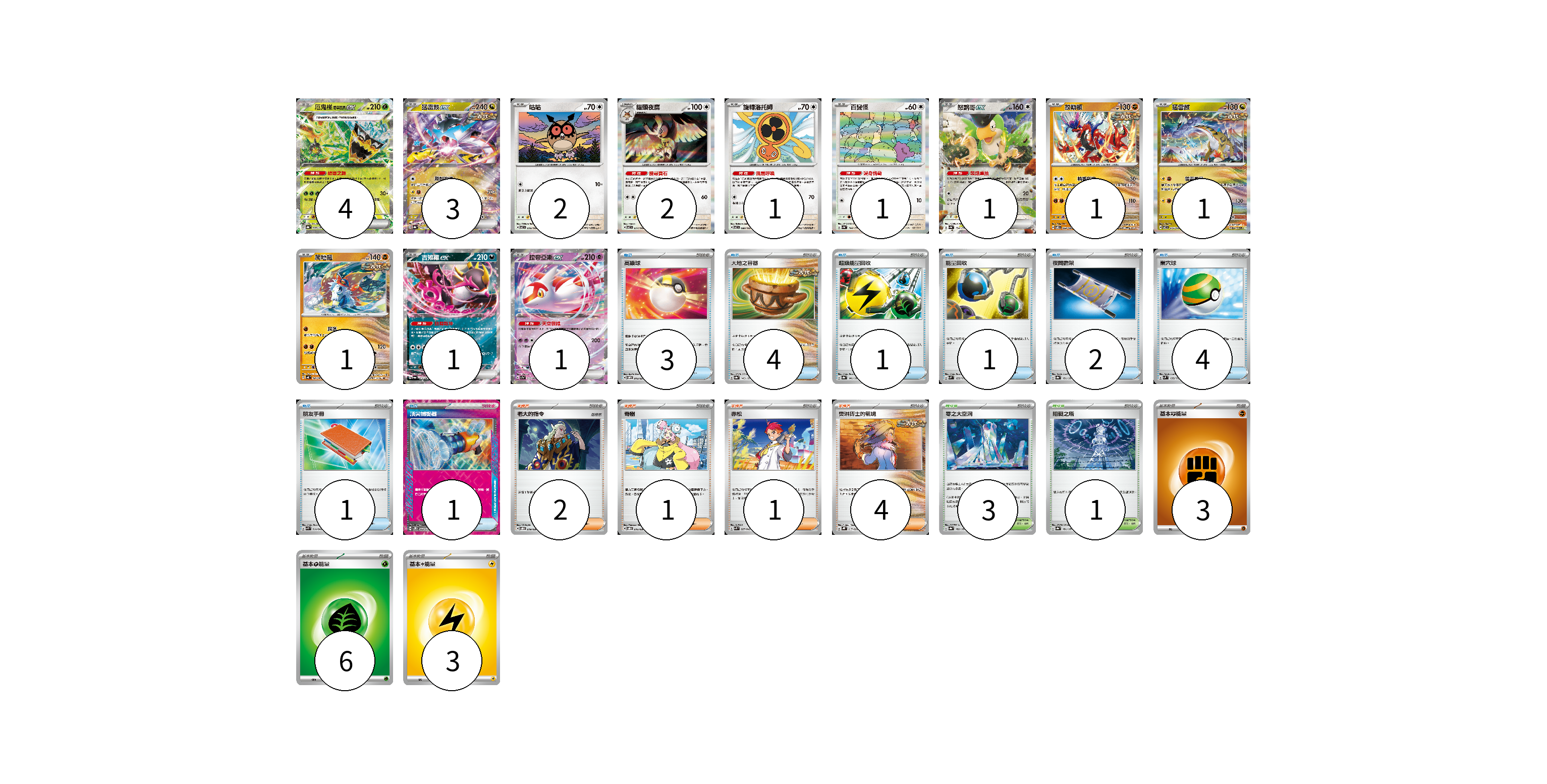 牌組構築方案 以此牌組為基礎新構築牌組 顯示卡面 顯示列表 寶可夢卡(19) 4 3 2 2 1 1 1 1 1 1 1 1 物品卡(17) 3 4 1 1 2 4 1 1 支援者卡(8) 2 1 1 4 競技場卡(4) 3 1 能量卡(12) 3 6 3 寶可夢卡(19) 卡牌名稱 張數 卡牌名稱 張數 厄鬼椪 碧草面具ex SV8a 020/187 04 猛雷鼓ex SV8a 124/187 03 咕咕 SV7 076/102 02 貓頭夜鷹 SV7 077/102 02 旋轉洛托姆 SV7 080/102 01 百變怪 SV4a 144/190 01 怒鸚哥ex SV4a 154/190 01 故勒頓 SV8 069/106 01 猛雷鼓 SV7 075/102 01 爬地翅 SV4K 041/066 01 吉雉雞ex SV6a 038/064 01 拉帝亞斯ex SV7a 019/064 01 物品卡(17) 卡牌名稱 張數 卡牌名稱 張數 高級球 SVOM 013/021 03 大地之容器 SV8a 143/187 04 超級能量回收 SV8a 141/187 01 能量回收 SVM 125/175 01 夜間擔架 SV8a 151/187 02 巢穴球 SVM 133/175 04 朋友手冊 SVK 014/042 01 頂尖捕捉器 SV5M 062/071 01 支援者卡(8) 卡牌名稱 張數 卡牌名稱 張數 老大的指令 SVOD 019/020 02 奇樹 SVOD 016/020 01 赤松 SVK 027/042 01 奧琳博士的氣魄 SVHK 017/022 04 競技場卡(4) 卡牌名稱 張數 卡牌名稱 張數 零之大空洞 SV8a 182/187 03 阻礙之塔 SV8a 181/187 01 能量卡(12) 卡牌名稱 張數 卡牌名稱 張數 基本【鬥】能量 SVF FIG 03 基本【草】能量 SVF GRA 06 基本【雷】能量 SVF LIG 03 以此牌組為基礎新構築牌組 牌組編碼 ySGHpX-zkpLdp-wqXFvv copy 列印牌組單 牌組編碼已複製 分享至SNS