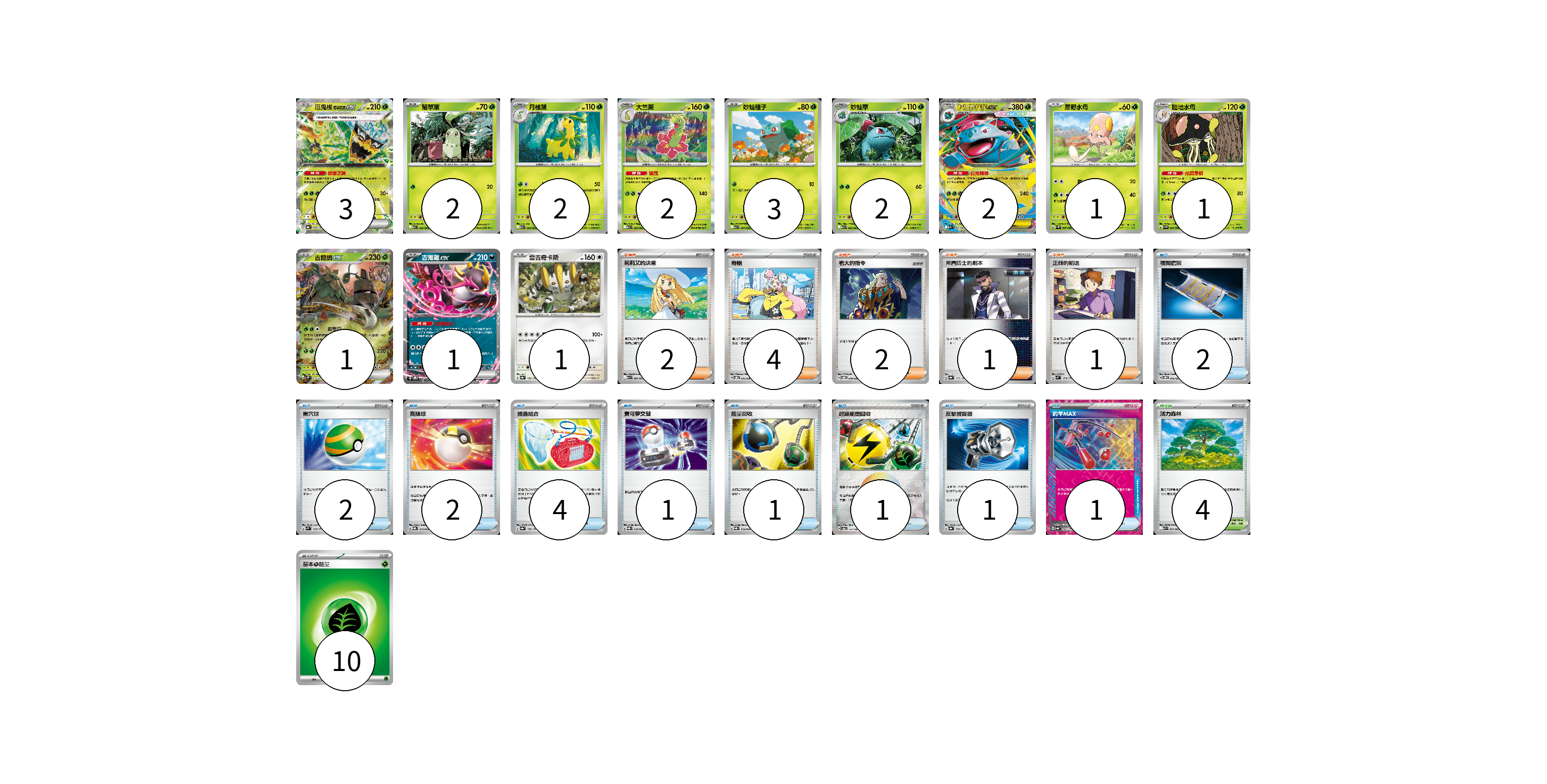 牌組構築方案 以此牌組為基礎新構築牌組 顯示卡面 顯示列表 寶可夢卡(21) 3 2 2 2 3 2 2 1 1 1 1 1 物品卡(15) 2 2 2 4 1 1 1 1 1 支援者卡(10) 2 4 2 1 1 競技場卡(4) 4 能量卡(10) 10 寶可夢卡(21) 卡牌名稱 張數 卡牌名稱 張數 厄鬼椪 碧草面具ex SV8a 020/187 03 菊草葉 M1S 003/063 02 月桂葉 M1S 004/063 02 大竺葵 M1S 005/063 02 妙蛙種子 M1L 001/063 03 妙蛙草 M1L 002/063 02 超級妙蛙花ex M1L 003/063 02 原野水母 SV4M 007/066 01 陸地水母 SV4M 008/066 01 古簡蝸ex SV2P 015/071 01 吉雉雞ex SVOD 004/020 01 雷吉奇卡斯 SV8a 132/187 01 物品卡(15) 卡牌名稱 張數 卡牌名稱 張數 夜間擔架 SVOM 016/021 02 巢穴球 SVM 133/175 02 高級球 SVQL 015/022 02 捕蟲組合 SV8a 150/187 04 寶可夢交替 SVQL 016/022 01 能量回收 SVQL 012/022 01 超級能量回收 SV8a 141/187 01 反擊捕捉器 SV8a 139/187 01 釣竿MAX SV8a 142/187 01 支援者卡(10) 卡牌名稱 張數 卡牌名稱 張數 莉莉艾的決意 M1L 062/063 02 奇樹 SVOD 016/020 04 老大的指令 SVOD 019/020 02 弗圖博士的劇本 SV8a 175/187 01 正輝的輸送 SVM 173/175 01 競技場卡(4) 卡牌名稱 張數 卡牌名稱 張數 活力森林 M1S 061/063 04 能量卡(10) 卡牌名稱 張數 卡牌名稱 張數 基本草能量 sv-p GRA 10 以此牌組為基礎新構築牌組 牌組編碼 ySPCfj-hNvKgp-LCXwGz copy 列印牌組單 牌組編碼已複製 分享至SNS