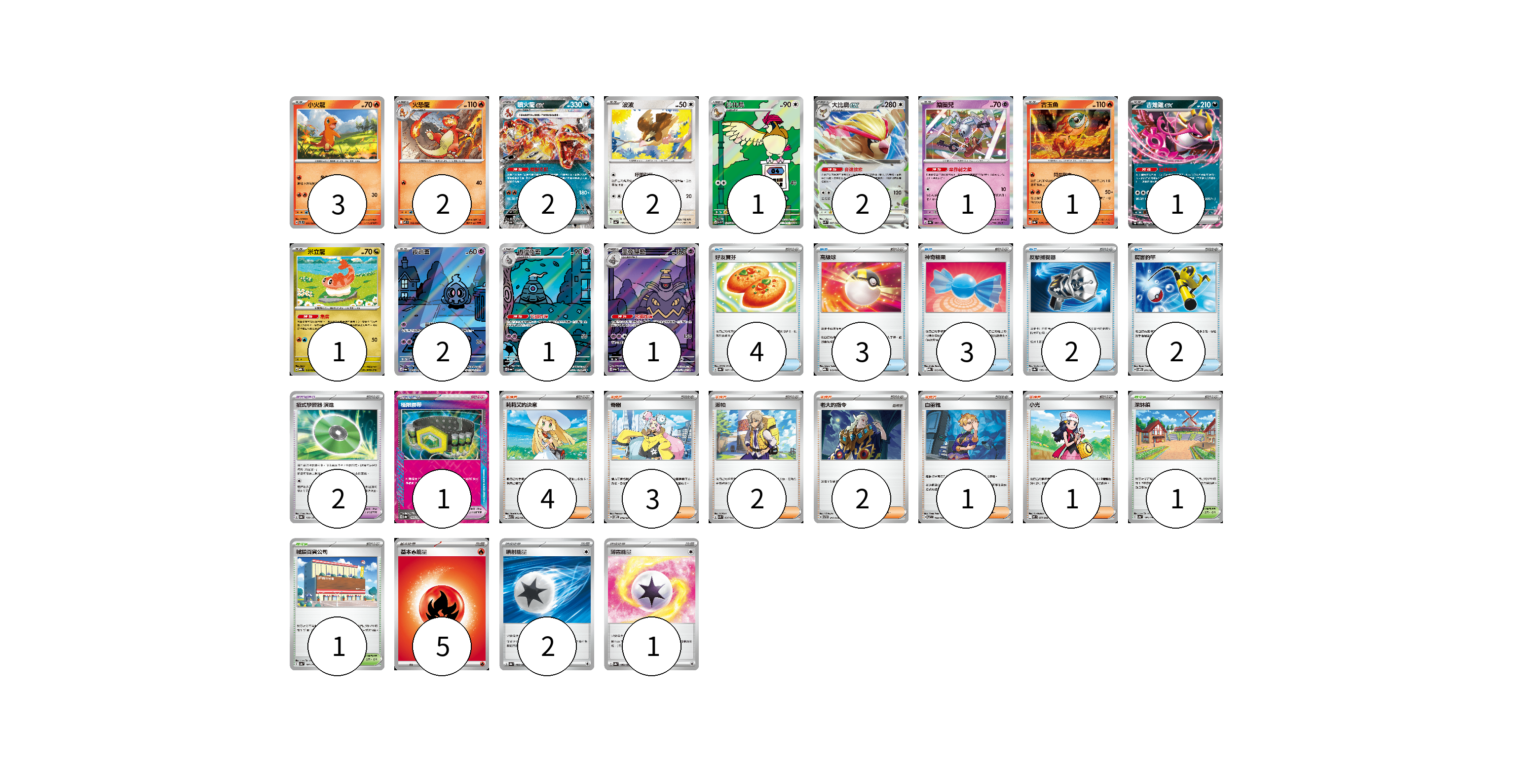 牌組構築方案 以此牌組為基礎新構築牌組 顯示卡面 顯示列表 寶可夢卡(20) 3 2 2 2 1 2 1 1 1 1 2 1 1 寶可夢道具(3) 2 1 物品卡(14) 4 3 3 2 2 支援者卡(13) 4 3 2 2 1 1 競技場卡(2) 1 1 能量卡(8) 5 2 1 寶可夢卡(20) 卡牌名稱 張數 卡牌名稱 張數 小火龍 SVTL 001/021 03 火恐龍 M2 012/080 02 噴火龍ex SV4a 115/190 02 波波 SV4a 137/190 02 比比鳥 SV3 119/108 01 大比鳥ex SVK 005/042 02 鑰圈兒 SV4a 087/190 01 古玉魚 SV8a 025/187 01 吉雉雞ex SVOM 009/021 01 米立龍 MBG 010/022 01 夜巡靈 SV6a 068/064 02 彷徨夜靈 SV6a 069/064 01 黑夜魔靈 SV6a 070/064 01 寶可夢道具(3) 卡牌名稱 張數 卡牌名稱 張數 招式學習器 演進 SV8a 160/187 02 極限腰帶 SV8a 159/187 01 物品卡(14) 卡牌名稱 張數 卡牌名稱 張數 好友寶芬 SV8a 147/187 04 高級球 MBG 012/022 03 神奇糖果 MBG 013/022 03 反擊捕捉器 SV8a 139/187 02 厲害釣竿 SVOM 011/021 02 支援者卡(13) 卡牌名稱 張數 卡牌名稱 張數 莉莉艾的決意 M1L 062/063 04 奇樹 SVOM 018/021 03 派帕 SVK 035/042 02 老大的指令 SVTH 017/018 02 白蕾雅 SV7 100/102 01 小光 M2 077/080 01 競技場卡(2) 卡牌名稱 張數 卡牌名稱 張數 深缽鎮 SV4a 185/190 01 城鎮百貨公司 SV4a 183/190 01 能量卡(8) 卡牌名稱 張數 卡牌名稱 張數 基本【火】能量 M-P FIR 05 噴射能量 SV8a 185/187 02 薄霧能量 SV8a 186/187 01 以此牌組為基礎新構築牌組 牌組編碼 yTyumc-NHUrSJ-uOgZQp copy 列印牌組單 牌組編碼已複製 分享至SNS