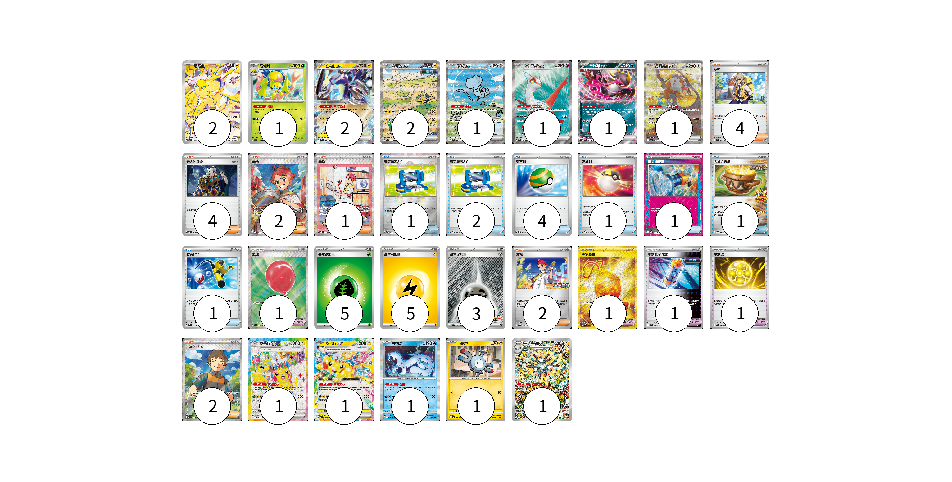 牌組構築方案 以此牌組為基礎新構築牌組 顯示卡面 顯示列表 寶可夢卡(16) 2 1 2 2 1 1 1 1 1 1 1 1 1 寶可夢道具(4) 1 1 1 1 物品卡(11) 1 2 4 1 1 1 1 支援者卡(15) 4 4 2 1 2 2 能量卡(13) 5 5 3 寶可夢卡(16) 卡牌名稱 張數 卡牌名稱 張數 電電蟲 SV7 108/102 02 電蜘蛛 SV6a 002/064 01 密勒頓ex SV4a 071/190 02 鐵臂膀ex SV4M 088/066 02 夢幻ex SV4a 347/190 01 拉帝亞斯ex SV7a 078/064 01 吉雉雞ex SV6a 038/064 01 月月熊 赫月 ex SV5a 091/066 01 皮卡丘ex SV8 122/106 01 皮卡丘ex M2a 044/193 01 古劍豹 SV8 032/106 01 小磁怪 M1S 027/063 01 三合一磁怪 SV8 112/106 01 寶可夢道具(4) 卡牌名稱 張數 卡牌名稱 張數 氣球 M1L 084/063 01 勇氣護符 SV7 134/102 01 驅勁能量 未來 SV8a 158/187 01 電氣球 M2a 163/193 01 物品卡(11) 卡牌名稱 張數 卡牌名稱 張數 寶可裝置3.0 SV11B 081/086 01 寶可裝置3.0 SVK 021/042 02 巢穴球 SVAL 012/021 04 高級球 SVK 018/042 01 頂尖捕捉器 SV5M 062/071 01 大地之容器 SV-P 084/SV-P 01 厲害釣竿 SV2P 066/071 01 支援者卡(15) 卡牌名稱 張數 卡牌名稱 張數 派帕 SVK 035/042 04 老大的指令 SVOD 019/020 04 赤松 SV7 123/102 02 赤松 SV8a 227/187 01 赤松 SV-P 150/SV-P 02 小剛的發掘 SV9 123/100 02 能量卡(13) 卡牌名稱 張數 卡牌名稱 張數 基本【草】能量 M-P GRA 05 基本【雷】能量 SVAL LIG 05 基本【鋼】能量 SV-P 264/SV-P 03 以此牌組為基礎新構築牌組 牌組編碼 yUPcBj-KqqwDt-NqlHPl copy 列印牌組單 牌組編碼已複製 分享至SNS