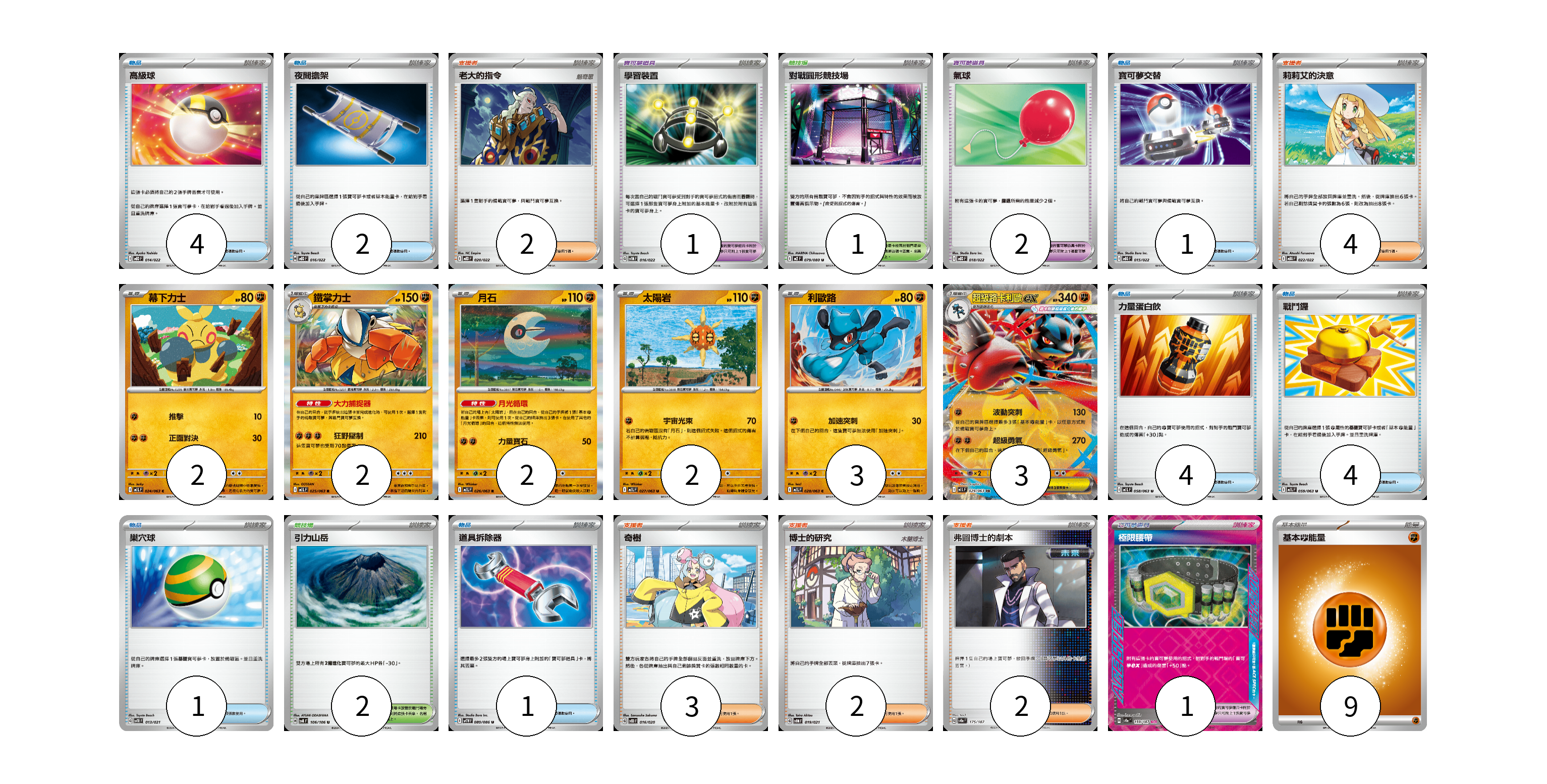 牌組構築方案 以此牌組為基礎新構築牌組 顯示卡面 顯示列表 寶可夢卡(14) 2 2 2 2 3 3 寶可夢道具(2) 1 1 物品卡(19) 4 2 2 1 4 4 1 1 支援者卡(13) 2 4 3 2 2 競技場卡(3) 1 2 能量卡(9) 9 寶可夢卡(14) 卡牌名稱 張數 卡牌名稱 張數 幕下力士 M1L 024/063 02 鐵掌力士 M1L 025/063 02 月石 M1L 026/063 02 太陽岩 M1L 027/063 02 利歐路 M1L 028/063 03 超級路卡利歐ex M1L 029/063 03 寶可夢道具(2) 卡牌名稱 張數 卡牌名稱 張數 學習裝置 SVTM 016/022 01 極限腰帶 SV8a 159/187 01 物品卡(19) 卡牌名稱 張數 卡牌名稱 張數 高級球 MBD 014/022 04 夜間擔架 MBD 016/022 02 氣球 MBD 018/022 02 寶可夢交替 MBG 015/022 01 力量蛋白飲 M1L 058/063 04 戰鬥鑼 M1L 059/063 04 巢穴球 SVTR 013/021 01 道具拆除器 SV11W 080/086 01 支援者卡(13) 卡牌名稱 張數 卡牌名稱 張數 老大的指令 MBD 020/022 02 莉莉艾的決意 MBG 022/022 04 奇樹 SVOD 016/020 03 博士的研究 SVOM 019/021 02 弗圖博士的劇本 SV8a 175/187 02 競技場卡(3) 卡牌名稱 張數 卡牌名稱 張數 對戰圓形競技場 M2 079/080 01 引力山岳 SV8 106/106 02 能量卡(9) 卡牌名稱 張數 卡牌名稱 張數 基本【鬥】能量 M-P FIG 09 以此牌組為基礎新構築牌組 牌組編碼 yVqMWr-sqkwDe-xrqxwf copy 列印牌組單 牌組編碼已複製 分享至SNS
