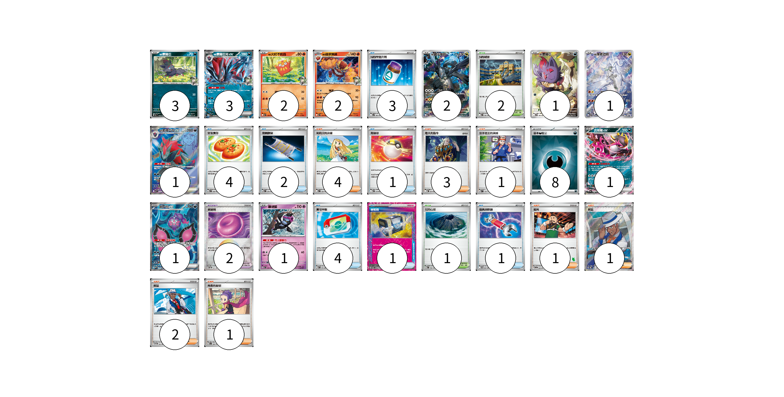 牌組構築方案 以此牌組為基礎新構築牌組 顯示卡面 顯示列表 寶可夢卡(18) 3 3 2 2 2 1 1 1 1 1 1 寶可夢道具(2) 2 物品卡(16) 3 4 2 1 4 1 1 支援者卡(13) 4 3 1 1 1 2 1 競技場卡(3) 2 1 能量卡(8) 8 寶可夢卡(18) 卡牌名稱 張數 卡牌名稱 張數 N的索羅亞 MC 469/742 03 N的索羅亞克ex MC 470/742 03 N的火紅不倒翁 MC 118/742 02 N的達摩狒狒 MC 119/742 02 N的捷克羅姆 M2a 210/193 02 N的索羅亞 SV9 108/100 01 N的萊希拉姆 SV9 109/100 01 N的索羅亞克ex SV9 117/100 01 吉雉雞ex SV6a 038/064 01 桃歹郎ex SV6a 082/064 01 願增猿 MC 358/742 01 寶可夢道具(2) 卡牌名稱 張數 卡牌名稱 張數 鎖鏈糬 SV8a 154/187 02 物品卡(16) 卡牌名稱 張數 卡牌名稱 張數 N的PP提升劑 M2a 146/193 03 好友寶芬 MC 648/742 04 夜間擔架 MC 670/742 02 高級球 MBD 014/022 01 寶可平板 M3 070/080 04 秘密箱 SV6 092/101 01 道具拆除器 SV11W 080/086 01 支援者卡(13) 卡牌名稱 張數 卡牌名稱 張數 莉莉艾的決意 MC 729/742 04 老大的指令 MBG 021/022 03 空手道王的演練 SVM 150/175 01 裁判 SVI 059/066 01 席藍 SV8 127/106 01 席藍 SV8 102/106 02 阿杏的秘招 MC 699/742 01 競技場卡(3) 卡牌名稱 張數 卡牌名稱 張數 N的城堡 M2a 181/193 02 引力山岳 M2a 183/193 01 能量卡(8) 卡牌名稱 張數 卡牌名稱 張數 基本【惡】能量 SVM DAR 08 以此牌組為基礎新構築牌組 牌組編碼 yXJDjC-aspFSo-hnjBPw copy 列印牌組單 牌組編碼已複製 分享至SNS