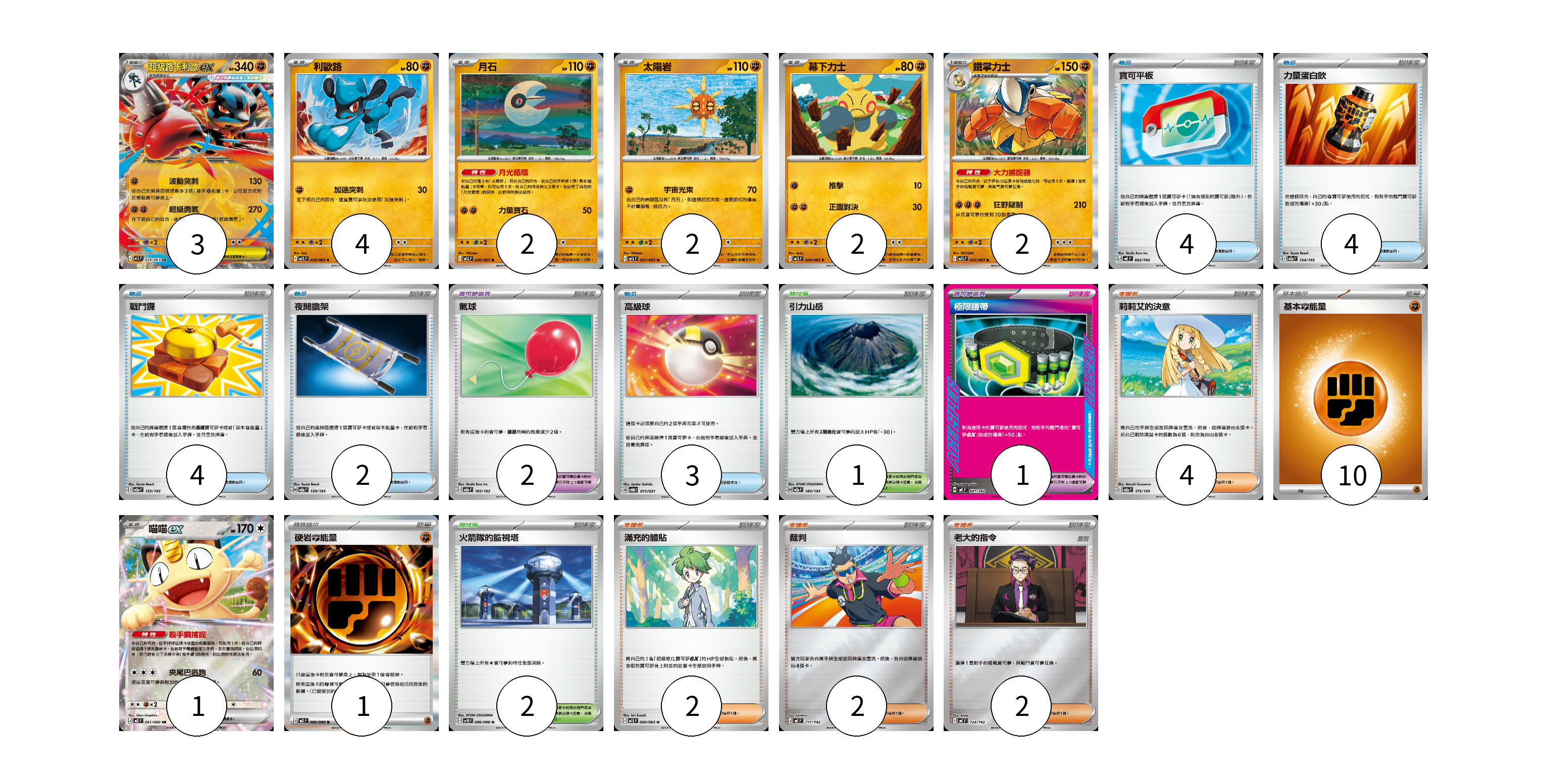 牌組構築方案 以此牌組為基礎新構築牌組 顯示卡面 顯示列表 寶可夢卡(16) 3 4 2 2 2 2 1 寶可夢道具(3) 2 1 物品卡(17) 4 4 4 2 3 支援者卡(10) 4 2 2 2 競技場卡(3) 1 2 能量卡(11) 10 1 寶可夢卡(16) 卡牌名稱 張數 卡牌名稱 張數 超級路卡利歐ex M1L 029/063 03 利歐路 M1L 028/063 04 月石 M1L 026/063 02 太陽岩 M1L 027/063 02 幕下力士 M1L 024/063 02 鐵掌力士 M1L 025/063 02 喵喵ex M3 061/080 01 寶可夢道具(3) 卡牌名稱 張數 卡牌名稱 張數 氣球 M2a 165/193 02 極限腰帶 MC 691/742 01 物品卡(17) 卡牌名稱 張數 卡牌名稱 張數 寶可平板 MC 662/742 04 力量蛋白飲 M2a 154/193 04 戰鬥鑼 M2a 155/193 04 夜間擔架 M2a 159/193 02 高級球 SVOM 013/021 03 支援者卡(10) 卡牌名稱 張數 卡牌名稱 張數 莉莉艾的決意 M2a 175/193 04 滿充的體貼 M1S 060/063 02 裁判 MC 711/742 02 老大的指令 MC 724/742 02 競技場卡(3) 卡牌名稱 張數 卡牌名稱 張數 引力山岳 M2a 183/193 01 火箭隊的監視塔 SV10 096/098 02 能量卡(11) 卡牌名稱 張數 卡牌名稱 張數 基本【鬥】能量 MC FIG 10 硬岩【鬥】能量 M3 080/080 01 以此牌組為基礎新構築牌組 牌組編碼 yYlOqr-QFbsOv-lxzHuL copy 列印牌組單 牌組編碼已複製 分享至SNS