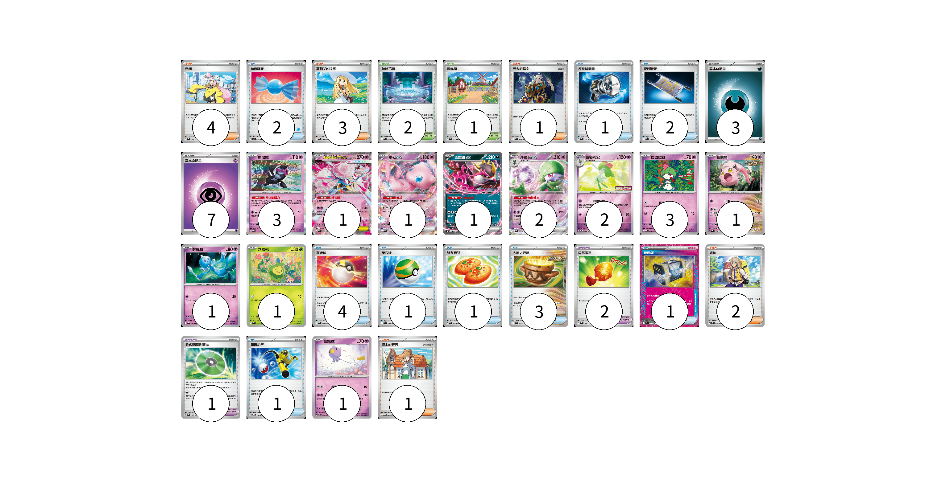 牌組構築方案 以此牌組為基礎新構築牌組 顯示卡面 顯示列表 寶可夢卡(17) 3 1 1 1 2 2 3 1 1 1 1 寶可夢道具(3) 2 1 物品卡(16) 2 1 2 4 1 1 3 1 1 支援者卡(11) 4 3 1 2 1 競技場卡(3) 2 1 能量卡(10) 3 7 寶可夢卡(17) 卡牌名稱 張數 卡牌名稱 張數 願增猿 SV8a 075/187 03 超級蒂安希ex MBD 006/022 01 夢幻ex SV4a 076/190 01 吉雉雞ex SVOD 004/020 01 沙奈朵ex SV4a 082/190 02 奇魯莉安 M-P 006/M-P 02 拉魯拉絲 M1S 040/063 03 吼叫尾 SV8a 071/187 01 輕飄飄 SV11W 041/086 01 含羞苞 SV8a 001/187 01 飄飄球 SVTS 005/022 01 寶可夢道具(3) 卡牌名稱 張數 卡牌名稱 張數 勇氣護符 SVM 142/175 02 招式學習器 演進 SV8a 160/187 01 物品卡(16) 卡牌名稱 張數 卡牌名稱 張數 神奇糖果 SVI 053/066 02 反擊捕捉器 SV8a 139/187 01 夜間擔架 MBD 016/022 02 高級球 MBD 014/022 04 巢穴球 SVK 016/042 01 好友寶芬 MBD 013/022 01 大地之容器 SV8a 143/187 03 秘密箱 SV6 092/101 01 厲害釣竿 SVOD 010/020 01 支援者卡(11) 卡牌名稱 張數 卡牌名稱 張數 奇樹 SVM 160/175 04 莉莉艾的決意 MBD 021/022 03 老大的指令 MBD 020/022 01 派帕 SVOD 018/020 02 博士的研究 SV11B 084/086 01 競技場卡(3) 卡牌名稱 張數 卡牌名稱 張數 神秘花園 MBD 022/022 02 深缽鎮 SVK 039/042 01 能量卡(10) 卡牌名稱 張數 卡牌名稱 張數 基本【惡】能量 MBG DAR 03 基本【超】能量 MBD PSY 07 以此牌組為基礎新構築牌組 牌組編碼 ybrSHU-WYsyzc-DBUNrV copy 列印牌組單 牌組編碼已複製 分享至SNS