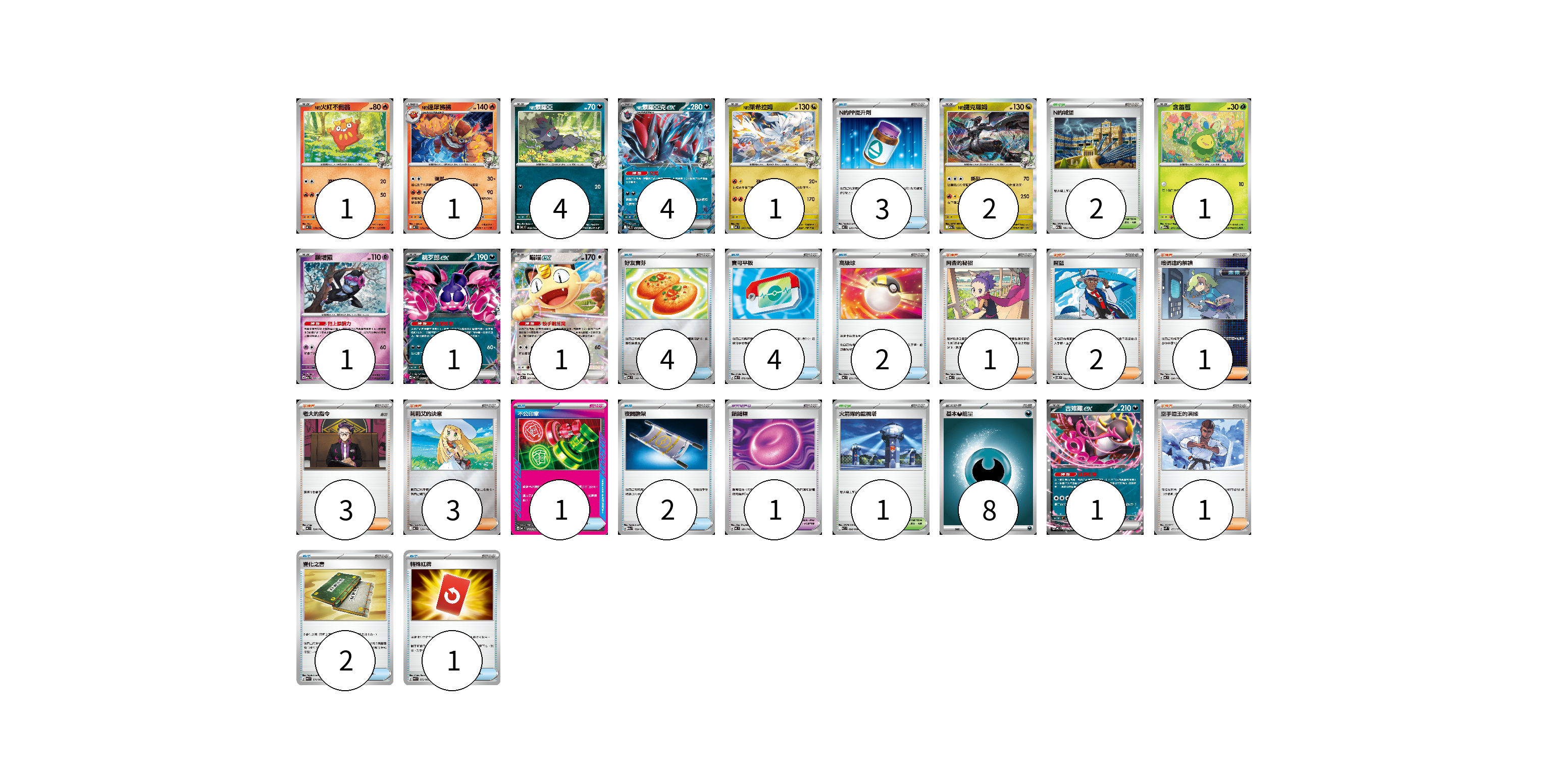 牌組構築方案 以此牌組為基礎新構築牌組 顯示卡面 顯示列表 寶可夢卡(18) 1 1 4 4 1 2 1 1 1 1 1 寶可夢道具(1) 1 物品卡(19) 3 4 4 2 1 2 2 1 支援者卡(11) 1 2 1 3 3 1 競技場卡(3) 2 1 能量卡(8) 8 寶可夢卡(18) 卡牌名稱 張數 卡牌名稱 張數 N的火紅不倒翁 MC 118/742 01 N的達摩狒狒 MC 119/742 01 N的索羅亞 MC 469/742 04 N的索羅亞克ex MC 470/742 04 N的萊希拉姆 MC 545/742 01 N的捷克羅姆 M2a 129/193 02 含羞苞 M2a 011/193 01 願增猿 M2a 081/193 01 桃歹郎ex MC 491/742 01 喵喵ex M3 061/080 01 吉雉雞ex MC 489/742 01 寶可夢道具(1) 卡牌名稱 張數 卡牌名稱 張數 鎖鏈糬 MC 681/742 01 物品卡(19) 卡牌名稱 張數 卡牌名稱 張數 N的PP提升劑 MC 635/742 03 好友寶芬 MC 648/742 04 寶可平板 M3 070/080 04 高級球 MC 651/742 02 不公印章 MC 633/742 01 夜間擔架 M2a 159/193 02 變化之書 M4 074/083 02 特殊紅牌 M4 072/083 01 支援者卡(11) 卡牌名稱 張數 卡牌名稱 張數 阿杏的秘招 MC 699/742 01 席藍 SV8 102/106 02 暗碼迷的解讀 MC 698/742 01 老大的指令 MC 724/742 03 莉莉艾的決意 MC 729/742 03 空手道王的演練 SVM 151/175 01 競技場卡(3) 卡牌名稱 張數 卡牌名稱 張數 N的城堡 M2a 181/193 02 火箭隊的監視塔 SV10 096/098 01 能量卡(8) 卡牌名稱 張數 卡牌名稱 張數 基本【惡】能量 MC DAR 08 以此牌組為基礎新構築牌組 牌組編碼 yckHsC-egpeSq-hifqIE copy 列印牌組單 牌組編碼已複製 分享至SNS