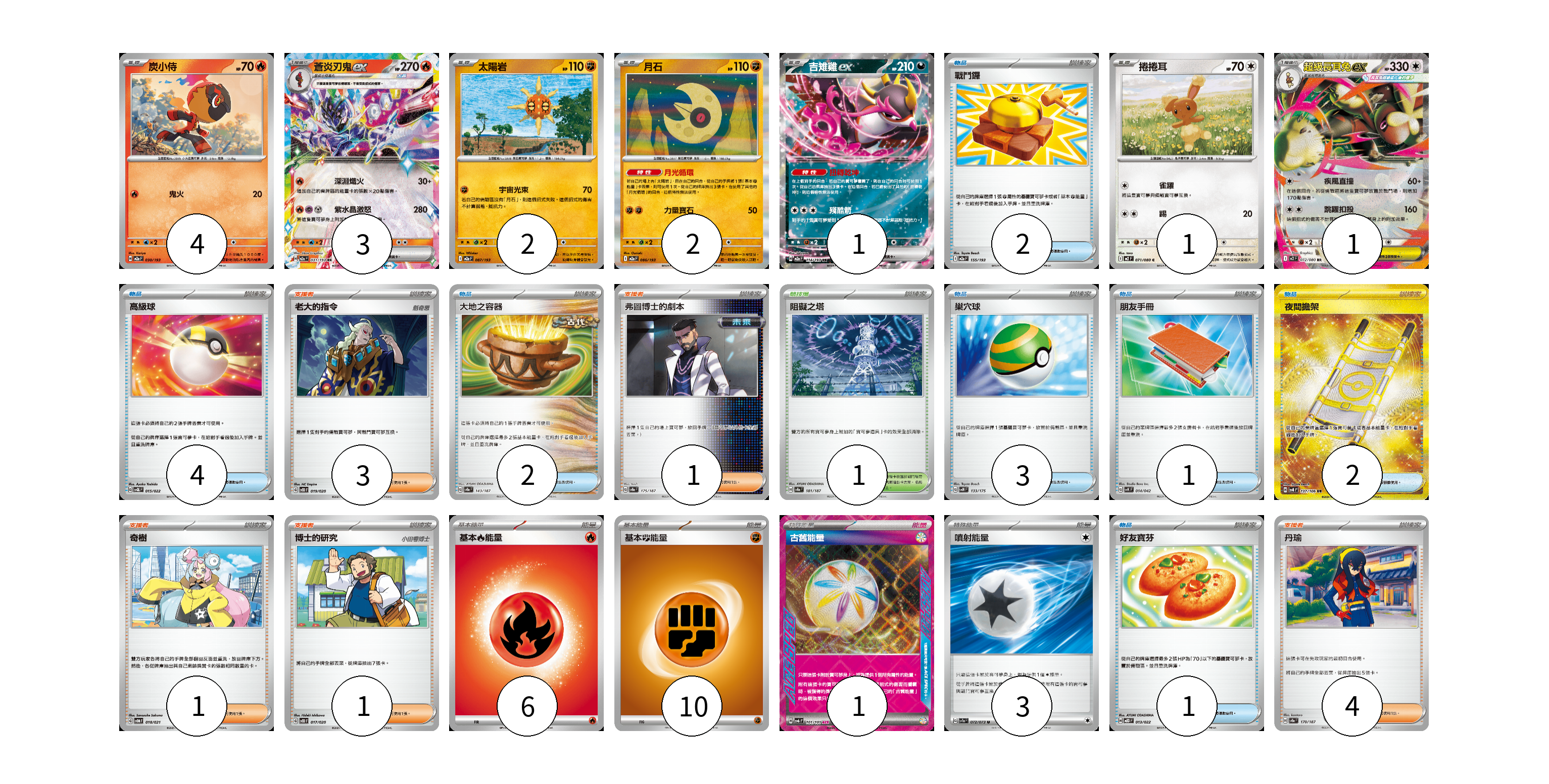 牌組構築方案 以此牌組為基礎新構築牌組 顯示卡面 顯示列表 寶可夢卡(14) 4 3 2 2 1 1 1 物品卡(15) 2 4 2 3 1 2 1 支援者卡(10) 3 1 1 1 4 競技場卡(1) 1 能量卡(20) 6 10 1 3 寶可夢卡(14) 卡牌名稱 張數 卡牌名稱 張數 炭小侍 M2a 030/193 04 蒼炎刃鬼ex M2a 031/193 03 太陽岩 M2a 087/193 02 月石 M2a 086/193 02 吉雉雞ex M2a 114/193 01 捲捲耳 M2 071/080 01 超級長耳兔ex M2 072/080 01 物品卡(15) 卡牌名稱 張數 卡牌名稱 張數 戰鬥鑼 M2a 155/193 02 高級球 SVQL 015/022 04 大地之容器 SV8a 143/187 02 巢穴球 SVM 133/175 03 朋友手冊 SVK 014/042 01 夜間擔架 SV8 137/106 02 好友寶芬 MBD 013/022 01 支援者卡(10) 卡牌名稱 張數 卡牌名稱 張數 老大的指令 SVOD 019/020 03 弗圖博士的劇本 SV8a 175/187 01 奇樹 SVOM 018/021 01 博士的研究 SVOD 017/020 01 丹瑜 SV8a 170/187 04 競技場卡(1) 卡牌名稱 張數 卡牌名稱 張數 阻礙之塔 SV8a 181/187 01 能量卡(20) 卡牌名稱 張數 卡牌名稱 張數 基本【火】能量 M-P FIR 06 基本【鬥】能量 SVTG FIG 10 古舊能量 SV6 101/101 01 噴射能量 SV1a 072/073 03 以此牌組為基礎新構築牌組 牌組編碼 yfkazG-ogYpQi-MgrILI copy 列印牌組單 牌組編碼已複製 分享至SNS