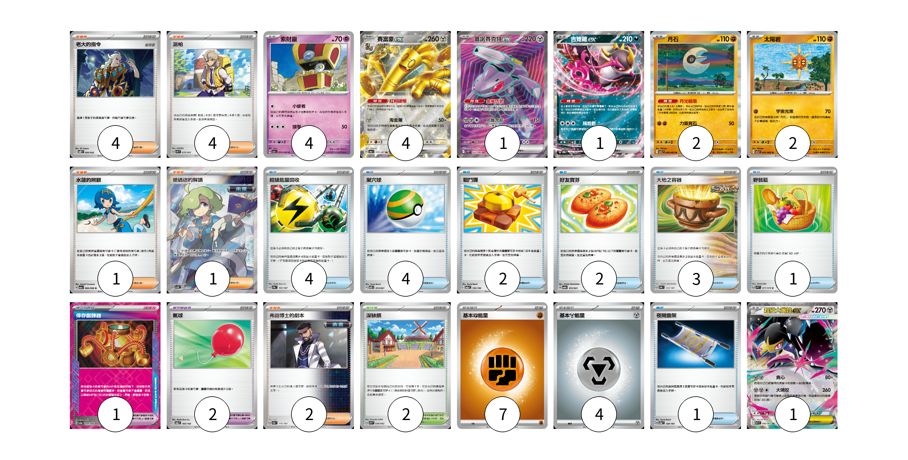 牌組構築方案 以此牌組為基礎新構築牌組 顯示卡面 顯示列表 寶可夢卡(15) 4 4 1 1 2 2 1 寶可夢道具(3) 1 2 物品卡(17) 4 4 2 2 3 1 1 支援者卡(12) 4 4 1 1 2 競技場卡(2) 2 能量卡(11) 7 4 寶可夢卡(15) 卡牌名稱 張數 卡牌名稱 張數 索財靈 SV7a 024/064 04 賽富豪ex SV8a 117/187 04 蓋諾賽克特ex SV11B 164/086 01 吉雉雞ex M2a 114/193 01 月石 M1L 026/063 02 太陽岩 M1L 027/063 02 超級大嘴娃ex M1L 046/063 01 寶可夢道具(3) 卡牌名稱 張數 卡牌名稱 張數 倖存鍛鍊器 SV5a 059/066 01 氣球 M2a 165/193 02 物品卡(17) 卡牌名稱 張數 卡牌名稱 張數 超級能量回收 SV8a 141/187 04 巢穴球 SVTR 013/021 04 戰鬥鑼 M2a 155/193 02 好友寶芬 SVOM 012/021 02 大地之容器 SV8a 143/187 03 野餐籃 SV1V 071/078 01 夜間擔架 M2a 159/193 01 支援者卡(12) 卡牌名稱 張數 卡牌名稱 張數 老大的指令 MBD 020/022 04 派帕 SVK 035/042 04 水蓮的照顧 SV5a 064/066 01 暗碼迷的解讀 SV5M 090/071 01 弗圖博士的劇本 SV8a 175/187 02 競技場卡(2) 卡牌名稱 張數 卡牌名稱 張數 深缽鎮 SVK 039/042 02 能量卡(11) 卡牌名稱 張數 卡牌名稱 張數 基本【鬥】能量 M-P FIG 07 基本【鋼】能量 M-P MET 04 以此牌組為基礎新構築牌組 牌組編碼 ykMpUc-wJusSr-czhXpy copy 列印牌組單 牌組編碼已複製 分享至SNS