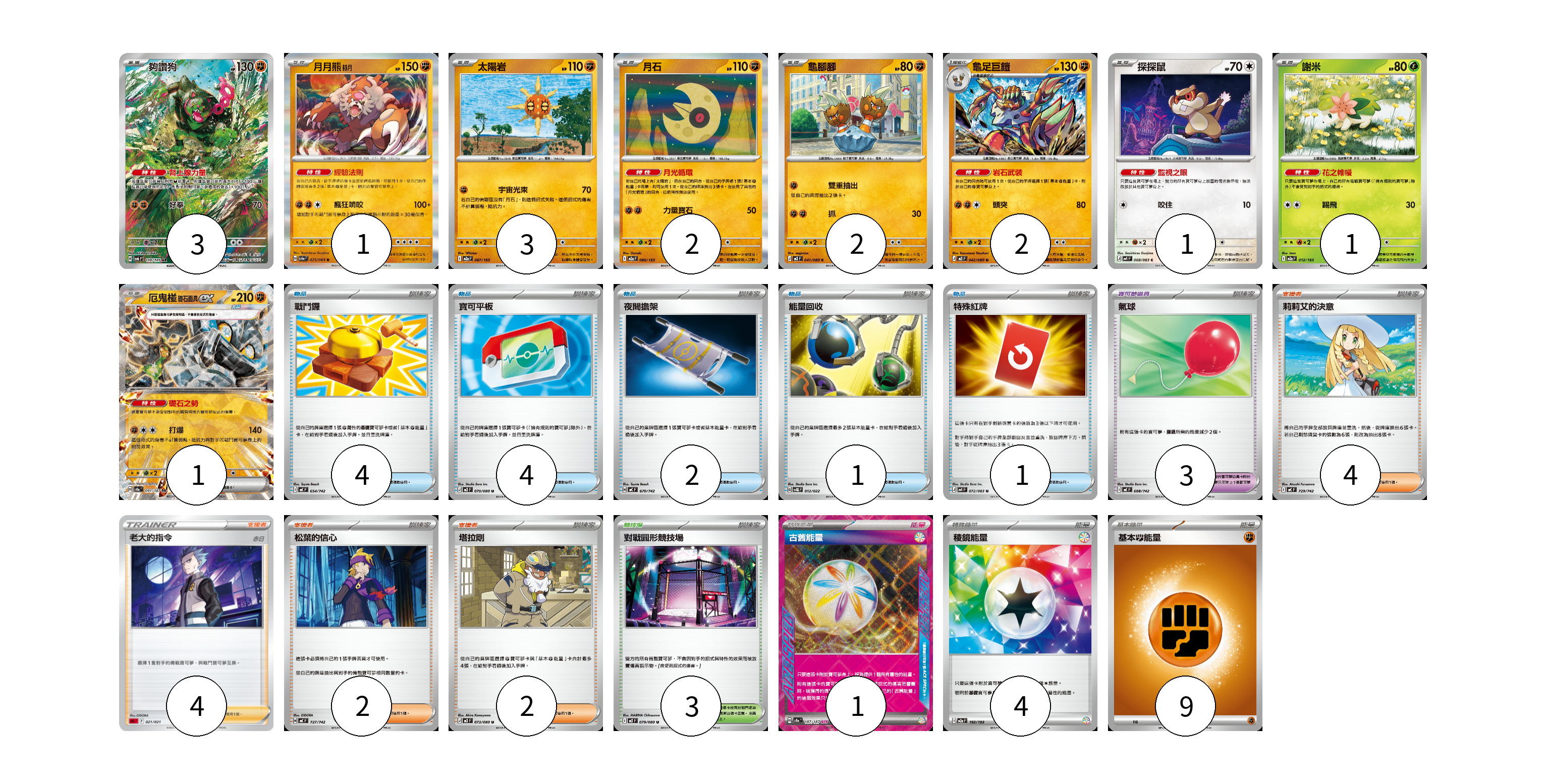牌組構築方案 以此牌組為基礎新構築牌組 顯示卡面 顯示列表 寶可夢卡(16) 3 1 3 2 2 2 1 1 1 寶可夢道具(3) 3 物品卡(12) 4 4 2 1 1 支援者卡(12) 4 4 2 2 競技場卡(3) 3 能量卡(14) 1 4 9 寶可夢卡(16) 卡牌名稱 張數 卡牌名稱 張數 夠讚狗 SV6 110/101 03 月月熊 赫月 SV6a 025/064 01 太陽岩 M2a 087/193 03 月石 M2a 086/193 02 龜腳腳 M3 041/080 02 龜足巨鎧 M3 042/080 02 探探鼠 M4 068/083 01 謝米 M2a 012/193 01 厄鬼椪 礎石面具ex SV8a 091/187 01 寶可夢道具(3) 卡牌名稱 張數 卡牌名稱 張數 氣球 MC 688/742 03 物品卡(12) 卡牌名稱 張數 卡牌名稱 張數 戰鬥鑼 MC 654/742 04 寶可平板 M3 070/080 04 夜間擔架 MC 670/742 02 能量回收 SVQL 012/022 01 特殊紅牌 M4 072/083 01 支援者卡(12) 卡牌名稱 張數 卡牌名稱 張數 莉莉艾的決意 MC 729/742 04 老大的指令(赤日) SDL 021/021 04 松葉的信心 MC 727/742 02 塔拉剛 M3 073/080 02 競技場卡(3) 卡牌名稱 張數 卡牌名稱 張數 對戰圓形競技場 M2 079/080 03 能量卡(14) 卡牌名稱 張數 卡牌名稱 張數 古舊能量 SV8a 187/187 01 稜鏡能量 M2a 192/193 04 基本【鬥】能量 MC FIG 09 以此牌組為基礎新構築牌組 牌組編碼 ynODIw-KAQMuk-zcSLtw copy 列印牌組單 牌組編碼已複製 分享至SNS