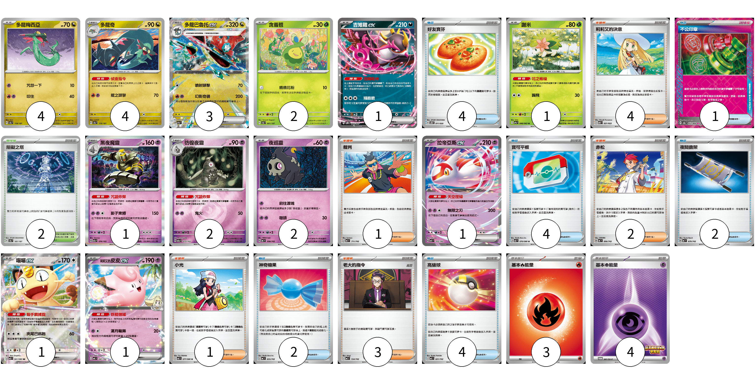 牌組構築方案 以此牌組為基礎新構築牌組 顯示卡面 顯示列表 寶可夢卡(23) 4 4 3 2 1 1 1 2 2 1 1 1 物品卡(17) 4 1 4 2 2 4 支援者卡(11) 4 1 2 1 3 競技場卡(2) 2 能量卡(7) 3 4 寶可夢卡(23) 卡牌名稱 張數 卡牌名稱 張數 多龍梅西亞 SV8a 118/187 04 多龍奇 SV8a 119/187 04 多龍巴魯托ex SV8a 120/187 03 含羞苞 SV8a 001/187 02 吉雉雞ex SVOD 004/020 01 謝米 SV9a 006/063 01 黑夜魔靈 M2a 074/193 01 彷徨夜靈 M2a 073/193 02 夜巡靈 MC 308/742 02 拉帝亞斯ex MC 312/742 01 喵喵ex M3 061/080 01 莉莉艾的皮皮ex MC 287/742 01 物品卡(17) 卡牌名稱 張數 卡牌名稱 張數 好友寶芬 SVOD 011/020 04 不公印章 SV5a 053/066 01 寶可平板 M3 070/080 04 夜間擔架 MC 670/742 02 神奇糖果 MC 655/742 02 高級球 MC 651/742 04 支援者卡(11) 卡牌名稱 張數 卡牌名稱 張數 莉莉艾的決意 MBD 021/022 04 裁判 MC 711/742 01 赤松 MC 696/742 02 小光 M2 077/080 01 老大的指令 MC 724/742 03 競技場卡(2) 卡牌名稱 張數 卡牌名稱 張數 阻礙之塔 SV8a 181/187 02 能量卡(7) 卡牌名稱 張數 卡牌名稱 張數 基本【火】能量 MC FIR 03 基本【超】能量 SV-P 261/SV-P 04 以此牌組為基礎新構築牌組 牌組編碼 ysIJGE-jjeZCu-yZxZtJ copy 列印牌組單 牌組編碼已複製 分享至SNS