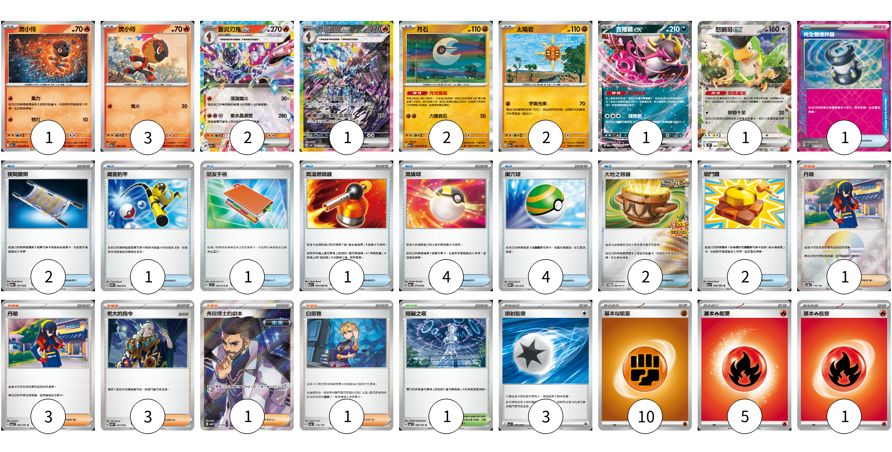 牌組構築方案 以此牌組為基礎新構築牌組 顯示卡面 顯示列表 寶可夢卡(13) 1 3 2 1 2 2 1 1 物品卡(18) 1 2 1 1 1 4 4 2 2 支援者卡(9) 1 3 3 1 1 競技場卡(1) 1 能量卡(19) 3 10 5 1 寶可夢卡(13) 卡牌名稱 張數 卡牌名稱 張數 炭小侍 M2 019/080 01 炭小侍 M2a 030/193 03 蒼炎刃鬼ex M2a 031/193 02 蒼炎刃鬼ex SV8a 203/187 01 月石 M1L 026/063 02 太陽岩 M2a 087/193 02 吉雉雞ex M2a 114/193 01 怒鸚哥ex SV2P 065/071 01 物品卡(18) 卡牌名稱 張數 卡牌名稱 張數 完全體攪拌器 SVK 017/042 01 夜間擔架 MBG 017/022 02 厲害釣竿 SVTH 008/018 01 朋友手冊 SV1S 069/078 01 高溫燃燒器 M2 074/080 01 高級球 SVQL 015/022 04 巢穴球 SVTG 012/019 04 大地之容器 SV-P 084/SV-P 02 戰鬥鑼 M1L 059/063 02 支援者卡(9) 卡牌名稱 張數 卡牌名稱 張數 丹瑜 SV8a 170/187 01 丹瑜 SV6 097/101 03 老大的指令 SVTH 017/018 03 弗圖博士的劇本 SV4M 086/066 01 白蕾雅 SV8a 176/187 01 競技場卡(1) 卡牌名稱 張數 卡牌名稱 張數 阻礙之塔 SV6 100/101 01 能量卡(19) 卡牌名稱 張數 卡牌名稱 張數 噴射能量 SVK 040/042 03 基本【鬥】能量 SVD FIG 10 基本【火】能量 M-P FIR 05 基本【火】能量 SVHK FIR 01 以此牌組為基礎新構築牌組 牌組編碼 ysUlxc-bVFyxt-BObneU copy 列印牌組單 牌組編碼已複製 分享至SNS