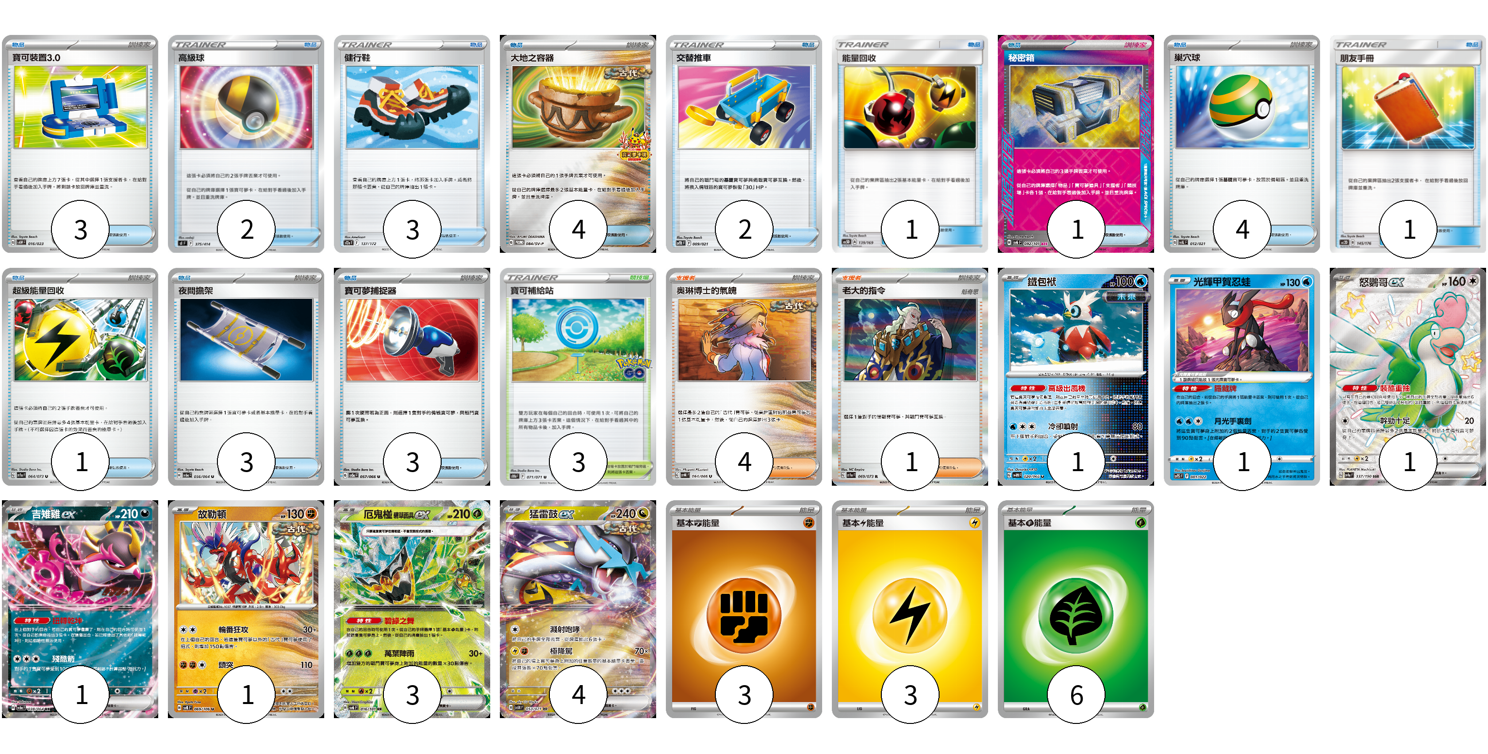 牌組構築方案 以此牌組為基礎新構築牌組 顯示卡面 顯示列表 寶可夢卡(12) 1 1 1 1 1 3 4 物品卡(28) 3 2 3 4 2 1 1 4 1 1 3 3 支援者卡(5) 4 1 競技場卡(3) 3 能量卡(12) 3 3 6 寶可夢卡(12) 卡牌名稱 張數 卡牌名稱 張數 鐵包袱 SV4M 020/066 01 光輝甲賀忍蛙 SVTS 001/022 01 怒鸚哥ex SV4a 337/190 01 吉雉雞ex SV6a 038/064 01 故勒頓 SV8 069/106 01 厄鬼椪 碧草面具ex SV6 016/101 03 猛雷鼓ex SV5K 053/071 04 物品卡(28) 卡牌名稱 張數 卡牌名稱 張數 寶可裝置3.0 SVAW 016/023 03 高級球 SI 375/414 02 健行鞋 S12a 137/172 03 大地之容器 SV-P 084/SV-P 04 交替推車 SVTR 009/021 02 能量回收 AS5D 139/169 01 秘密箱 SV6 092/101 01 巢穴球 SVAL 012/021 04 朋友手冊 AC2D 145/176 01 超級能量回收 SV1a 064/073 01 夜間擔架 SV6a 056/064 03 寶可夢捕捉器 SV5a 057/066 03 支援者卡(5) 卡牌名稱 張數 卡牌名稱 張數 奧琳博士的氣魄 SV4K 064/066 04 老大的指令 SV1a 069/073 01 競技場卡(3) 卡牌名稱 張數 卡牌名稱 張數 寶可補給站 S10b 071/071 03 能量卡(12) 卡牌名稱 張數 卡牌名稱 張數 基本【鬥】能量 SVHK FIG 03 基本【雷】能量 SVHM LIG 03 基本【草】能量 SVF GRA 06 以此牌組為基礎新構築牌組 牌組編碼 ywudLG-FNmGKV-EEXFak copy 列印牌組單 牌組編碼已複製 分享至SNS