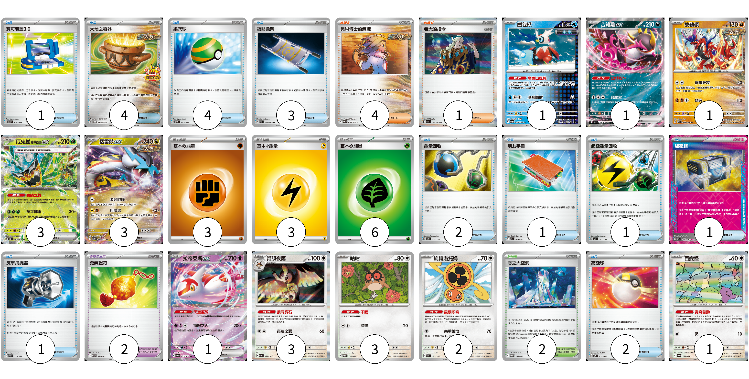 牌組構築方案 以此牌組為基礎新構築牌組 顯示卡面 顯示列表 寶可夢卡(19) 1 1 1 3 3 1 3 3 2 1 寶可夢道具(2) 2 物品卡(20) 1 4 4 3 2 1 1 1 1 2 支援者卡(5) 4 1 競技場卡(2) 2 能量卡(12) 3 3 6 寶可夢卡(19) 卡牌名稱 張數 卡牌名稱 張數 鐵包袱 SV4M 020/066 01 吉雉雞ex SV6a 038/064 01 故勒頓 SV8 069/106 01 厄鬼椪 碧草面具ex SV6 016/101 03 猛雷鼓ex SV5K 053/071 03 拉帝亞斯ex SV7a 019/064 01 貓頭夜鷹 SV8a 128/187 03 咕咕 SV8a 127/187 03 旋轉洛托姆 SV8a 131/187 02 百變怪 SV4a 144/190 01 寶可夢道具(2) 卡牌名稱 張數 卡牌名稱 張數 勇氣護符 SVK 024/042 02 物品卡(20) 卡牌名稱 張數 卡牌名稱 張數 寶可裝置3.0 SVAW 016/023 01 大地之容器 SV-P 084/SV-P 04 巢穴球 SVAL 012/021 04 夜間擔架 SV6a 056/064 03 能量回收 SVM 125/175 02 朋友手冊 SVK 014/042 01 超級能量回收 SV8a 141/187 01 秘密箱 SV6 092/101 01 反擊捕捉器 SV8a 139/187 01 高級球 SVOD 012/020 02 支援者卡(5) 卡牌名稱 張數 卡牌名稱 張數 奧琳博士的氣魄 SV4K 064/066 04 老大的指令 SV1a 069/073 01 競技場卡(2) 卡牌名稱 張數 卡牌名稱 張數 零之大空洞 SV8a 182/187 02 能量卡(12) 卡牌名稱 張數 卡牌名稱 張數 基本【鬥】能量 SVHK FIG 03 基本【雷】能量 SVHM LIG 03 基本【草】能量 SVF GRA 06 以此牌組為基礎新構築牌組 牌組編碼 yzKKbs-EVhsti-PbfLlQ copy 列印牌組單 牌組編碼已複製 分享至SNS