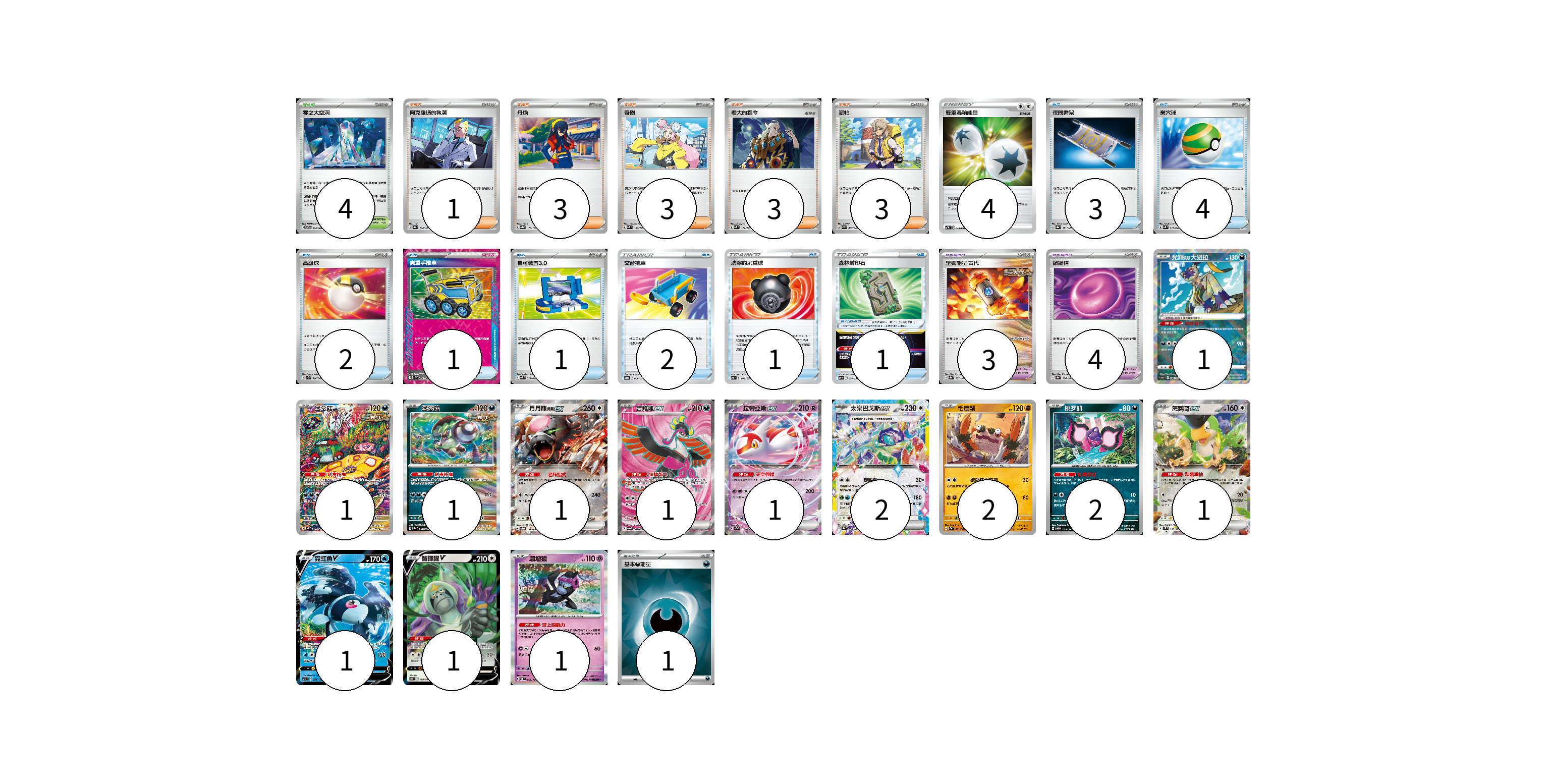牌組構築方案 以此牌組為基礎新構築牌組 顯示卡面 顯示列表 寶可夢卡(16) 1 1 1 1 1 1 2 2 2 1 1 1 1 寶可夢道具(7) 3 4 物品卡(15) 3 4 2 1 1 2 1 1 支援者卡(13) 1 3 3 3 3 競技場卡(4) 4 能量卡(5) 4 1 寶可夢卡(16) 卡牌名稱 張數 卡牌名稱 張數 光輝洗翠 大狃拉 S10a 046/071 01 猛惡菇 SV4K 077/066 01 猛惡菇 SV8a 099/187 01 月月熊 赫月 ex SV5a 052/066 01 吉雉雞ex SV6a 081/064 01 拉帝亞斯ex SV7a 019/064 01 太樂巴戈斯ex SV8a 136/187 02 毛崖蟹 SV3a 031/062 02 桃歹郎 SV8 075/106 02 怒鸚哥ex SV2P 065/071 01 霓虹魚V S12a 026/172 01 智揮猩V S10P 058/067 01 願增猿 SV6 055/101 01 寶可夢道具(7) 卡牌名稱 張數 卡牌名稱 張數 驅勁能量 古代 SV8a 157/187 03 鎖鏈糬 SV8a 154/187 04 物品卡(15) 卡牌名稱 張數 卡牌名稱 張數 夜間擔架 SV8a 151/187 03 巢穴球 SVK 016/042 04 高級球 SVK 018/042 02 貴重手推車 SVK 020/042 01 寶可裝置3.0 SVK 021/042 01 交替推車 SVTR 009/021 02 洗翠的沉重球 SVF 019/038 01 森林封印石 SVF 024/038 01 支援者卡(13) 卡牌名稱 張數 卡牌名稱 張數 阿克羅瑪的執著 SV8a 164/187 01 丹瑜 SV8a 170/187 03 奇樹 SVM 160/175 03 老大的指令 SVM 172/175 03 派帕 SVK 035/042 03 競技場卡(4) 卡牌名稱 張數 卡牌名稱 張數 零之大空洞 SV7 102/102 04 能量卡(5) 卡牌名稱 張數 卡牌名稱 張數 雙重渦輪能量 SVTM 022/022 04 基本【惡】能量 SVK DAR 01 以此牌組為基礎新構築牌組 牌組編碼 zBDaHV-lHgzTA-xcuAtQ copy 列印牌組單 牌組編碼已複製 分享至SNS