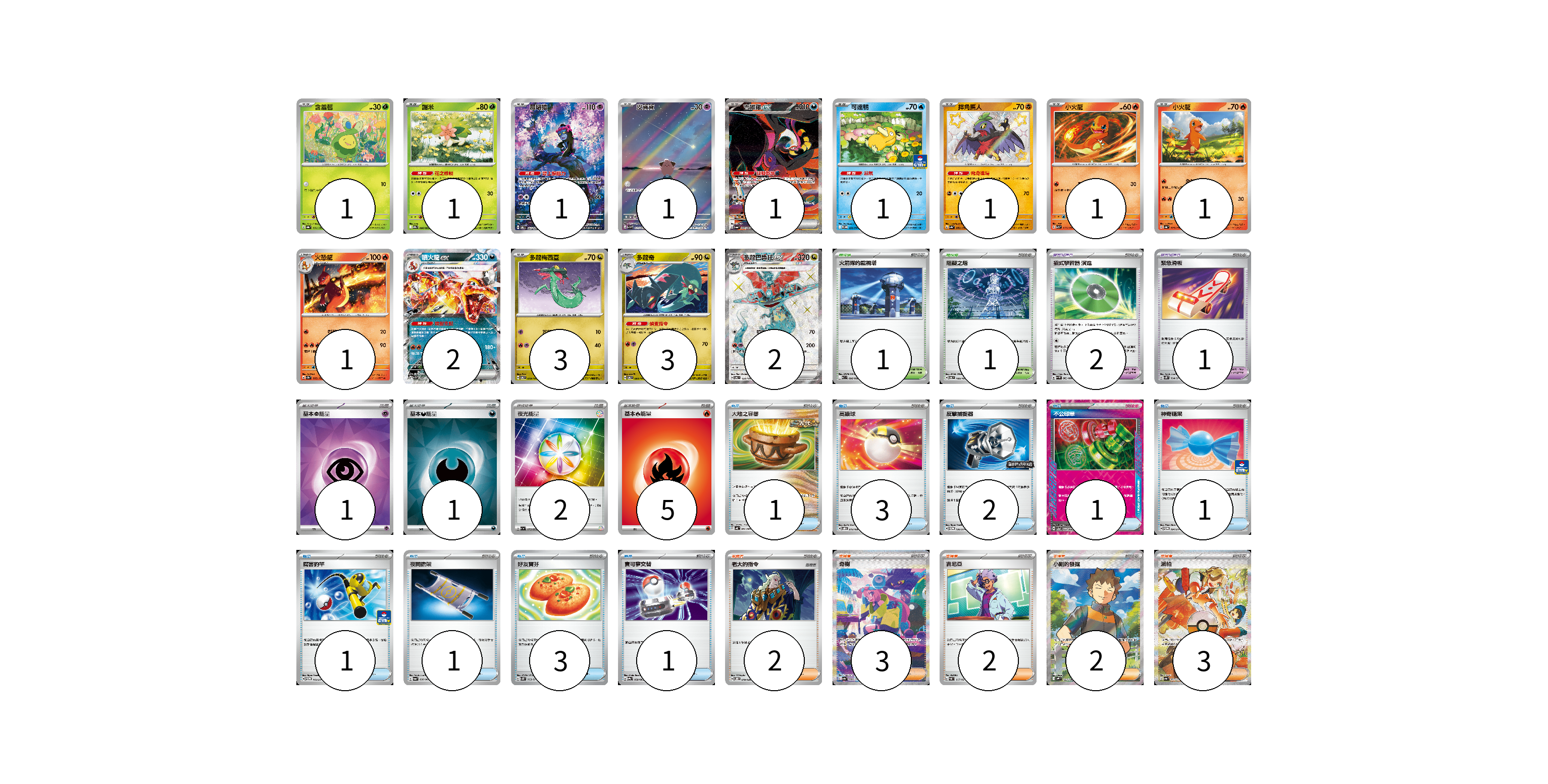 牌組構築方案 以此牌組為基礎新構築牌組 顯示卡面 顯示列表 寶可夢卡(20) 1 1 1 1 1 1 1 1 1 1 2 3 3 2 寶可夢道具(3) 2 1 物品卡(14) 1 3 2 1 1 1 1 3 1 支援者卡(12) 2 3 2 2 3 競技場卡(2) 1 1 能量卡(9) 1 1 2 5 寶可夢卡(20) 卡牌名稱 張數 卡牌名稱 張數 含羞苞 SV8a 001/187 01 謝米 SV9a 006/063 01 願增猿 SV6 107/101 01 皮寶寶 SV3 113/108 01 吉雉雞ex SV6a 089/064 01 可達鴨 SV-P 220/SV-P 01 摔角鷹人 SV4a 282/190 01 小火龍 SV3 012/108 01 小火龍 SV4a 025/190 01 火恐龍 SV2a 005/165 01 噴火龍ex SV3 066/108 02 多龍梅西亞 SV6 079/101 03 多龍奇 SV6 080/101 03 多龍巴魯托ex SV6 120/101 02 寶可夢道具(3) 卡牌名稱 張數 卡牌名稱 張數 招式學習器 演進 SV4M 063/066 02 緊急滑板 SV5K 064/071 01 物品卡(14) 卡牌名稱 張數 卡牌名稱 張數 大地之容器 SV4K 060/066 01 高級球 SVOD 012/020 03 反擊捕捉器 SV-P 136/SV-P 02 不公印章 SV5a 053/066 01 神奇糖果 SV-P 104/SV-P 01 厲害釣竿 SV-P 112/SV-P 01 夜間擔架 SV6a 056/064 01 好友寶芬 SV5K 063/071 03 寶可夢交替 SV9a 058/063 01 支援者卡(12) 卡牌名稱 張數 卡牌名稱 張數 老大的指令 SVOD 019/020 02 奇樹 SV4a 350/190 03 吉尼亞 SVAL 017/021 02 小剛的發掘 SV9 123/100 02 派帕 SV4a 353/190 03 競技場卡(2) 卡牌名稱 張數 卡牌名稱 張數 火箭隊的監視塔 SV10 096/098 01 阻礙之塔 SV6 100/101 01 能量卡(9) 卡牌名稱 張數 卡牌名稱 張數 基本【超】能量 SVOD PSY 01 基本【惡】能量 SVOM DAR 01 夜光能量 SV1a 073/073 02 基本【火】能量 SVB FIR 05 以此牌組為基礎新構築牌組 牌組編碼 zFfJmg-PeRhcF-fKlert copy 列印牌組單 牌組編碼已複製 分享至SNS