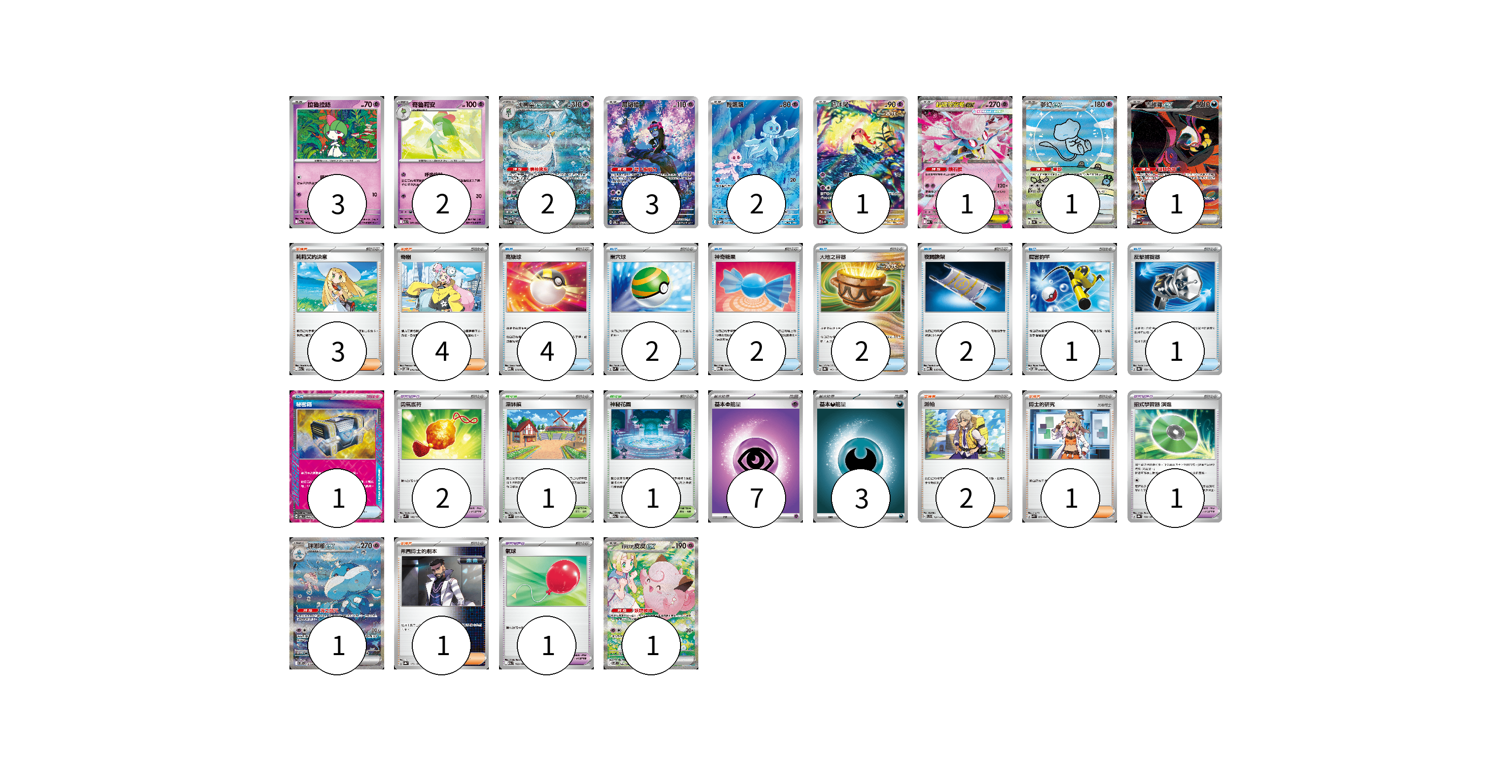 牌組構築方案 以此牌組為基礎新構築牌組 顯示卡面 顯示列表 寶可夢卡(18) 3 2 2 3 2 1 1 1 1 1 1 寶可夢道具(4) 2 1 1 物品卡(15) 4 2 2 2 2 1 1 1 支援者卡(11) 3 4 2 1 1 競技場卡(2) 1 1 能量卡(10) 7 3 寶可夢卡(18) 卡牌名稱 張數 卡牌名稱 張數 拉魯拉絲 M2a 069/193 03 奇魯莉安 M1S 041/063 02 沙奈朵ex SV4a 348/190 02 願增猿 SV6 107/101 03 輕飄飄 SV11W 124/086 02 吼叫尾 SV4K 071/066 01 超級蒂安希ex MBD 006/022 01 夢幻ex SV4a 347/190 01 吉雉雞ex SV6a 089/064 01 胖嘟嘟ex SV11W 170/086 01 莉莉艾的皮皮ex SV9 126/100 01 寶可夢道具(4) 卡牌名稱 張數 卡牌名稱 張數 勇氣護符 SVM 142/175 02 招式學習器 演進 SV8a 160/187 01 氣球 M2a 165/193 01 物品卡(15) 卡牌名稱 張數 卡牌名稱 張數 高級球 MBD 014/022 04 巢穴球 SVM 133/175 02 神奇糖果 MBG 013/022 02 大地之容器 SV8a 143/187 02 夜間擔架 MBD 016/022 02 厲害釣竿 SVOD 010/020 01 反擊捕捉器 SV8a 139/187 01 秘密箱 SV6 092/101 01 支援者卡(11) 卡牌名稱 張數 卡牌名稱 張數 莉莉艾的決意 M2a 175/193 03 奇樹 SVOD 016/020 04 派帕 SVD 137/139 02 博士的研究 SVK 032/042 01 弗圖博士的劇本 SV8a 175/187 01 競技場卡(2) 卡牌名稱 張數 卡牌名稱 張數 深缽鎮 SVK 039/042 01 神秘花園 M2a 187/193 01 能量卡(10) 卡牌名稱 張數 卡牌名稱 張數 基本【超】能量 MBD PSY 07 基本【惡】能量 MBG DAR 03 以此牌組為基礎新構築牌組 牌組編碼 zGDTUs-mXCfxH-PaXVRN copy 列印牌組單 牌組編碼已複製 分享至SNS