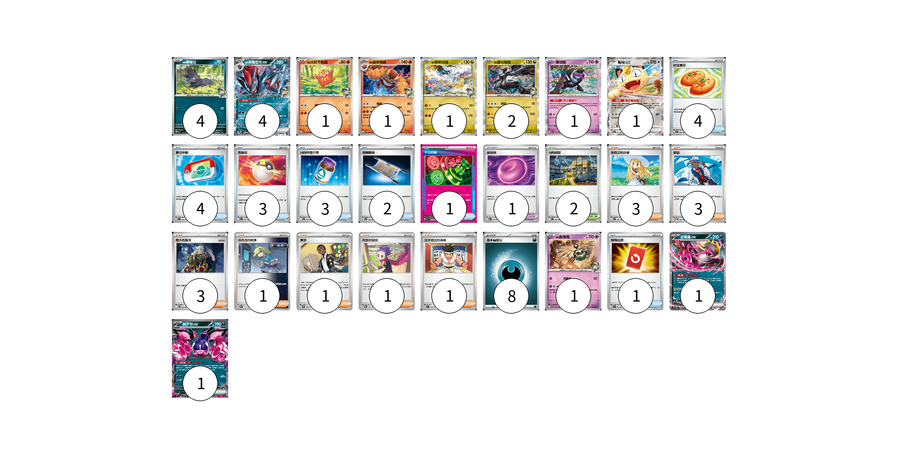 牌組構築方案 以此牌組為基礎新構築牌組 顯示卡面 顯示列表 寶可夢卡(18) 4 4 1 1 1 2 1 1 1 1 1 寶可夢道具(1) 1 物品卡(18) 4 4 3 3 2 1 1 支援者卡(13) 3 3 3 1 1 1 1 競技場卡(2) 2 能量卡(8) 8 寶可夢卡(18) 卡牌名稱 張數 卡牌名稱 張數 N的索羅亞 M2a 111/193 04 N的索羅亞克ex SV9 061/100 04 N的火紅不倒翁 SV9 015/100 01 N的達摩狒狒 SV9 016/100 01 N的萊希拉姆 M2a 128/193 01 N的捷克羅姆 M2a 129/193 02 願增猿 SV8a 075/187 01 喵喵ex M3 061/080 01 N的象徵鳥 SV9 040/100 01 吉雉雞ex SVOM 009/021 01 桃歹郎ex MBG 009/022 01 寶可夢道具(1) 卡牌名稱 張數 卡牌名稱 張數 鎖鏈糬 SV6a 057/064 01 物品卡(18) 卡牌名稱 張數 卡牌名稱 張數 好友寶芬 MC 648/742 04 寶可平板 MC 662/742 04 高級球 MC 651/742 03 N的PP提升劑 M2a 146/193 03 夜間擔架 M2a 159/193 02 不公印章 MBD 011/022 01 特殊紅牌 M4 072/083 01 支援者卡(13) 卡牌名稱 張數 卡牌名稱 張數 莉莉艾的決意 M2a 175/193 03 席藍 SV8 102/106 03 老大的指令 MBD 020/022 03 暗碼迷的解讀 SV8a 165/187 01 賽吉 SV5M 068/071 01 阿杏的秘招 SV8a 166/187 01 空手道王的演練 SVM 143/175 01 競技場卡(2) 卡牌名稱 張數 卡牌名稱 張數 N的城堡 M2a 181/193 02 能量卡(8) 卡牌名稱 張數 卡牌名稱 張數 基本【惡】能量 MC DAR 08 以此牌組為基礎新構築牌組 牌組編碼 zHHLuP-wwGmUL-Ersolu copy 列印牌組單 牌組編碼已複製 分享至SNS